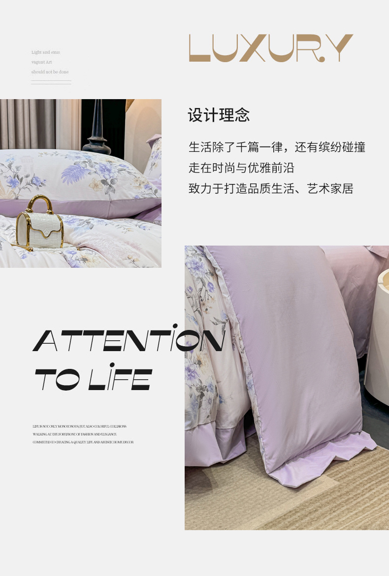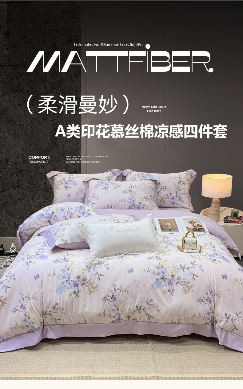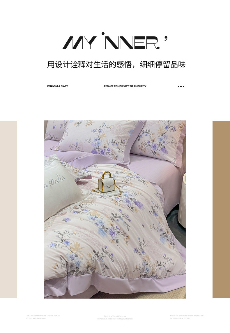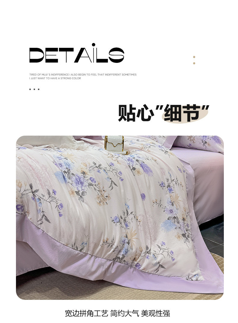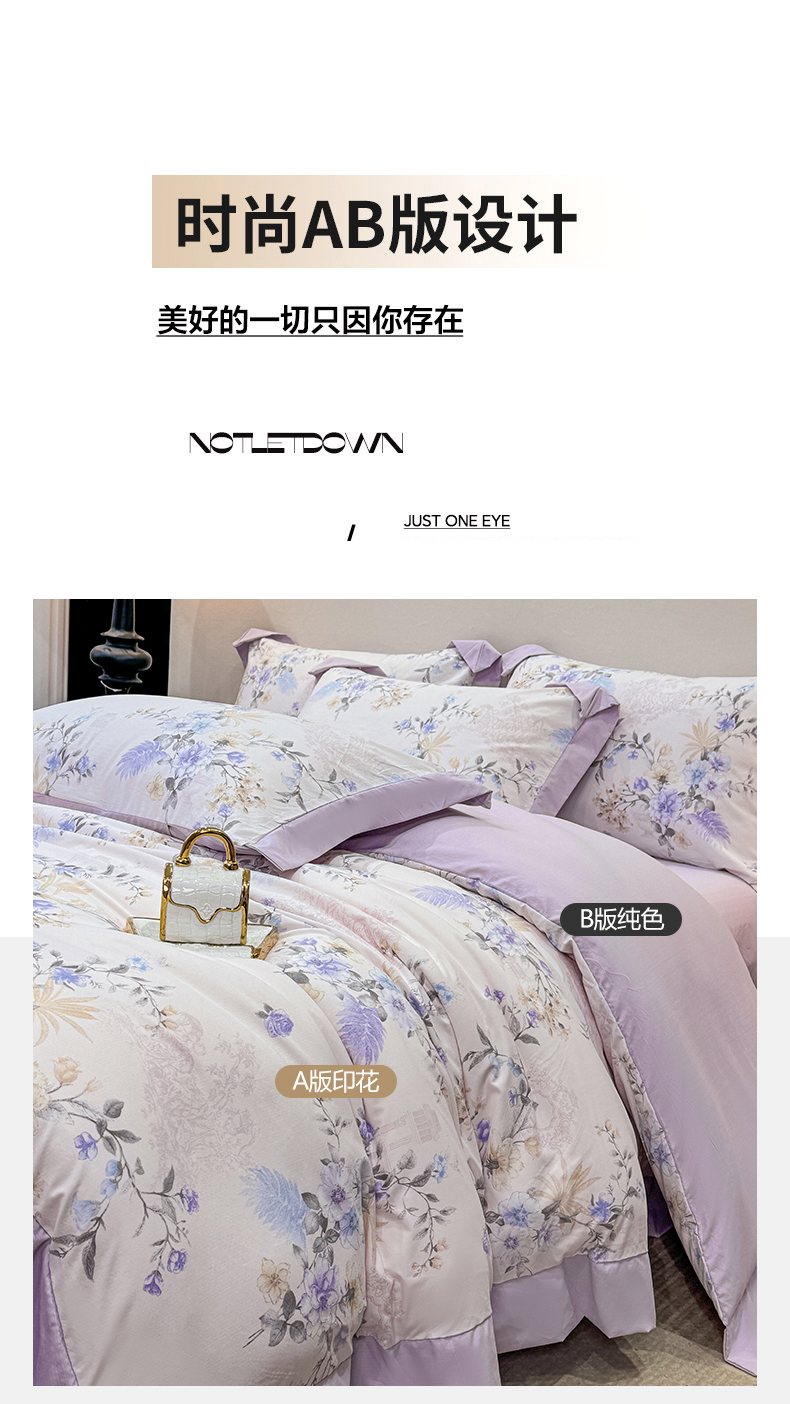 当前位置: 91家纺网 > 商品网购 > 床品套件 > 四件套 > 其它四件套 > 慕木家纺 2026新款A类印花拼角工艺慕斯棉四件套系列(抽空压缩可供跨境)提供买家秀 莫兰迪+浅紫