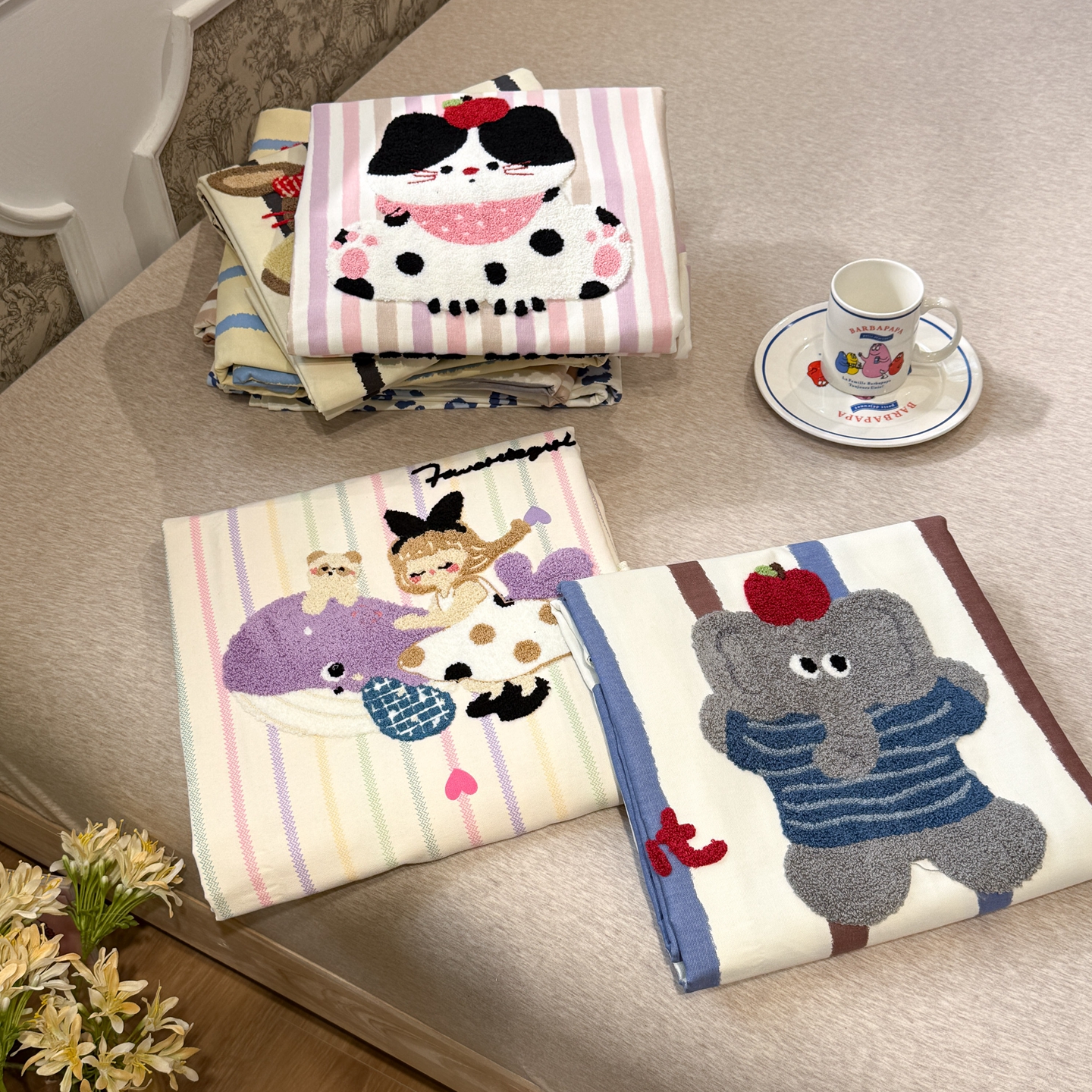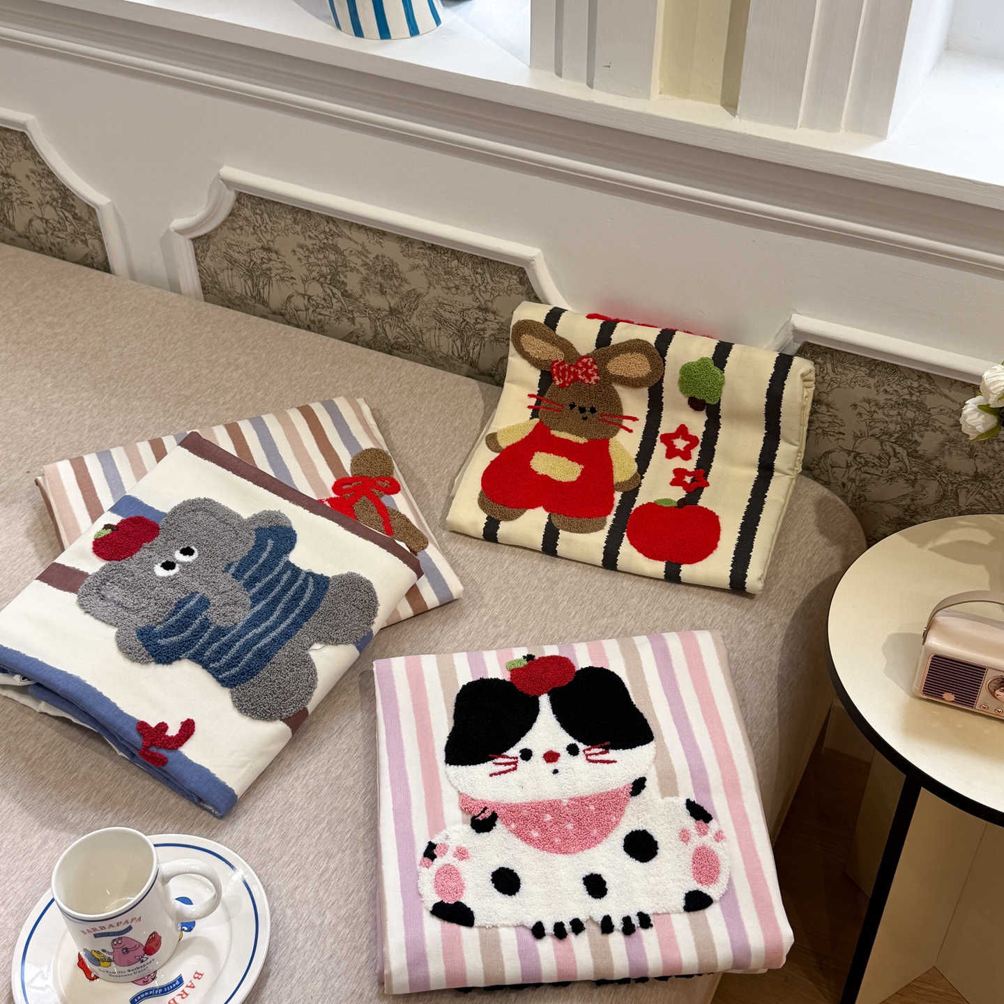(总)觅糖家纺 2026新款大版卡通毛巾绣老粗布凉席席子系列,豹纹猫咪,笔记小熊,波点腊肠狗,调皮小象,好梦少女,蓝豹西高地,奶牛小猫,苹果小兔,生日聚会,组合图