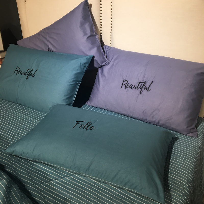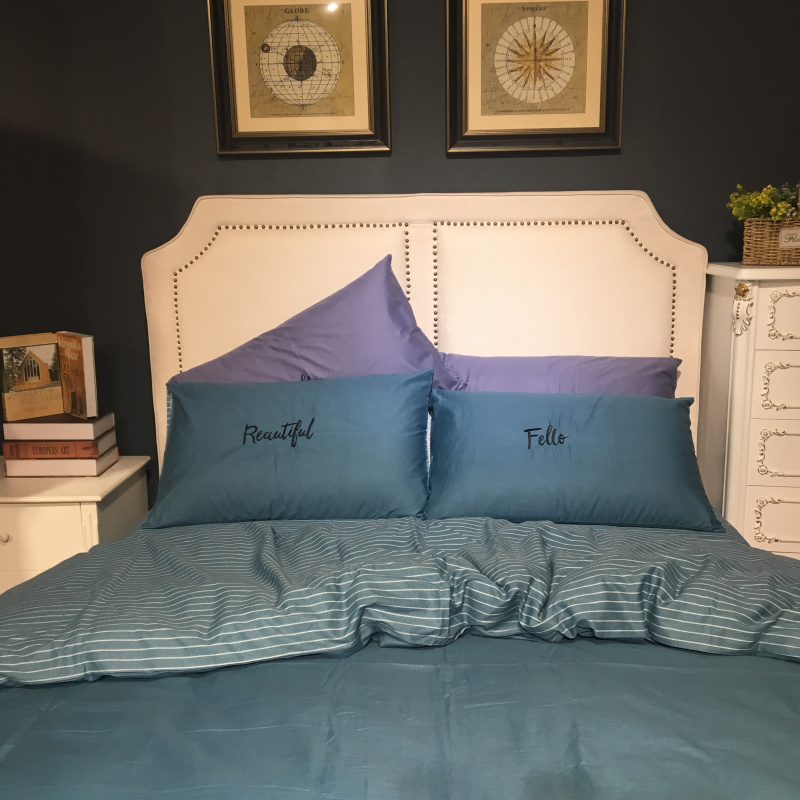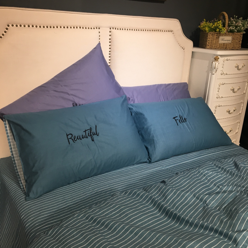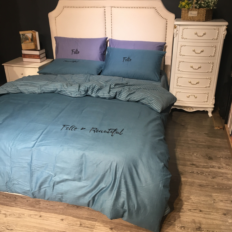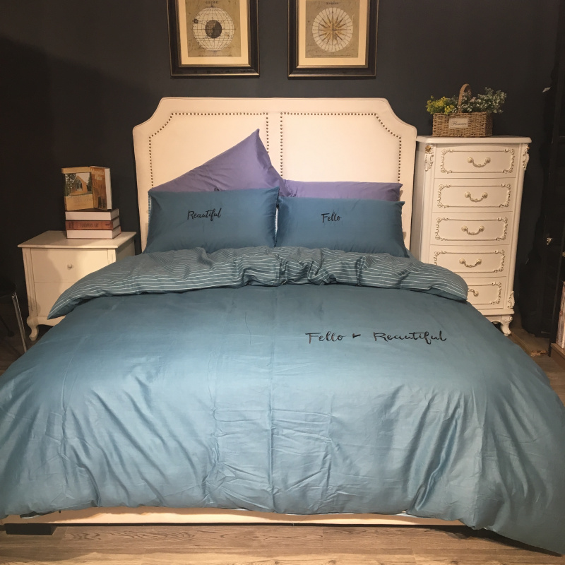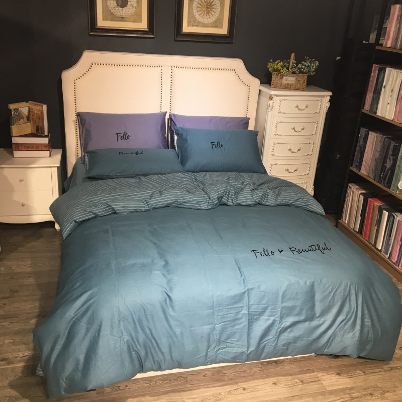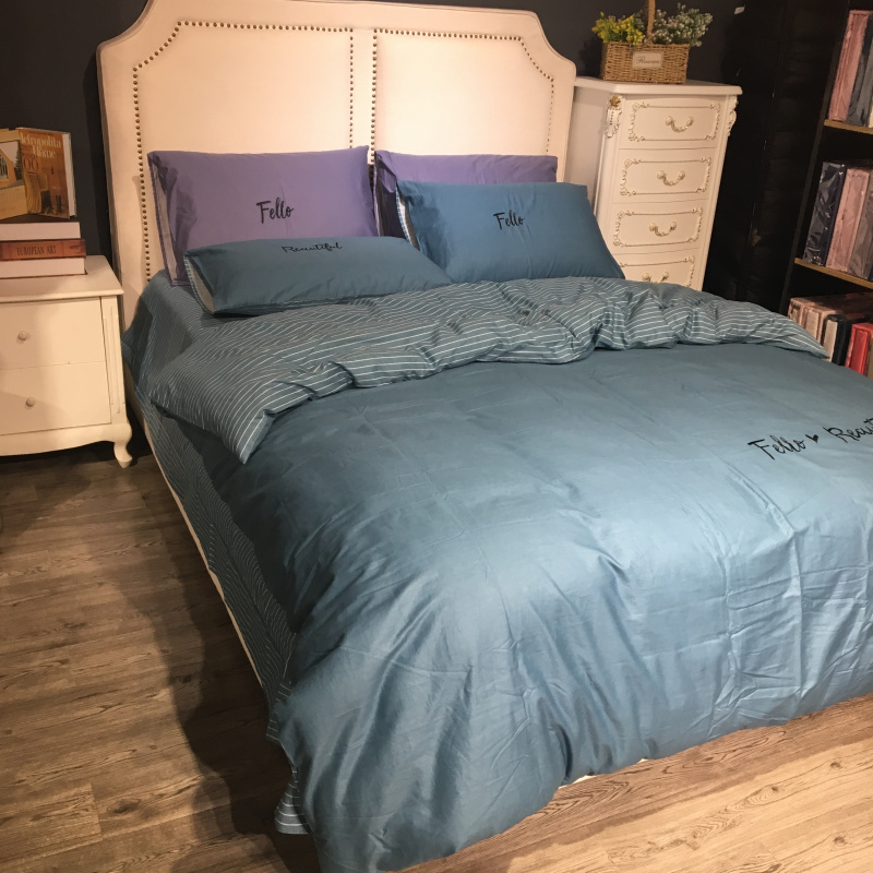 商品名称:玖玖爱 2019新款纯色绣花条格两用四件套 简约记忆-蓝灰
