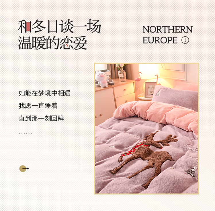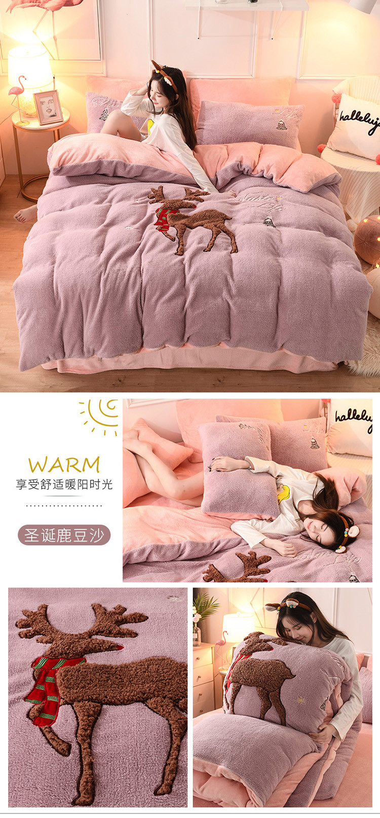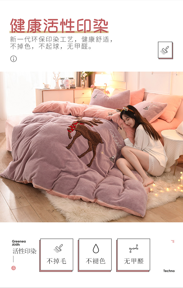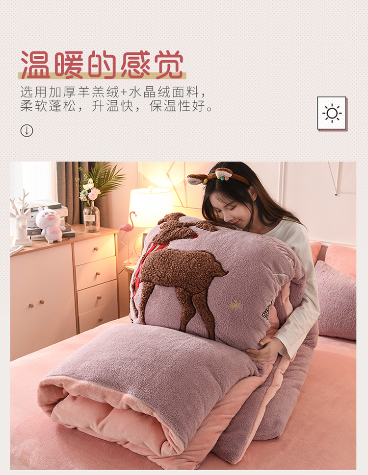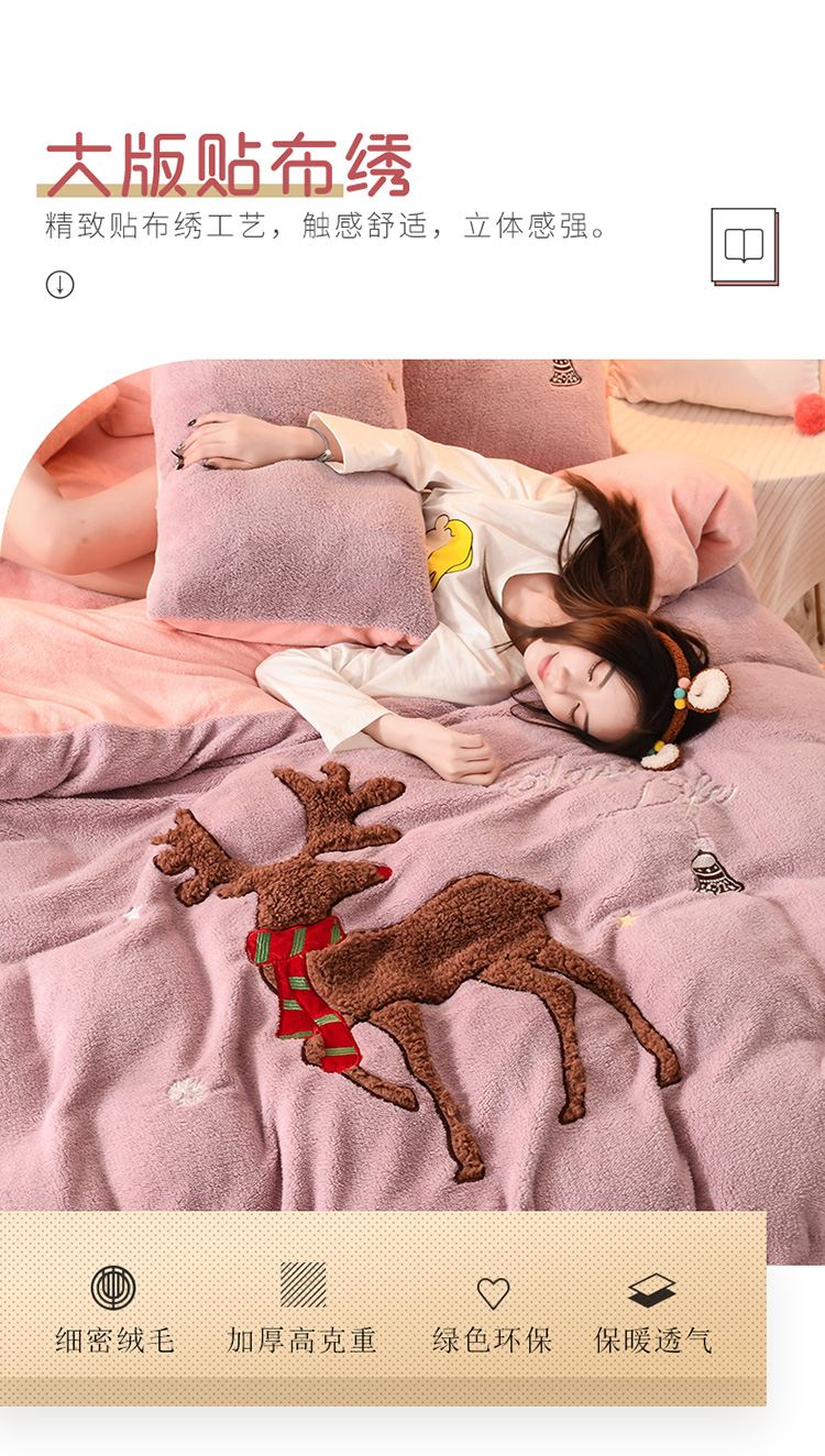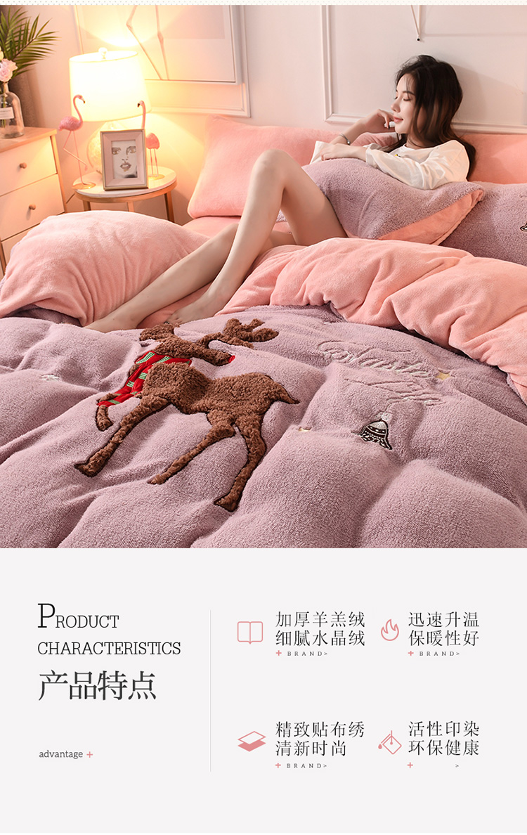 商品名称:朗莎家纺 2019新款大版贴布绣羊羔绒保暖四件套 圣诞鹿豆沙