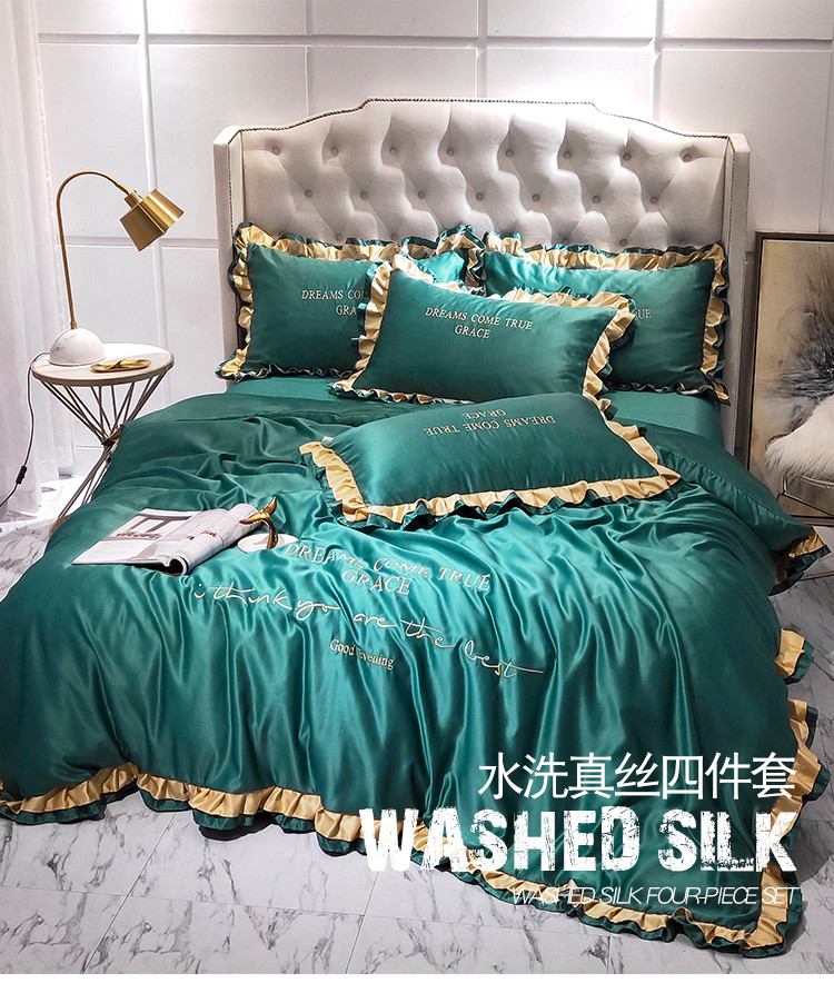 米奈 2020新品水洗真丝四件套诺曼系列 墨绿