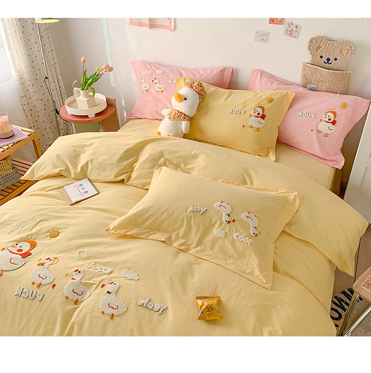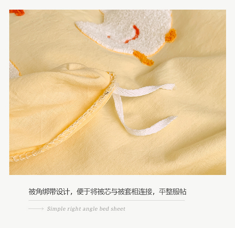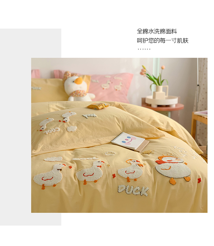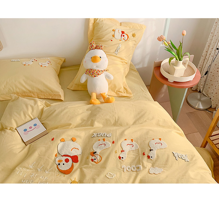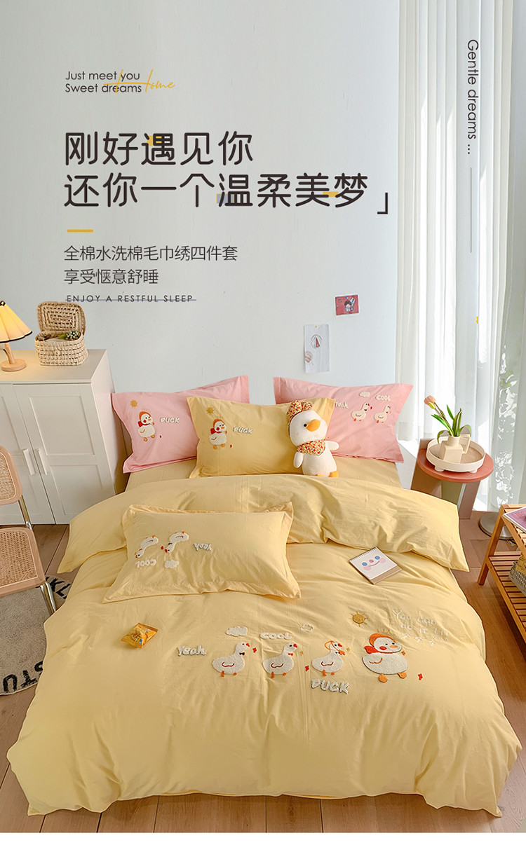 蜜柚2021全棉水洗棉卡通毛巾绣小清新床单四件套 可爱鸭黄