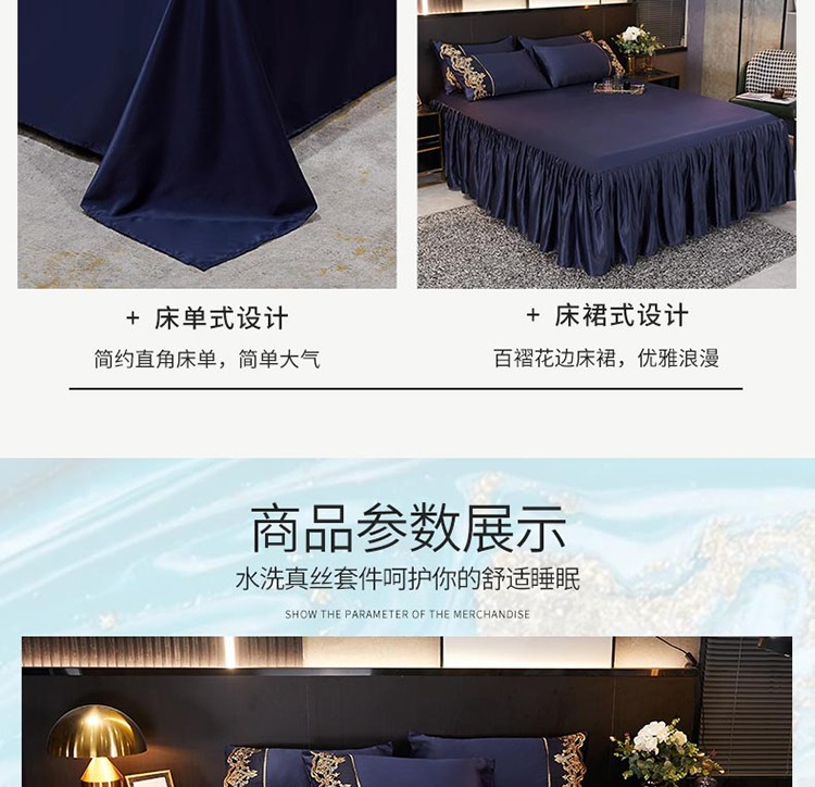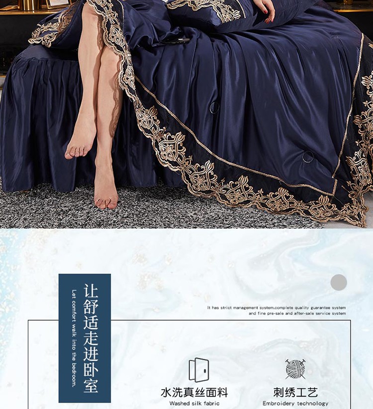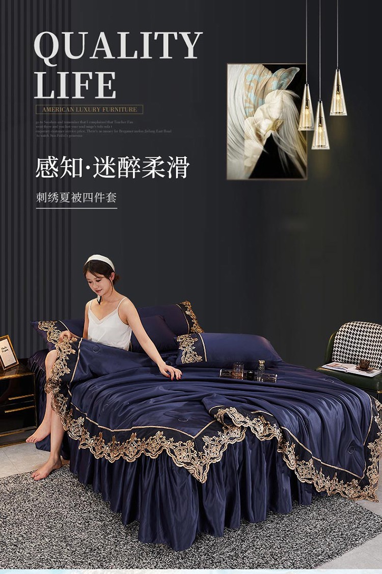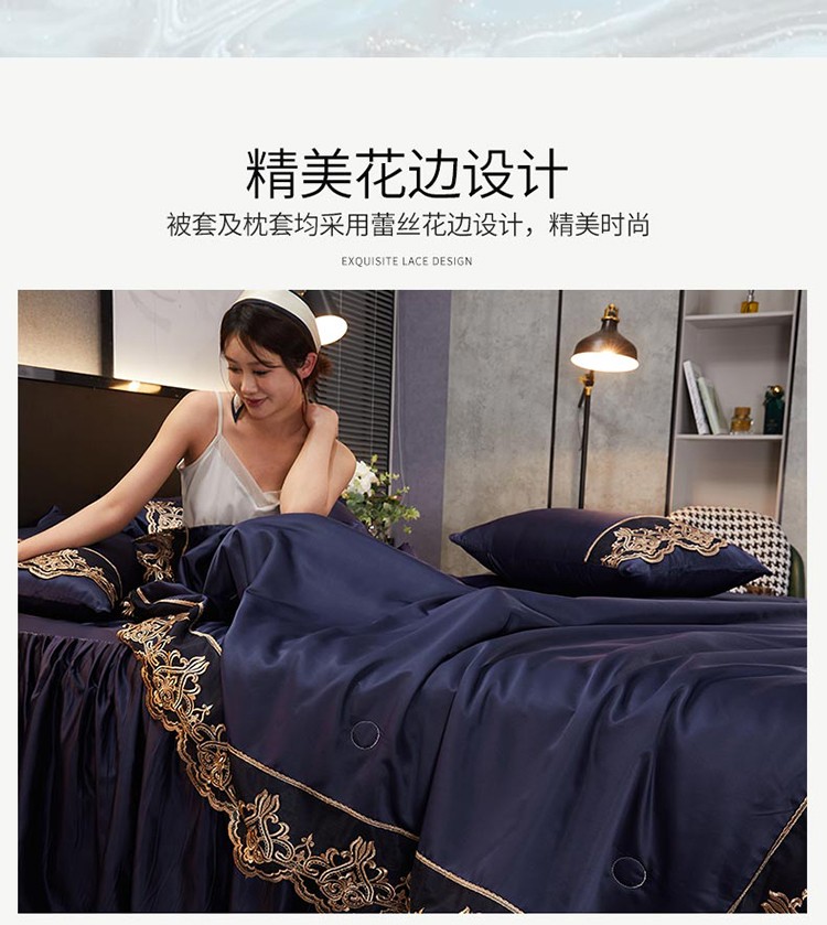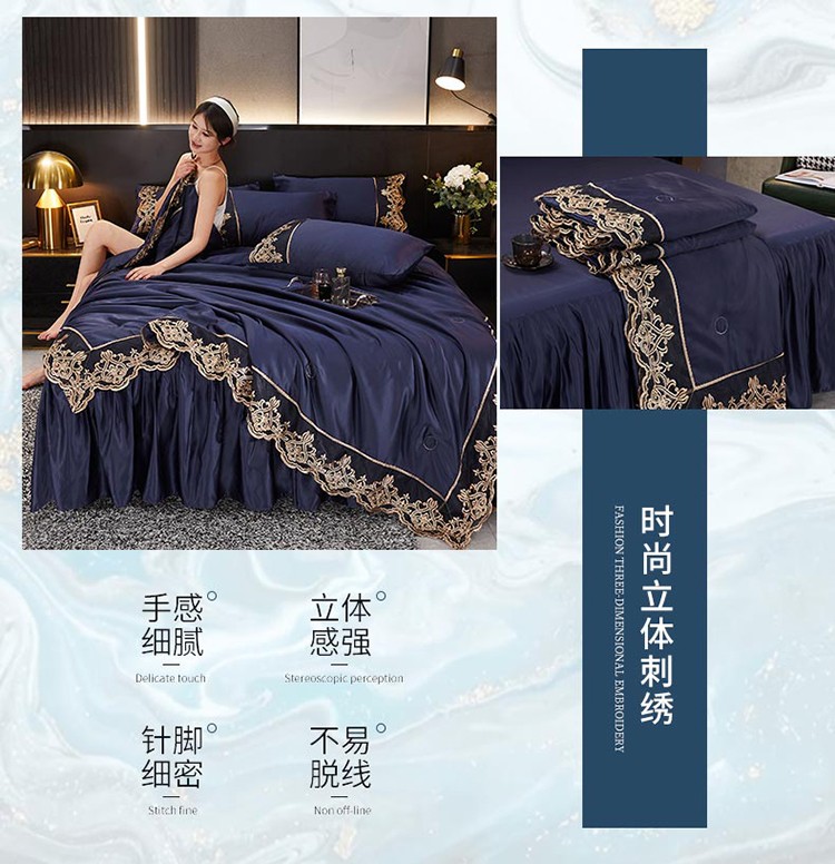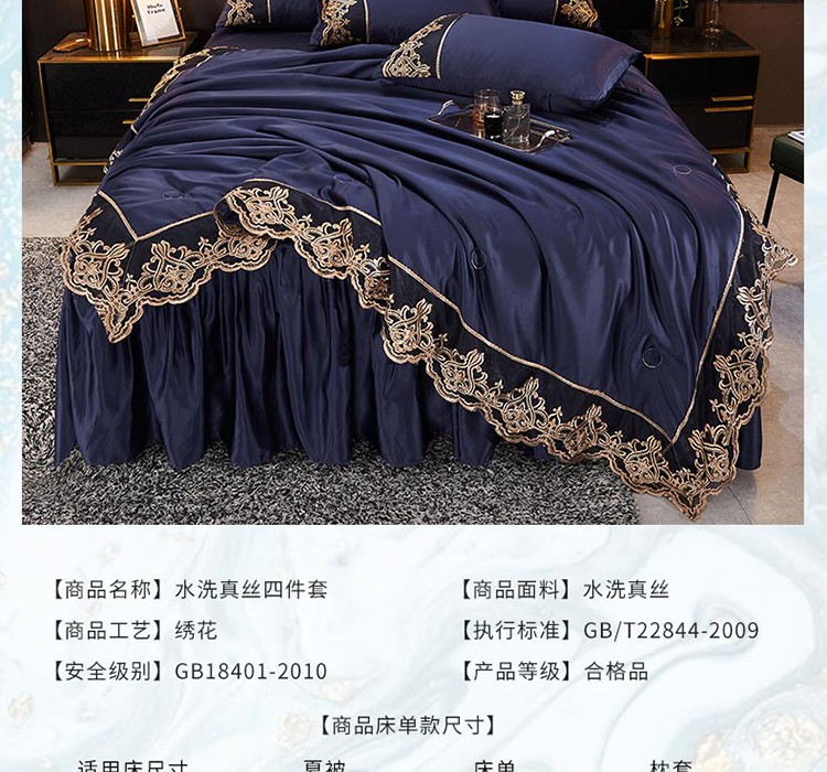 当前位置: 91家纺网 > 商品网购 > 床品套件 > 四件套 > 铠畅 丽莎新款水洗真丝夏被空调被四件套春夏蕾丝刺绣床裙款床单款天丝夏凉被套件 深蓝