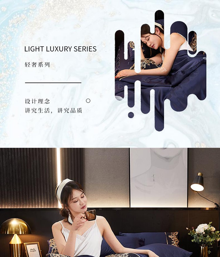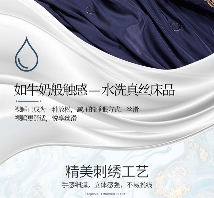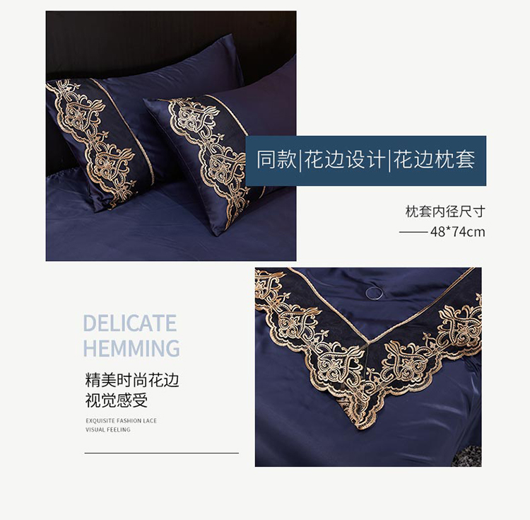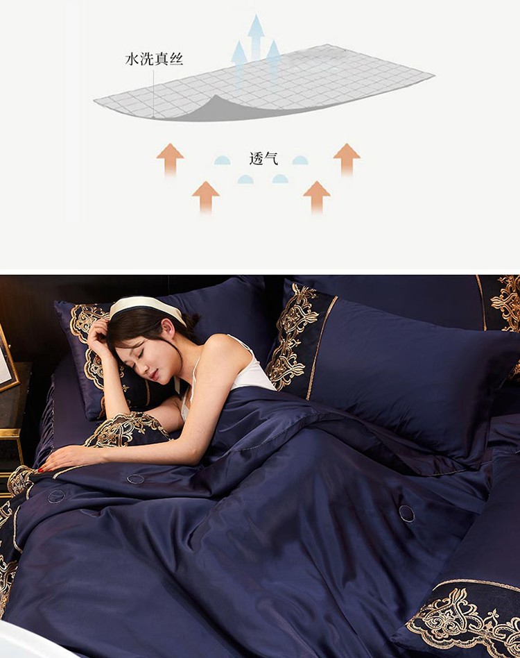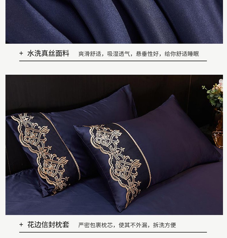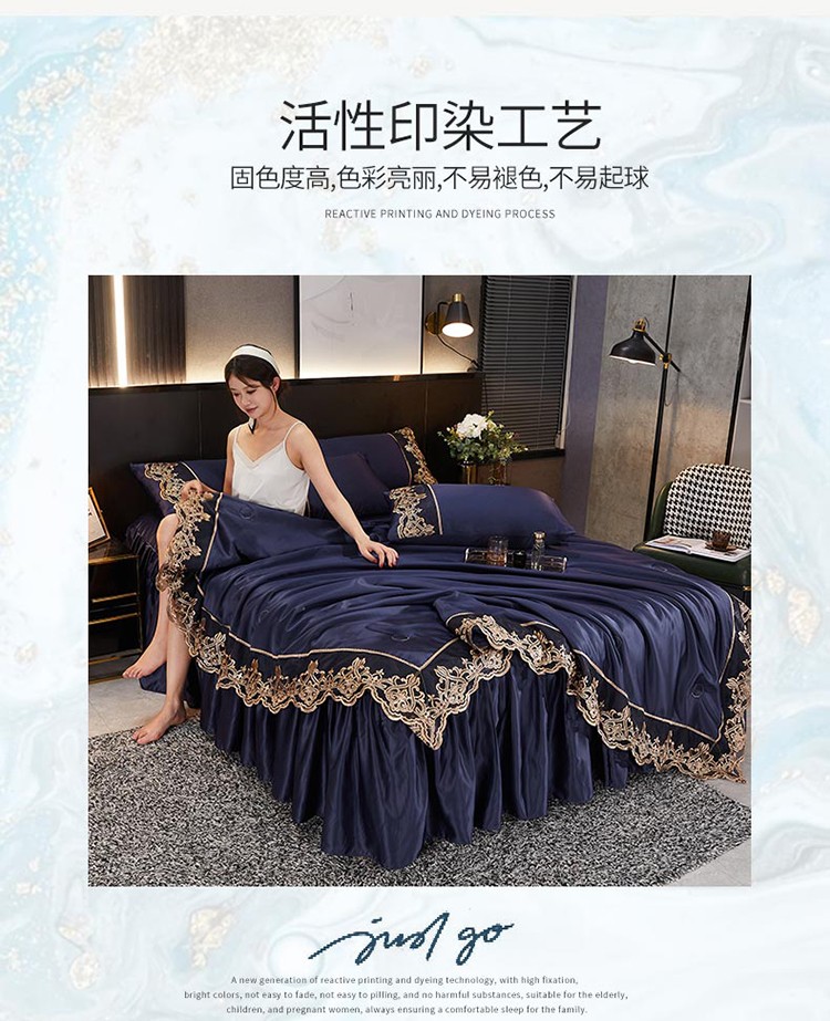当前位置: 91家纺网 > 商品网购 > 床品套件 > 四件套 > 铠畅 丽莎新款水洗真丝夏被空调被四件套春夏蕾丝刺绣床裙款床单款天丝夏凉被套件 深蓝