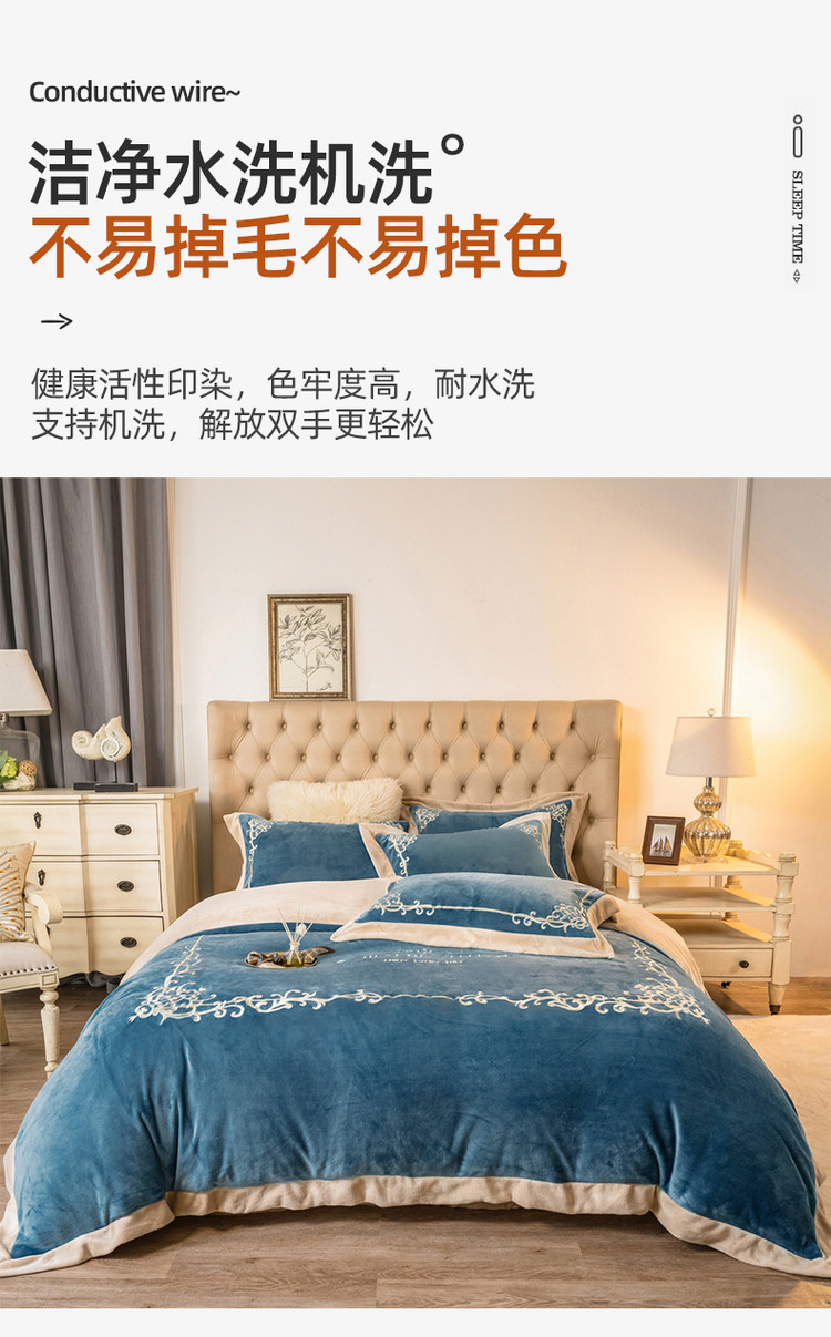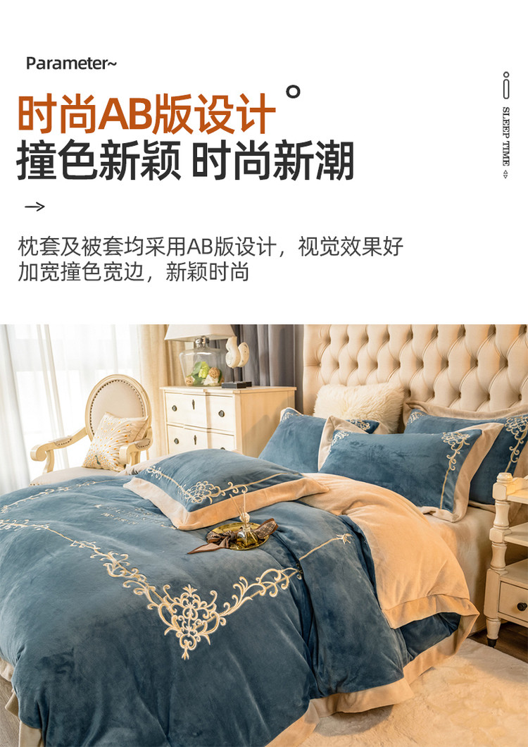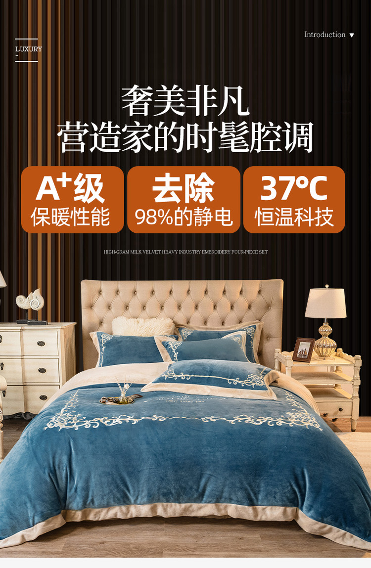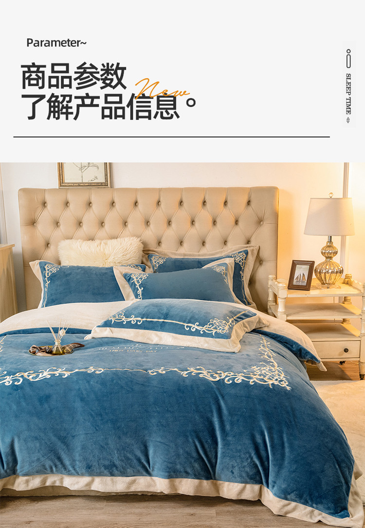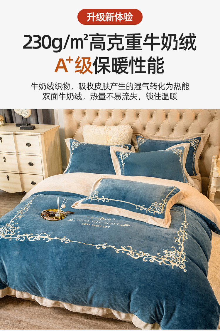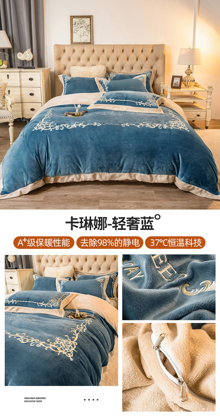 商品名称:露梦 新款210克轻奢牛奶绒抗静电四件套 卡琳娜-轻奢蓝