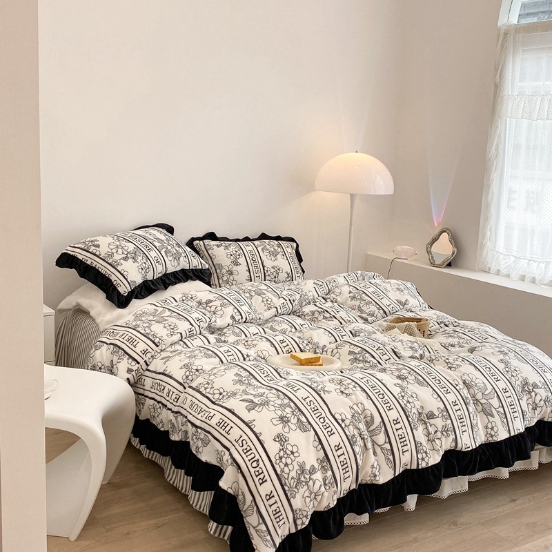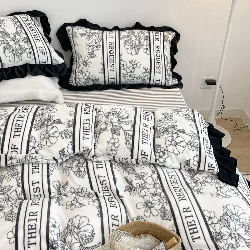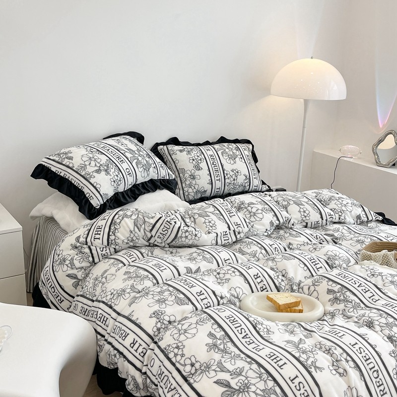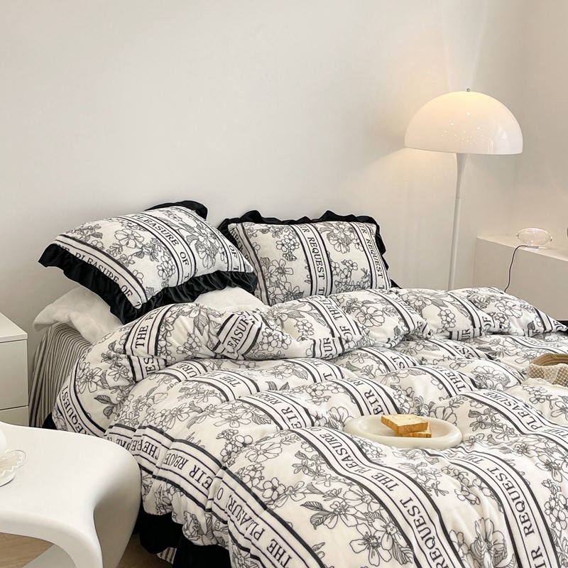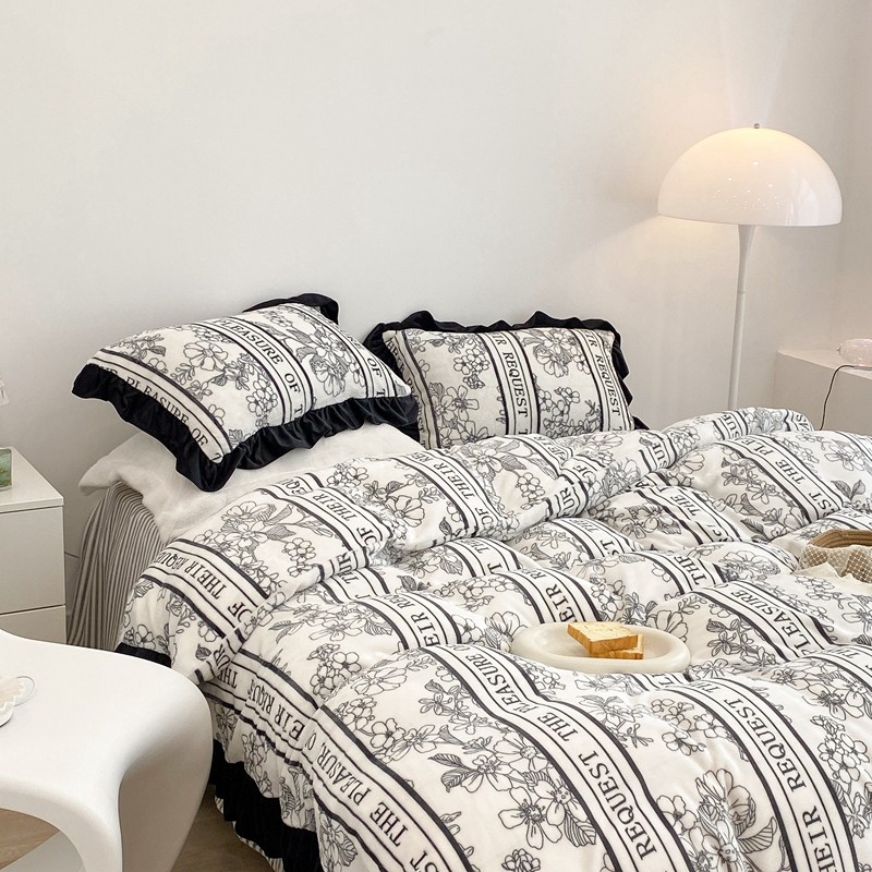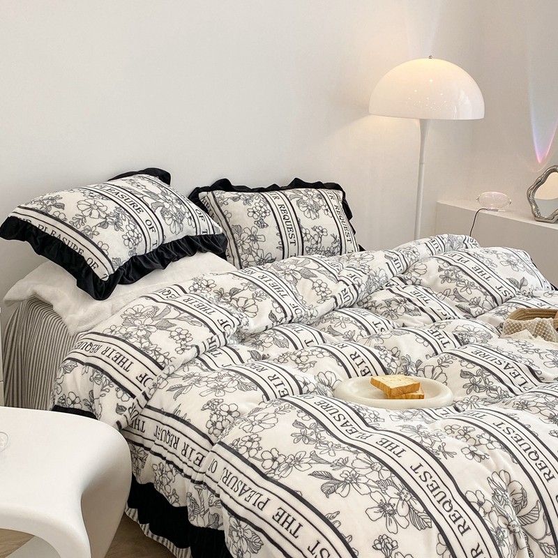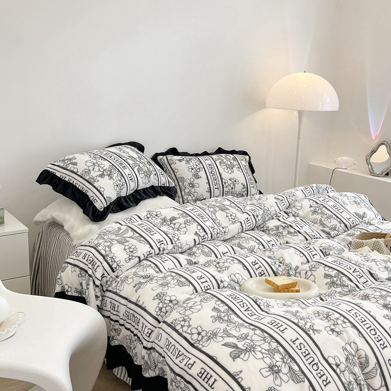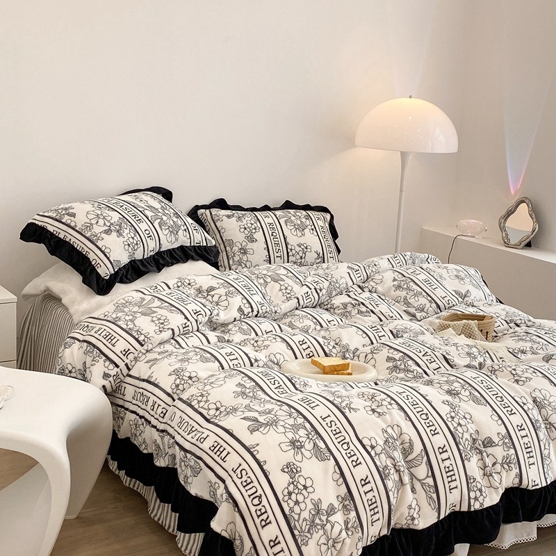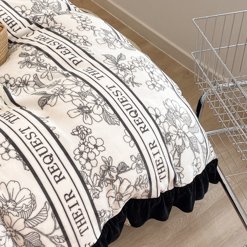 昔可家纺 2021新款黑色花边牛奶绒四件套 优雅生活