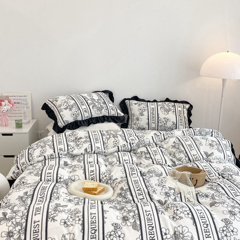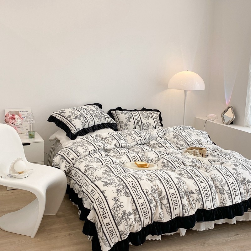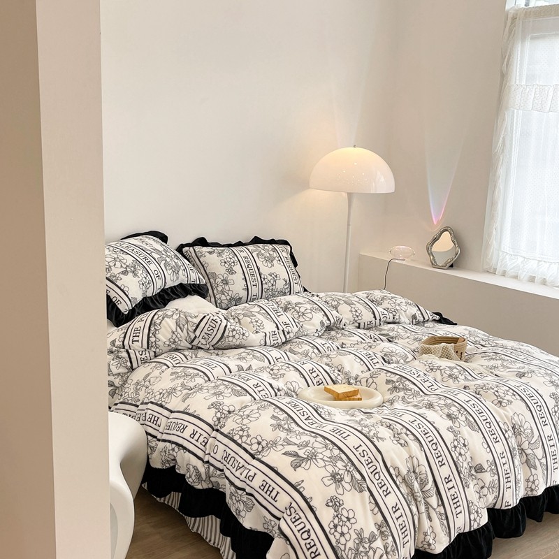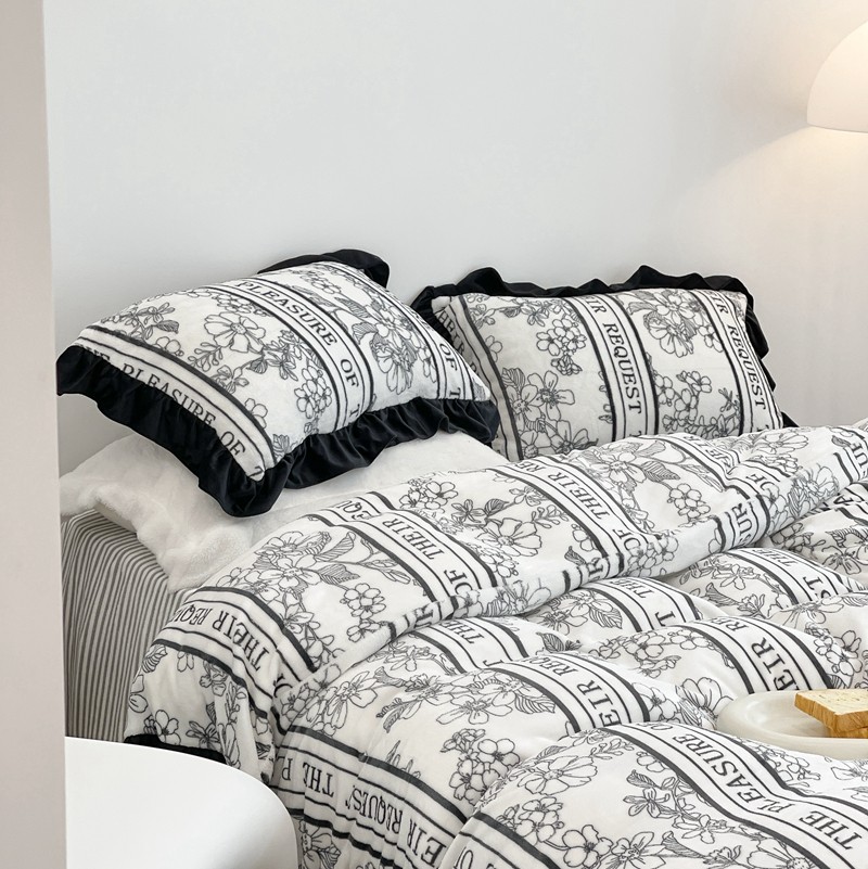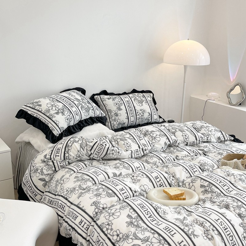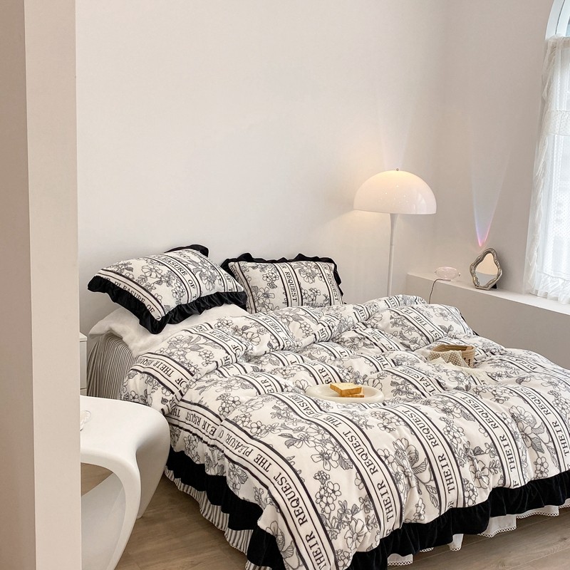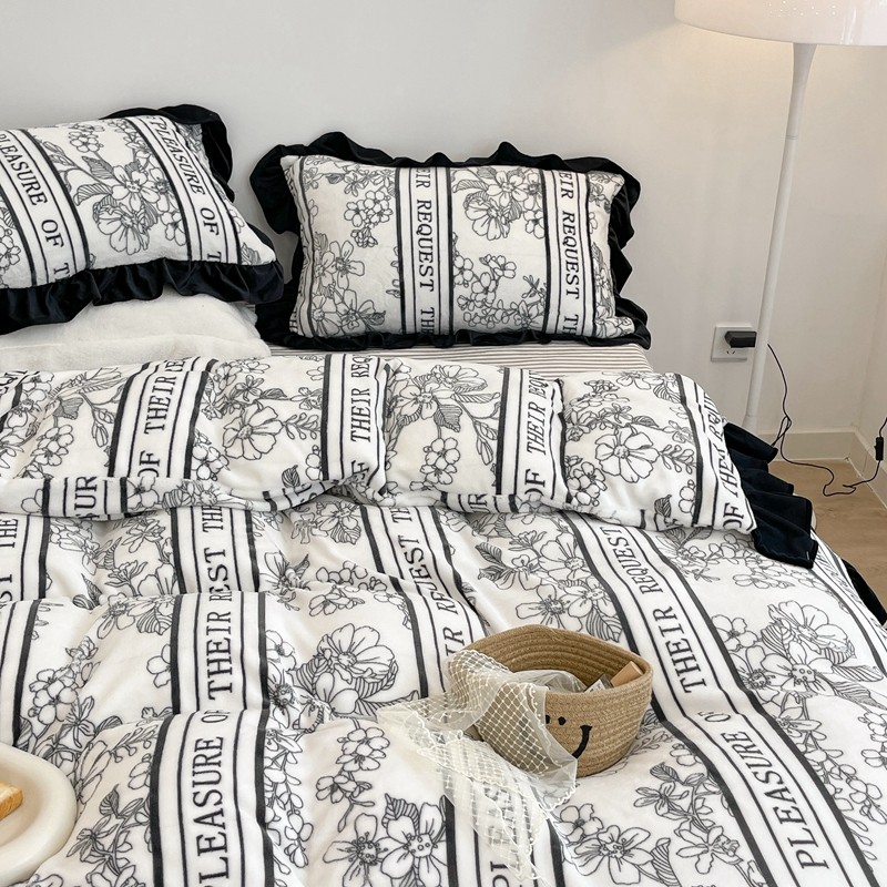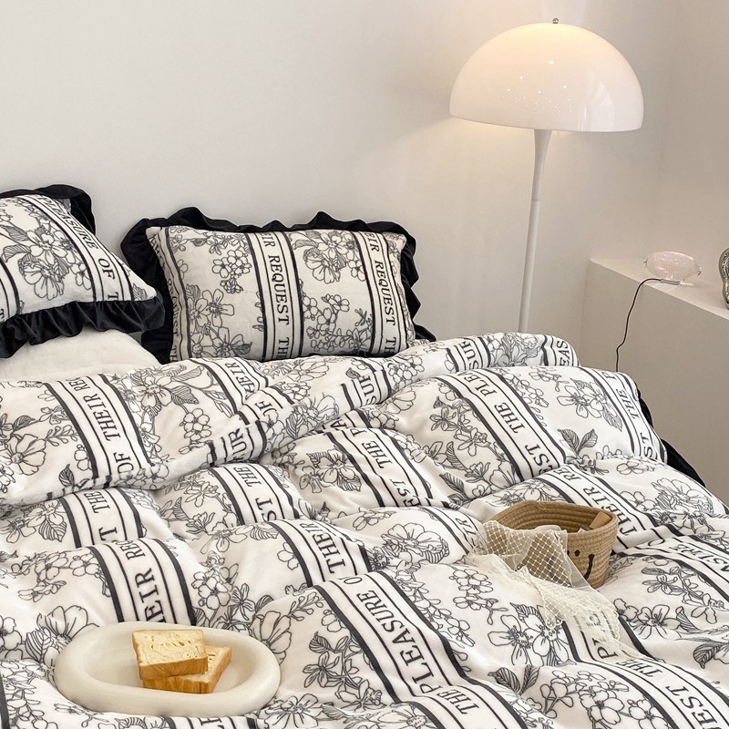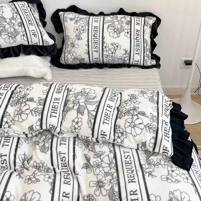 昔可家纺 2021新款黑色花边牛奶绒四件套 优雅生活