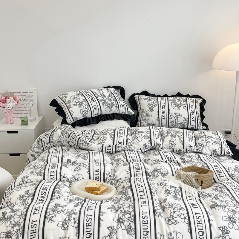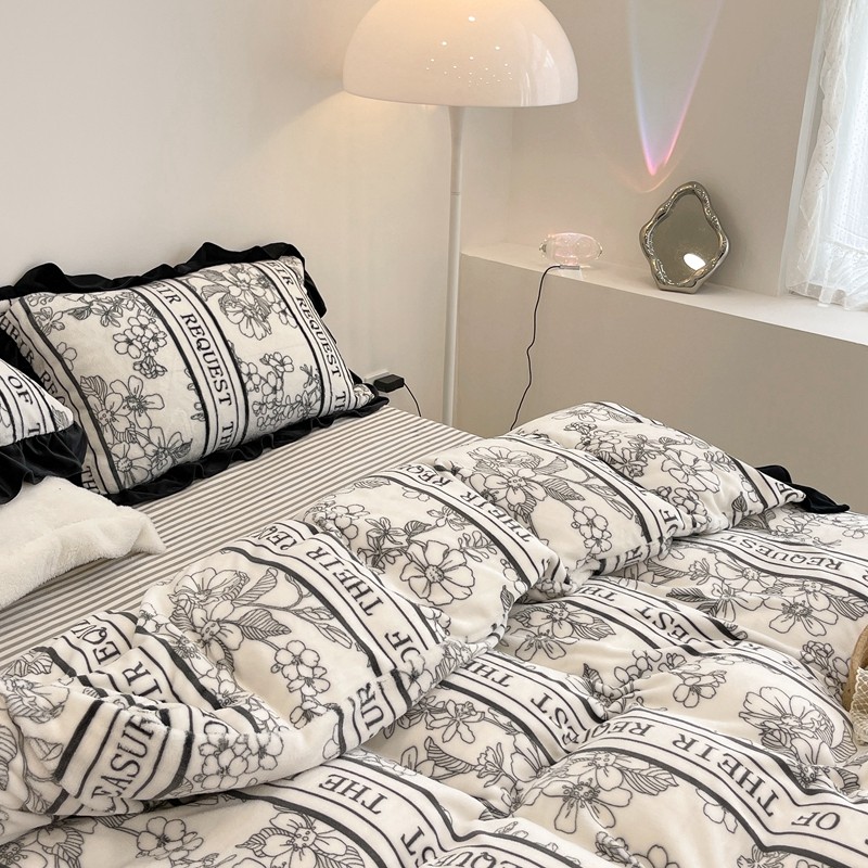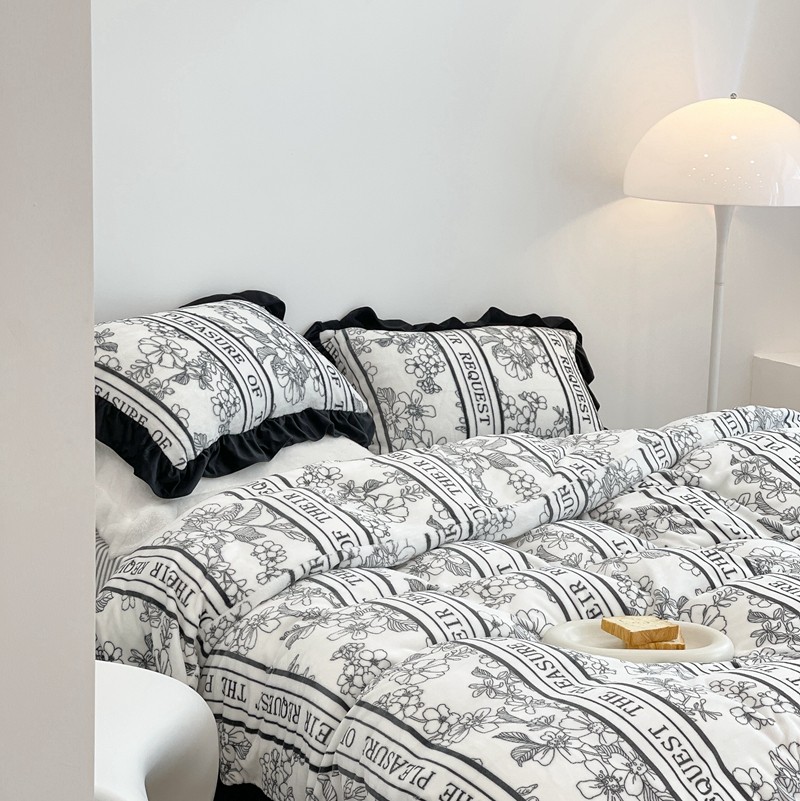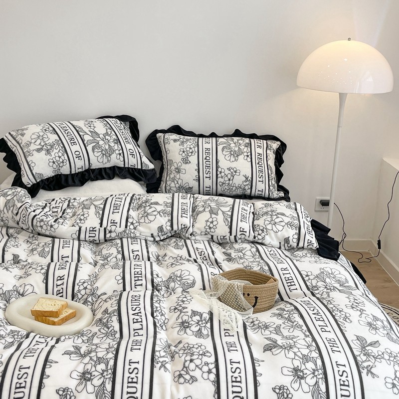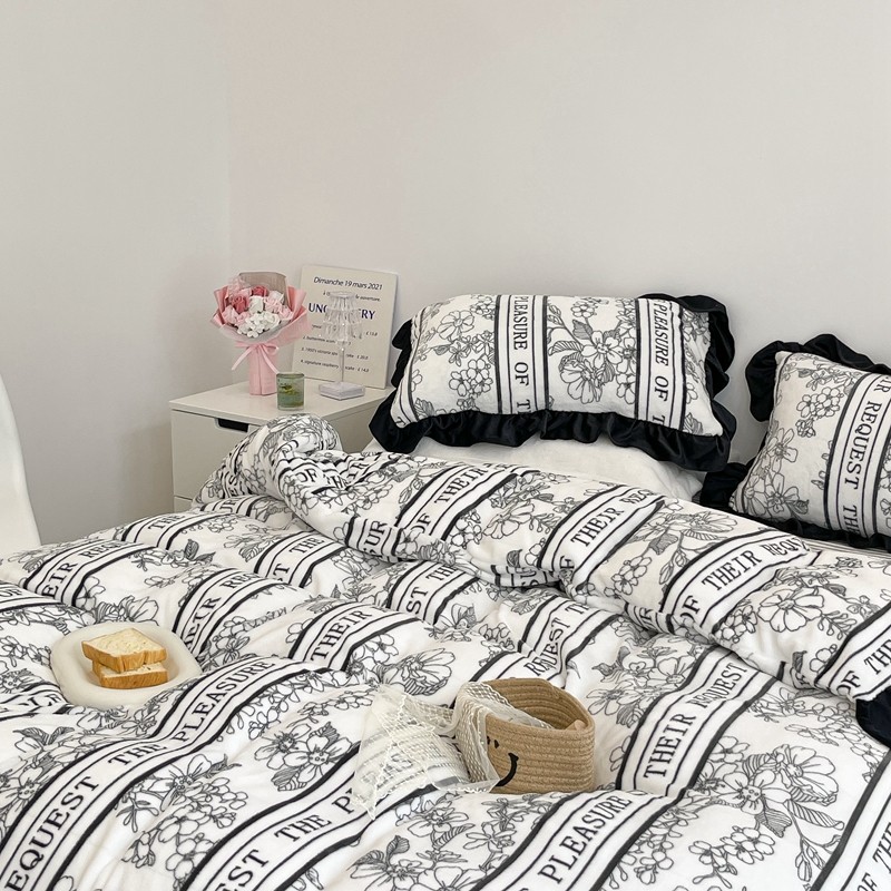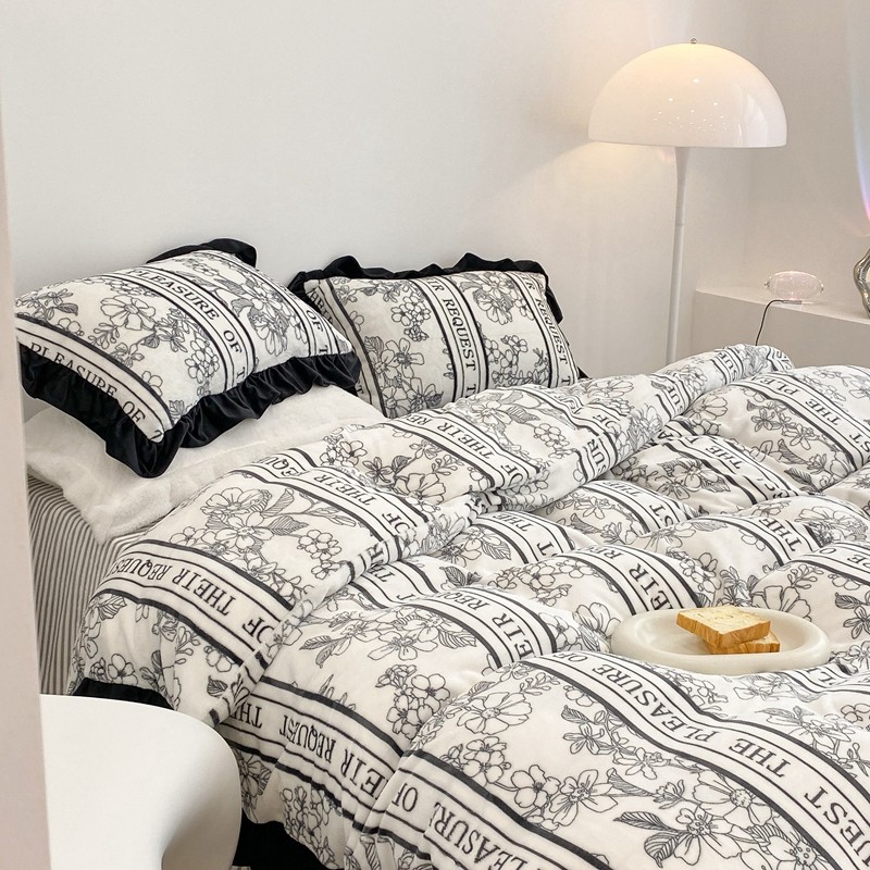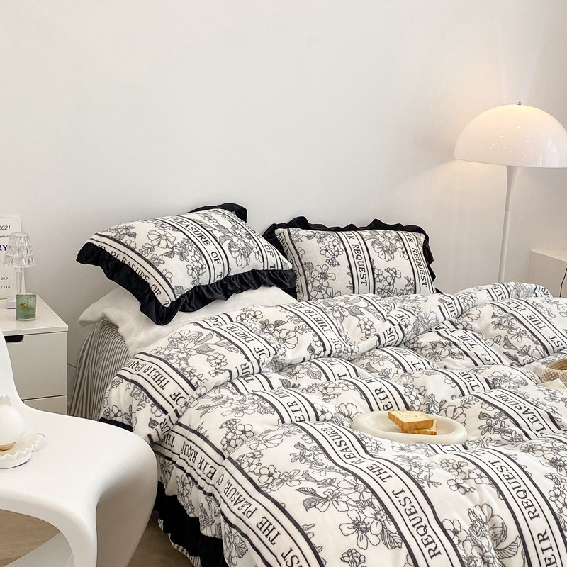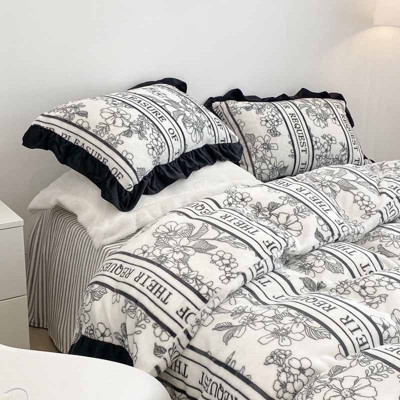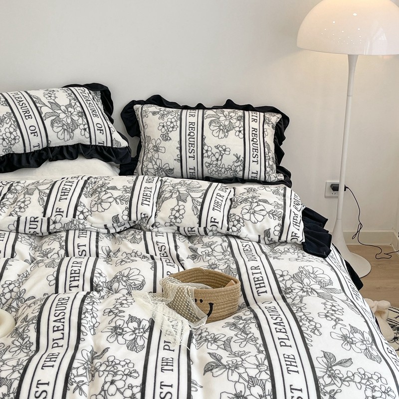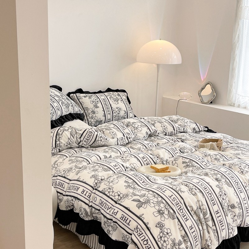 昔可家纺 2021新款黑色花边牛奶绒四件套 优雅生活