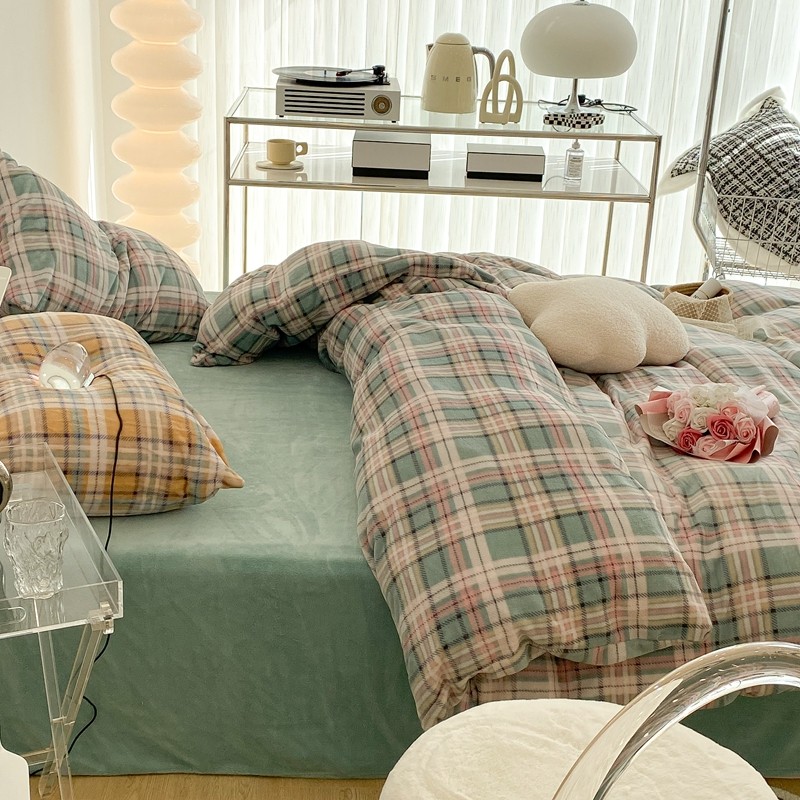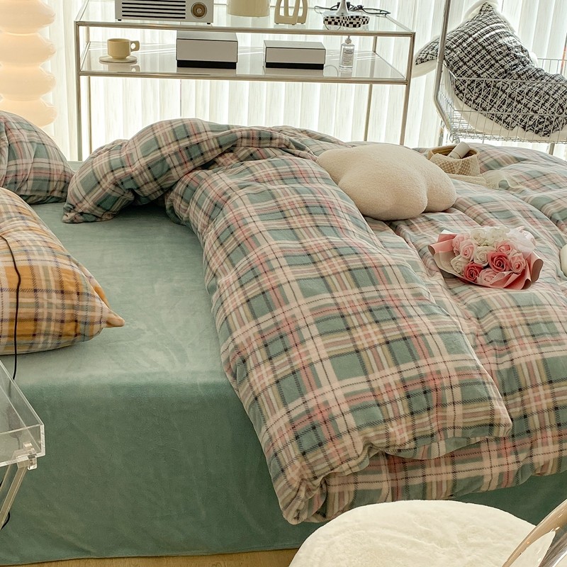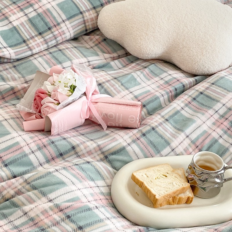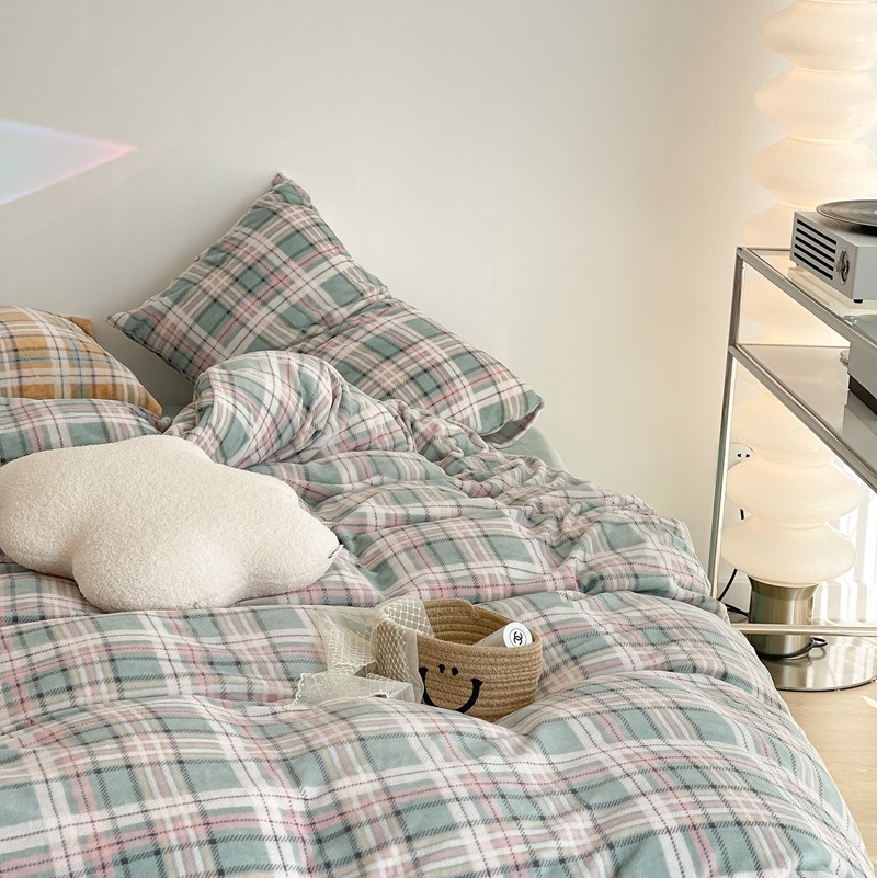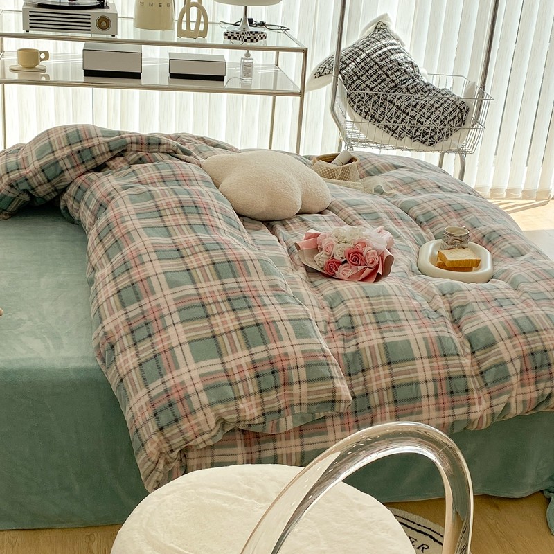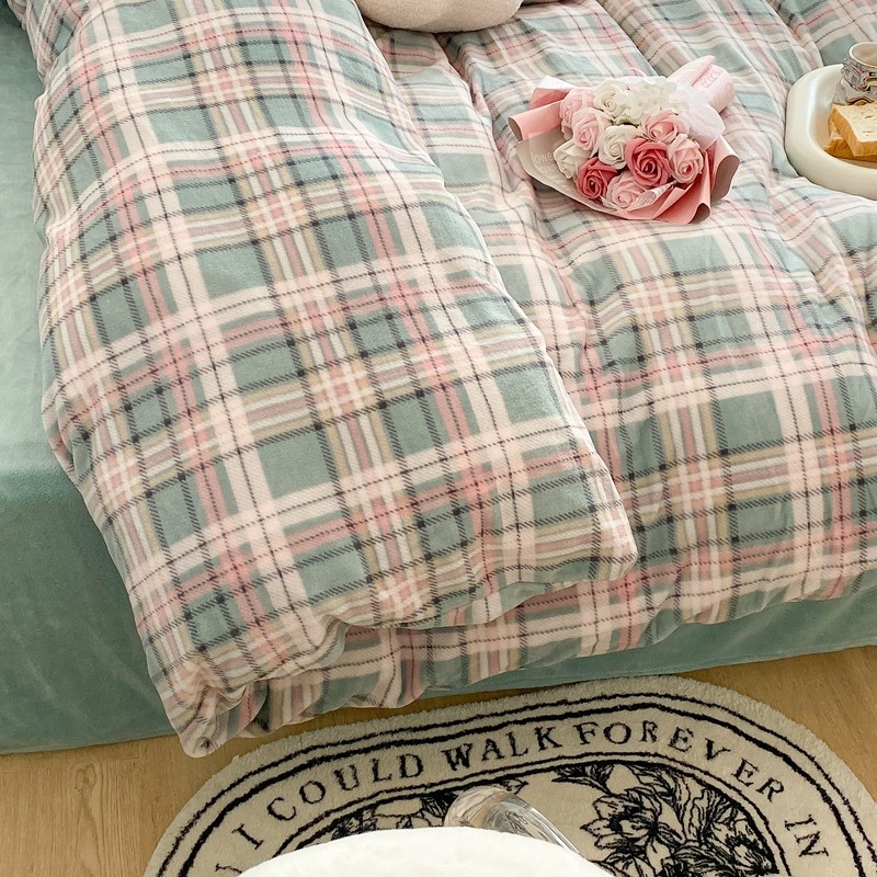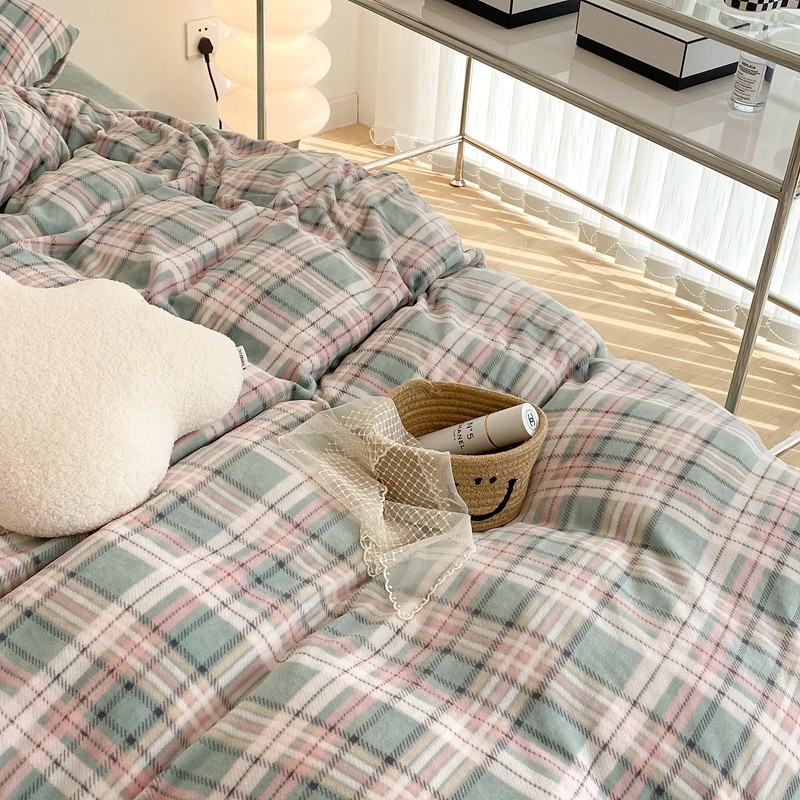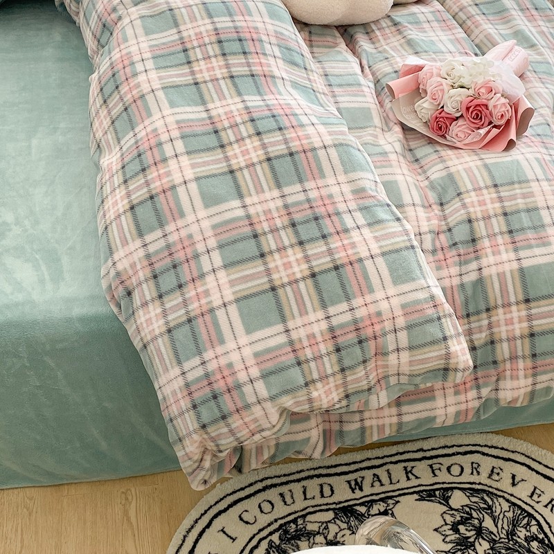 昔可家纺 2021新款学院风jk格子混搭牛奶绒 学院格绿