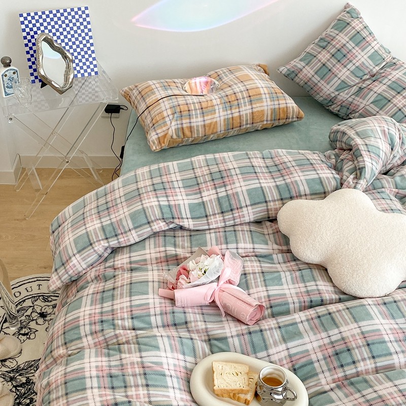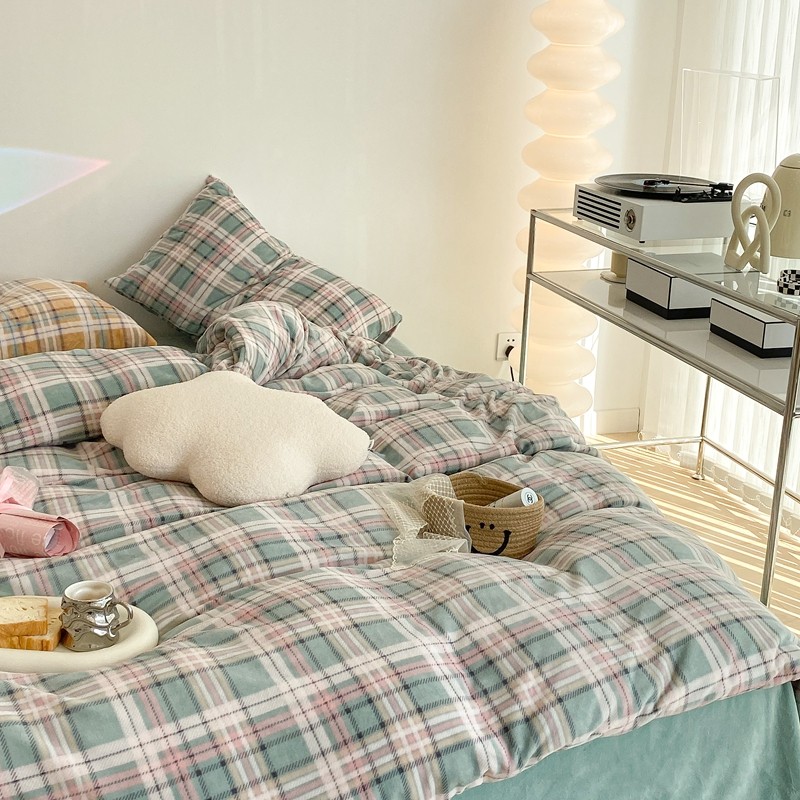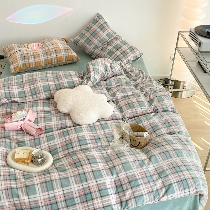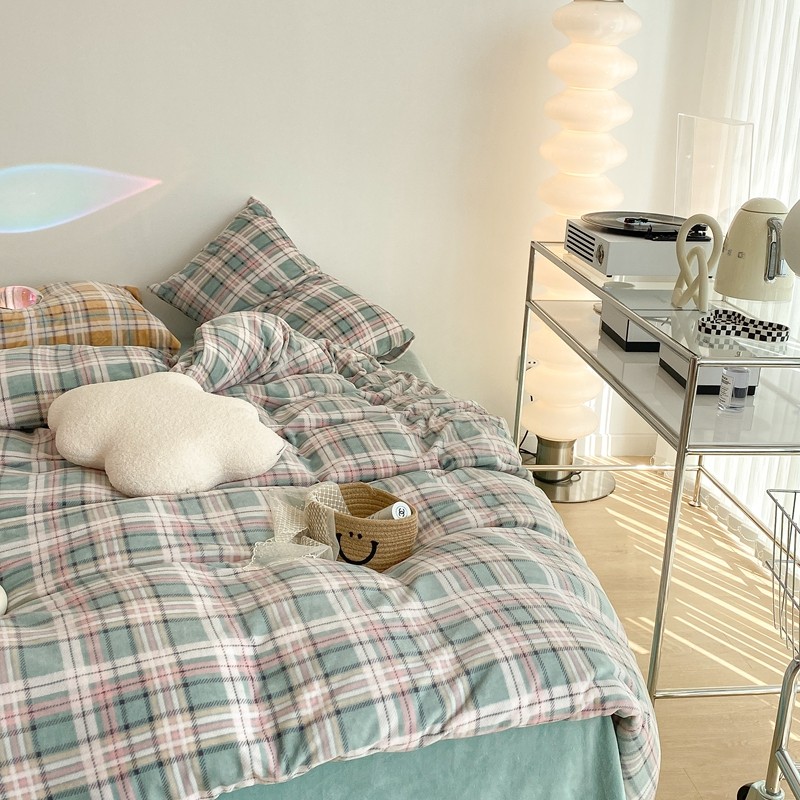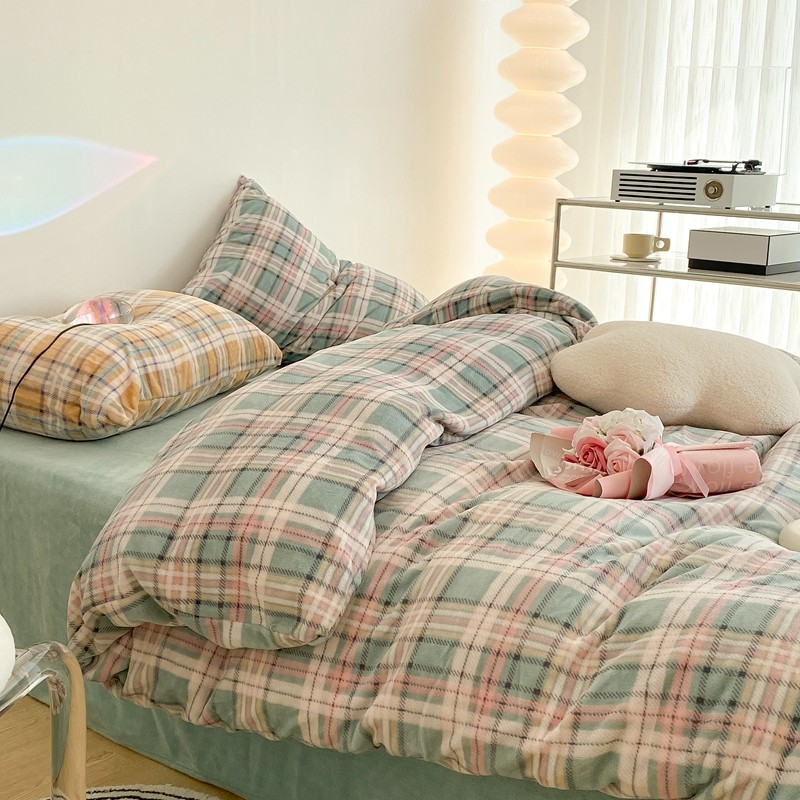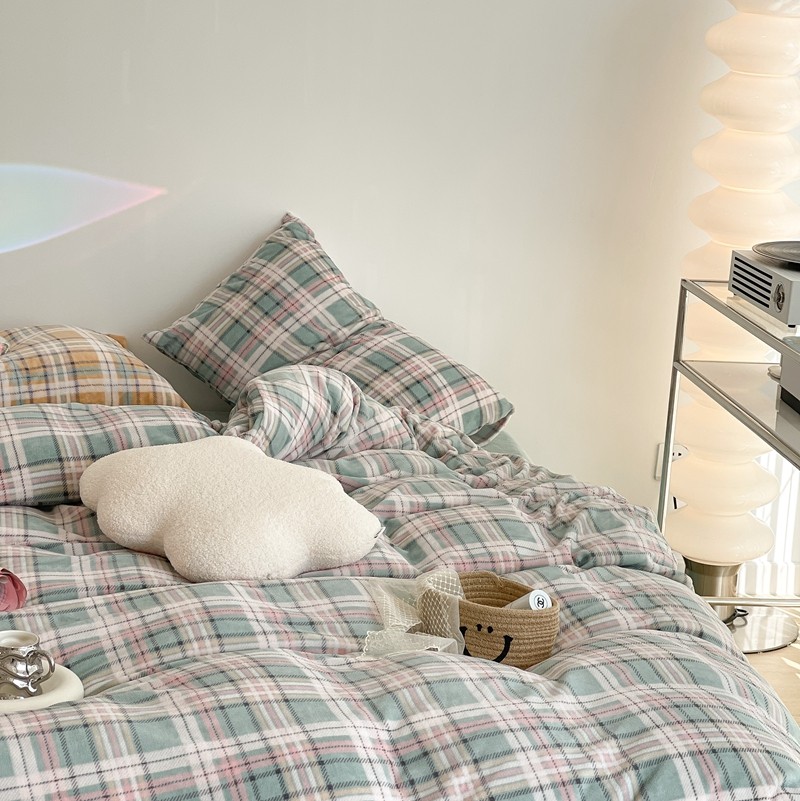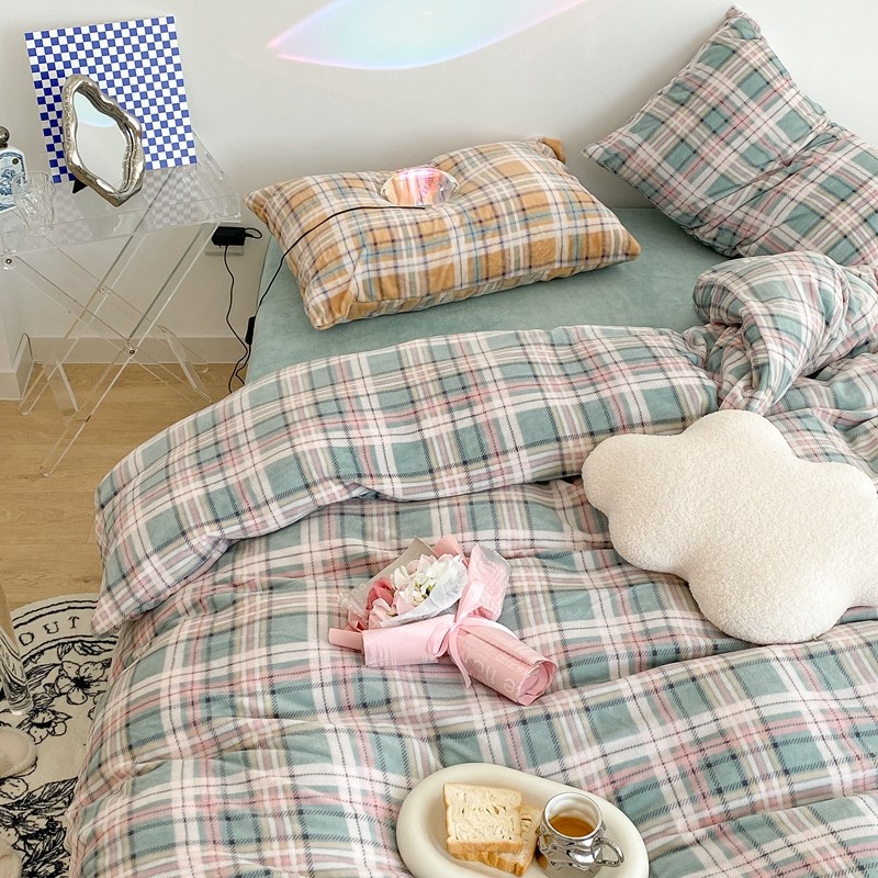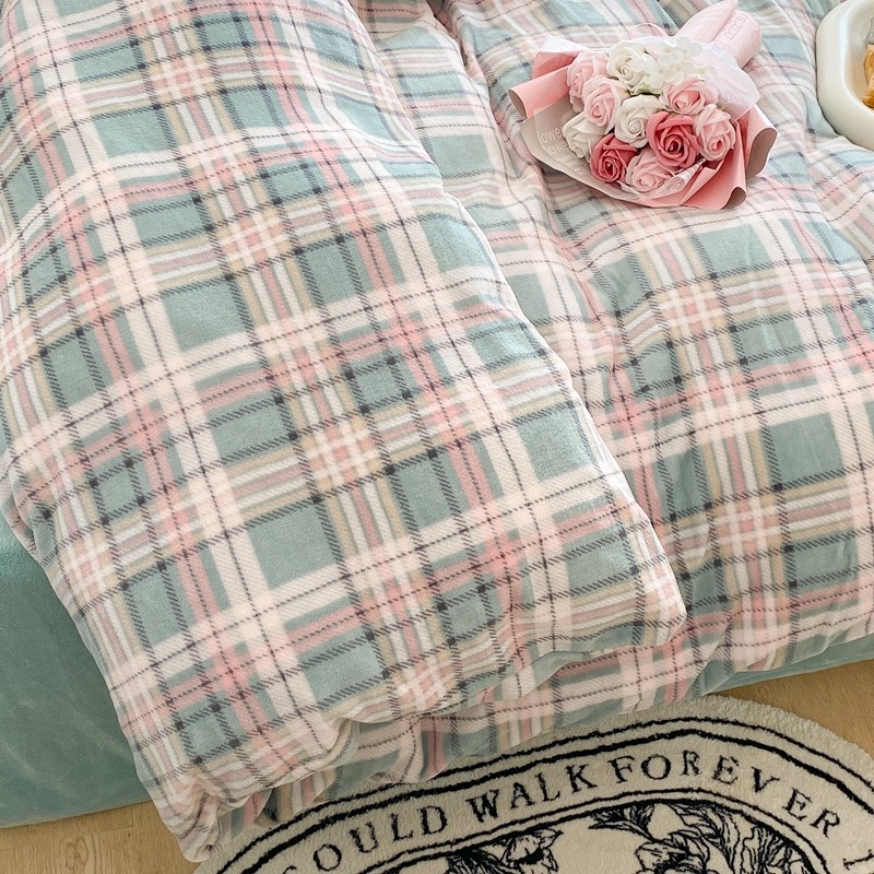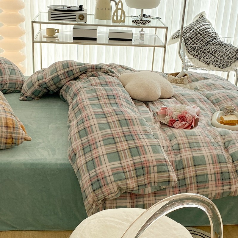 昔可家纺 2021新款学院风jk格子混搭牛奶绒 学院格绿