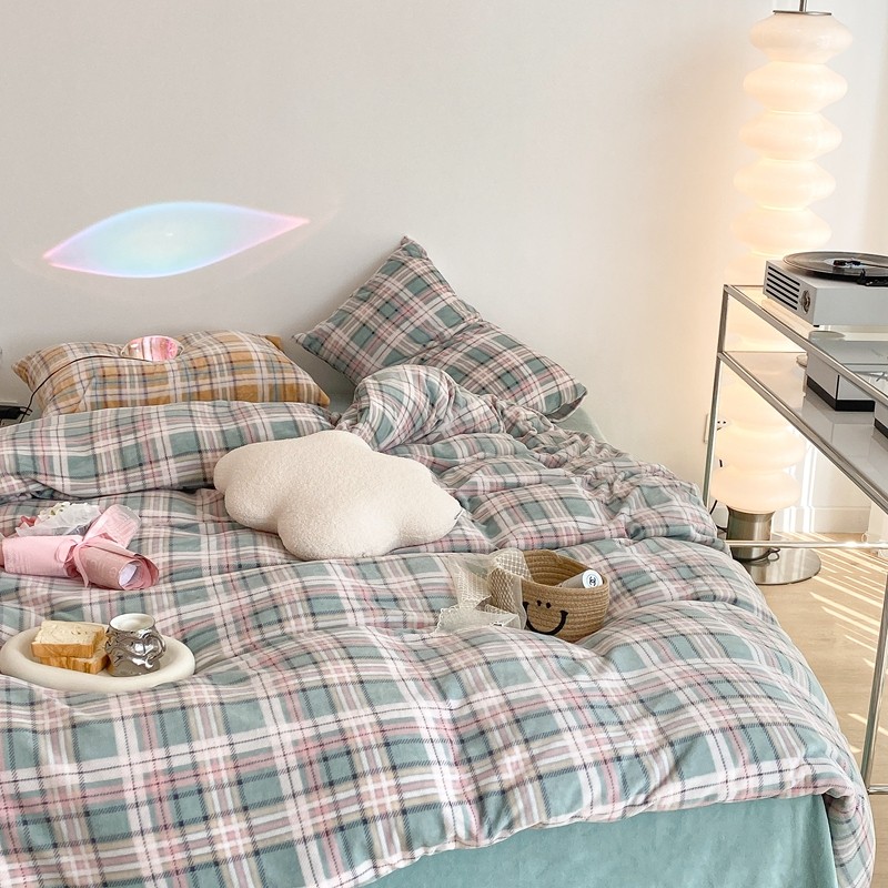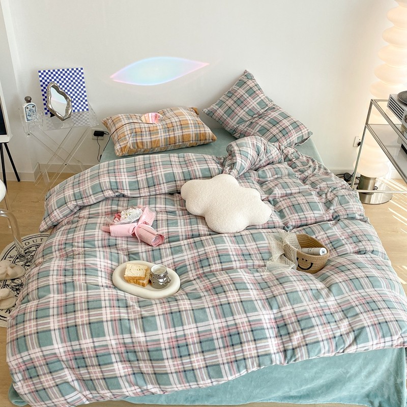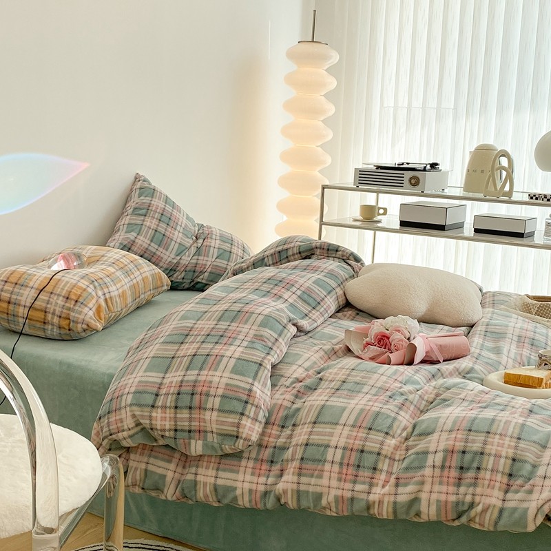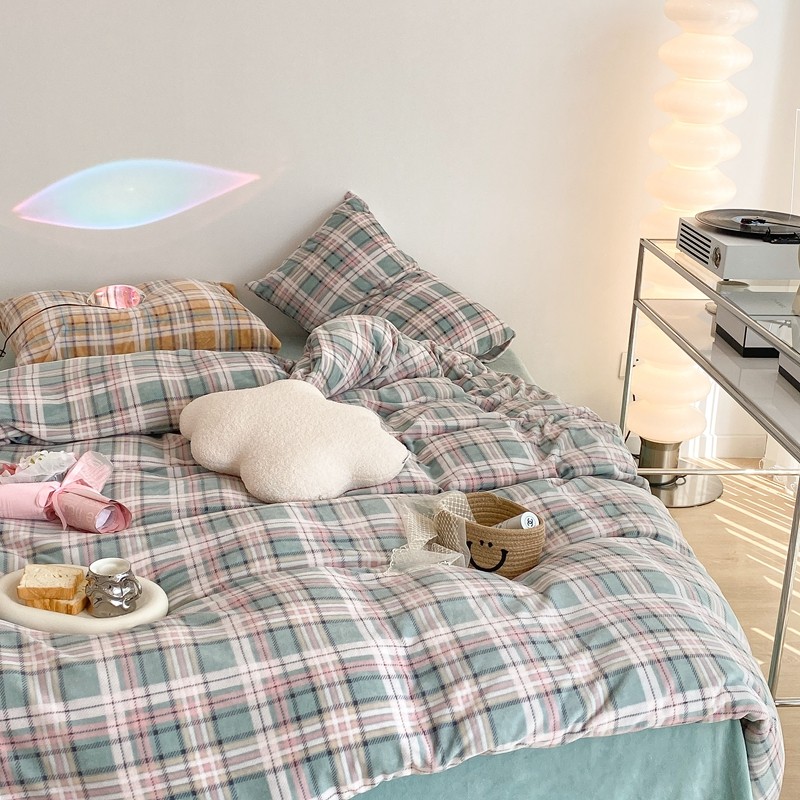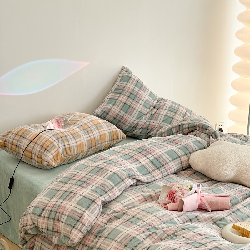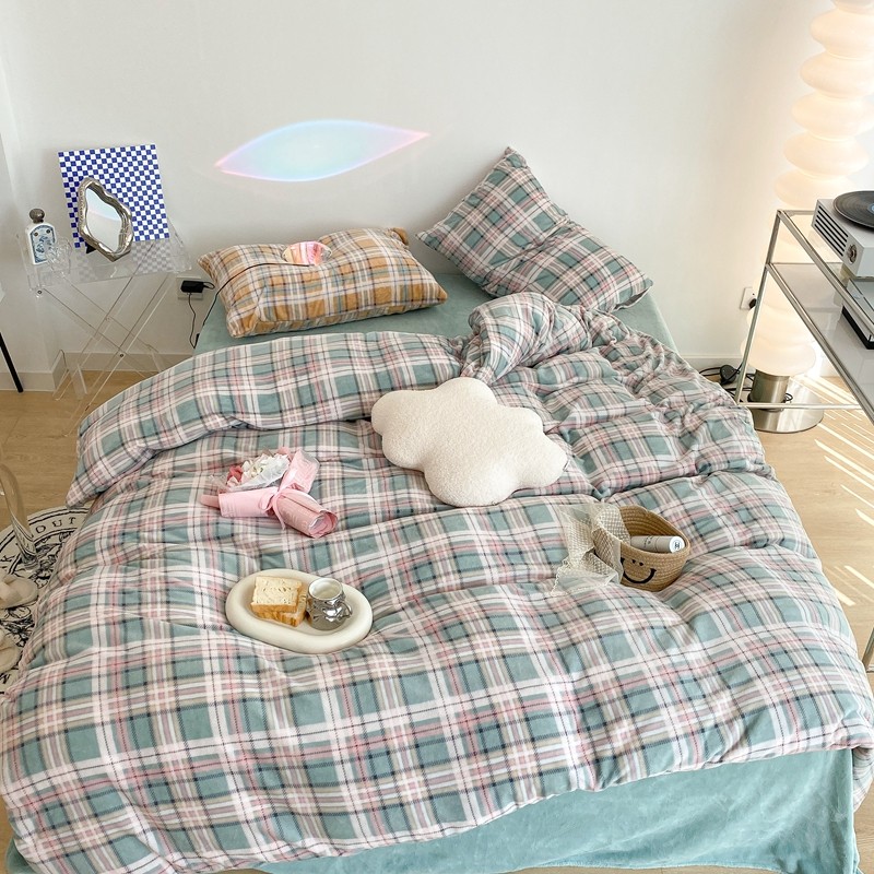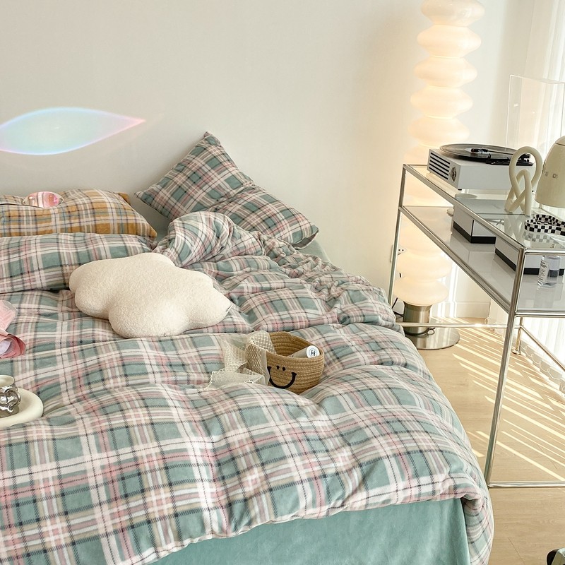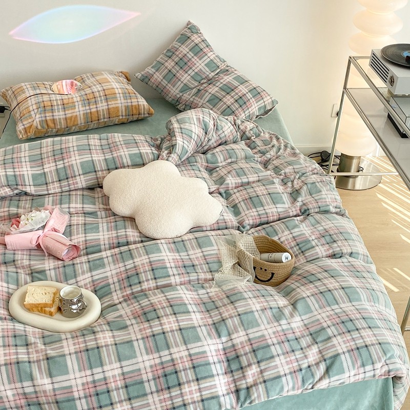 昔可家纺 2021新款学院风jk格子混搭牛奶绒 学院格绿