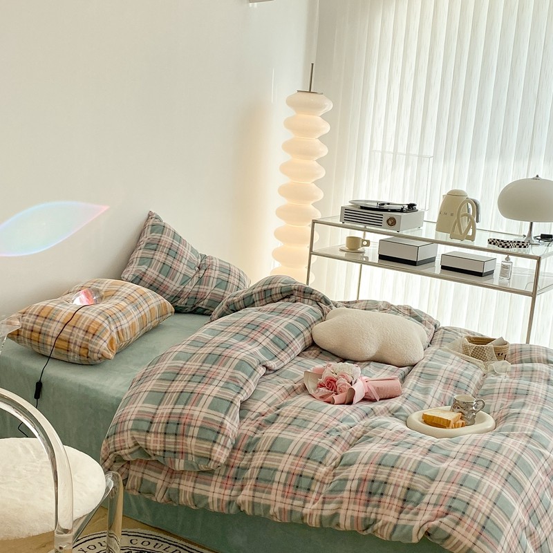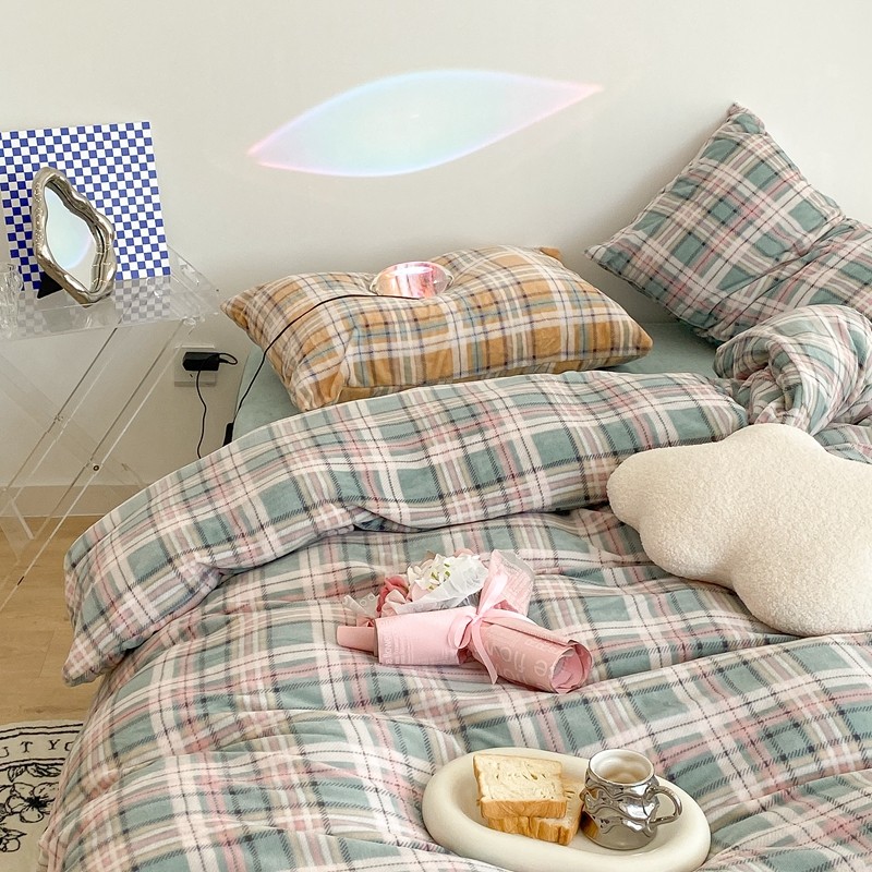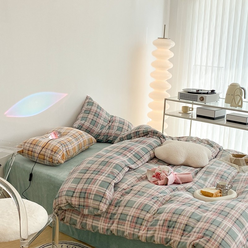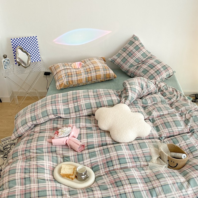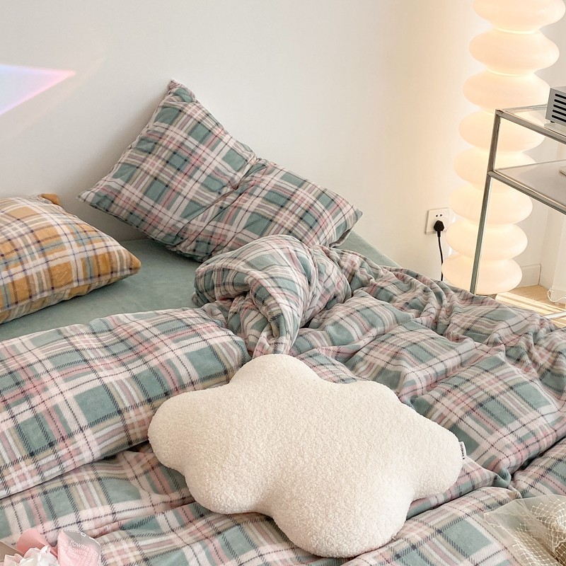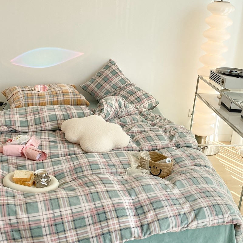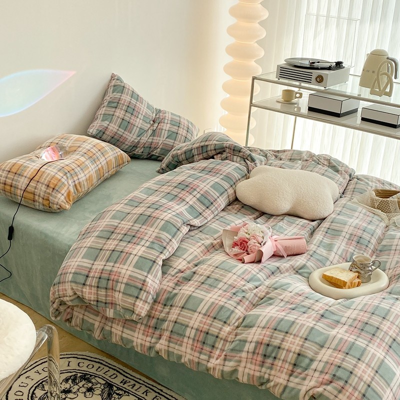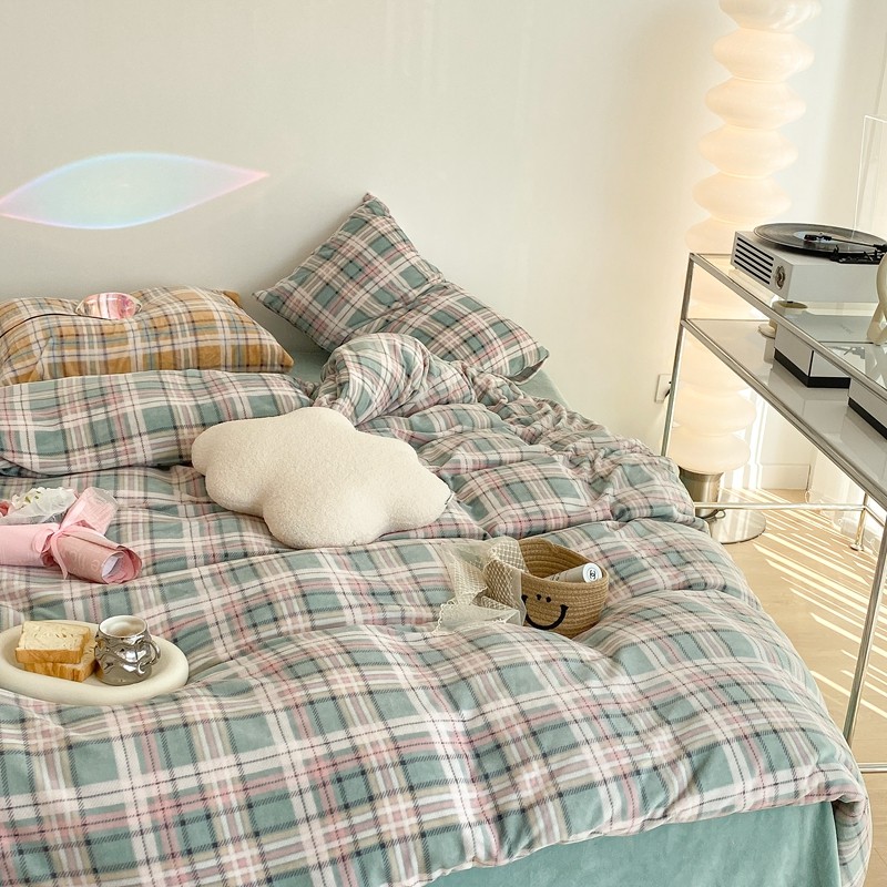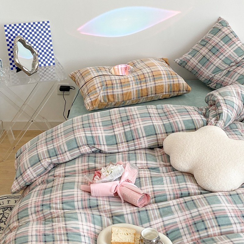 昔可家纺 2021新款学院风jk格子混搭牛奶绒 学院格绿
