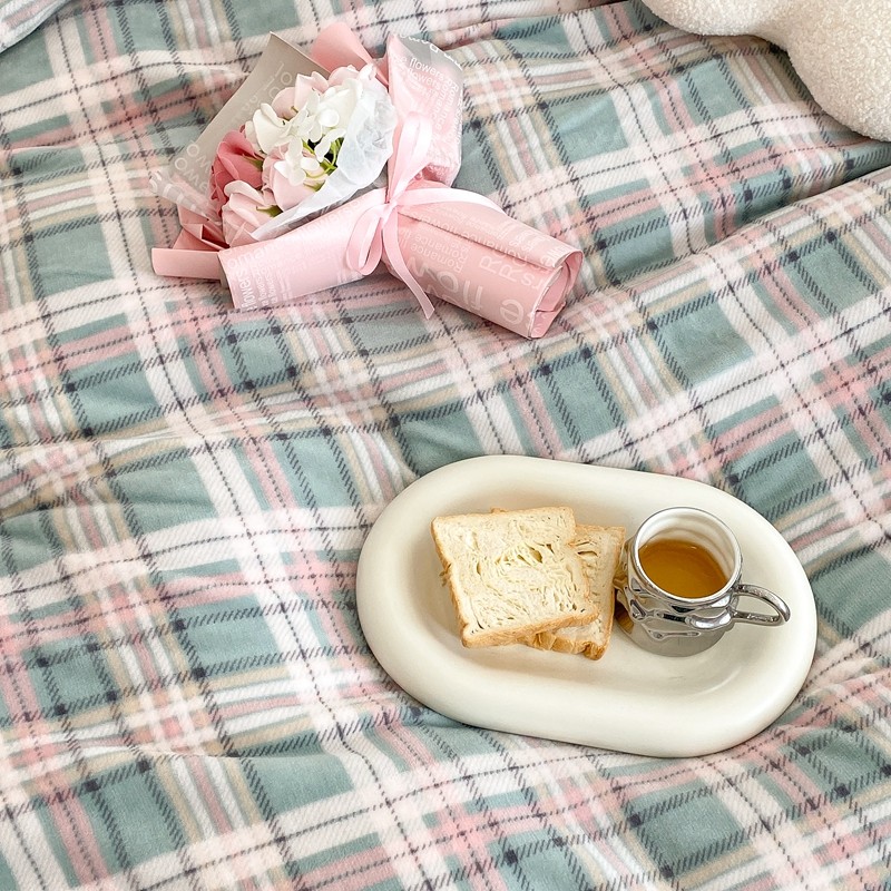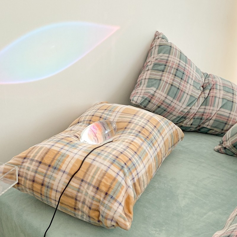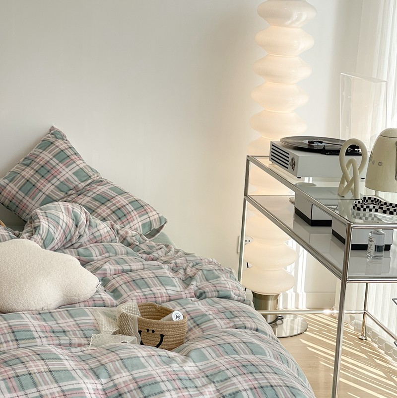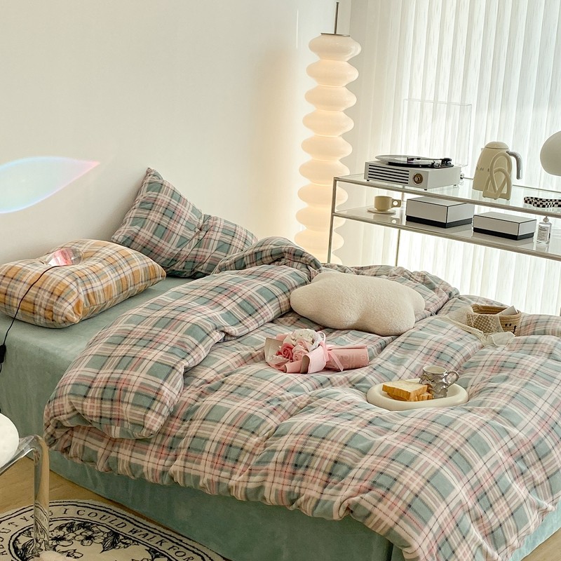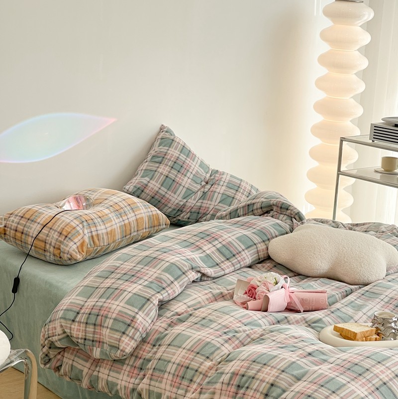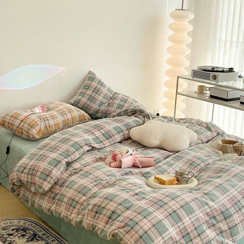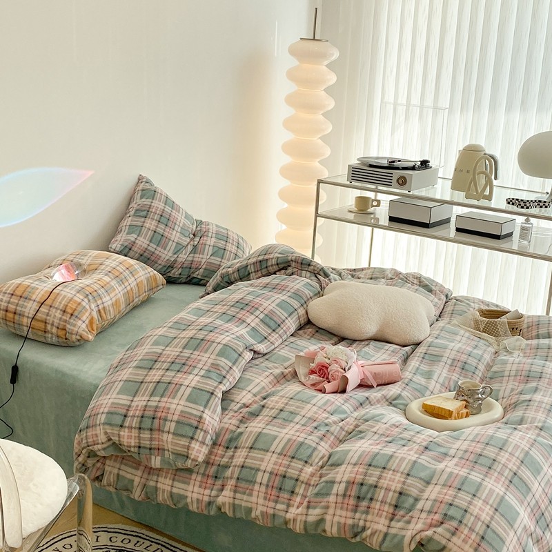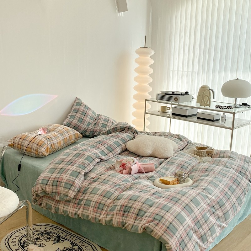 昔可家纺 2021新款学院风jk格子混搭牛奶绒 学院格绿