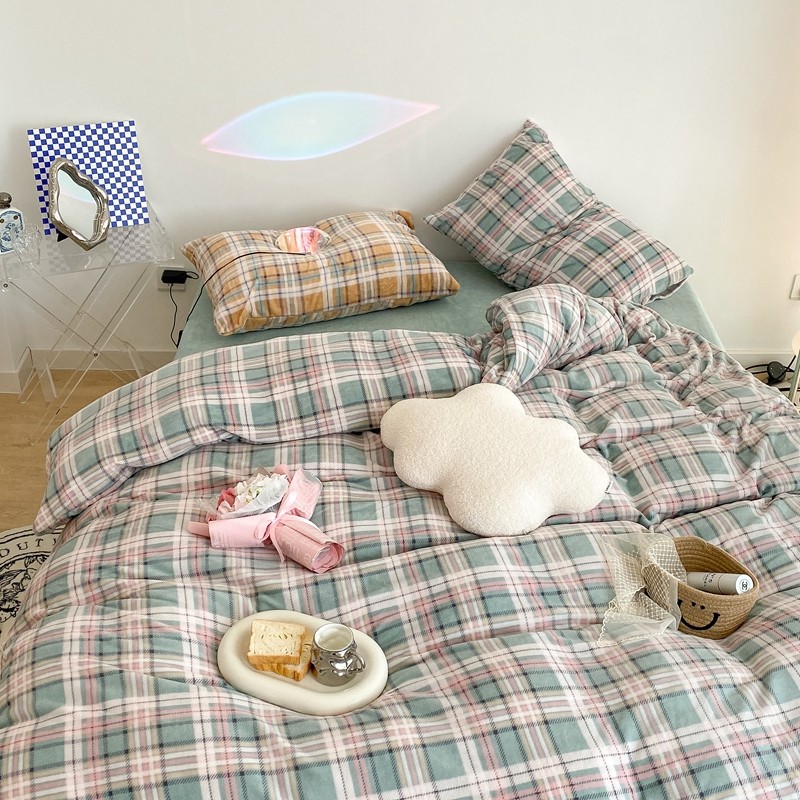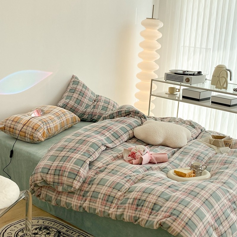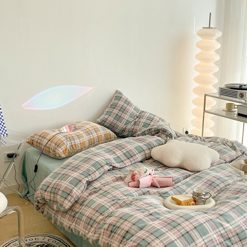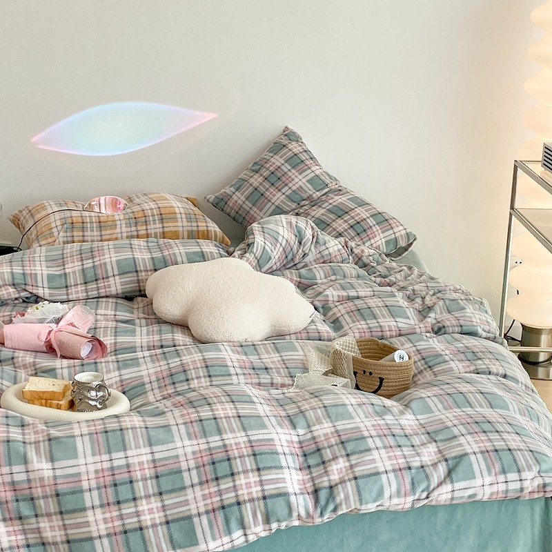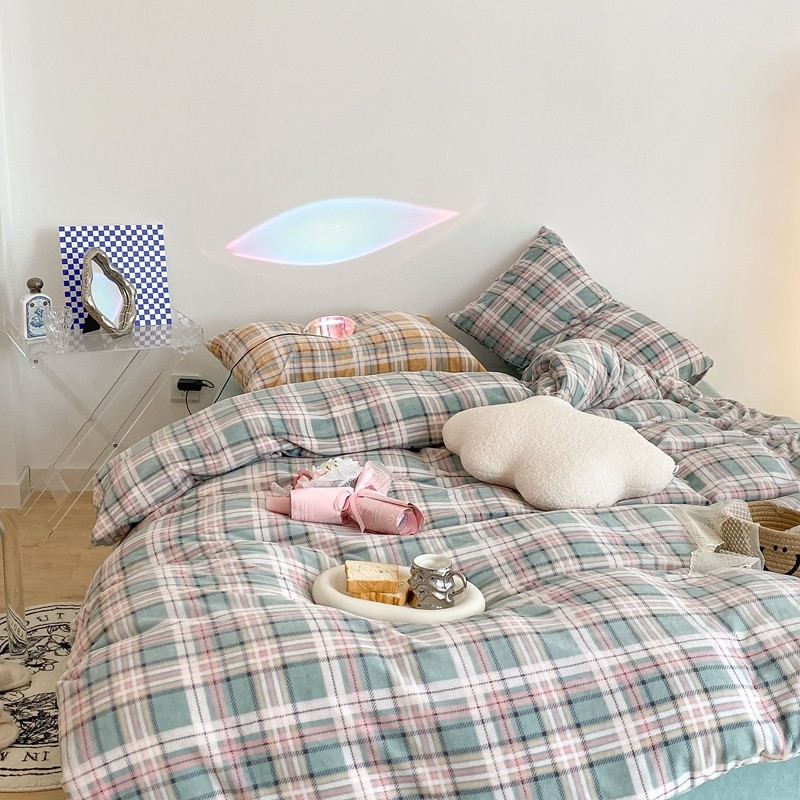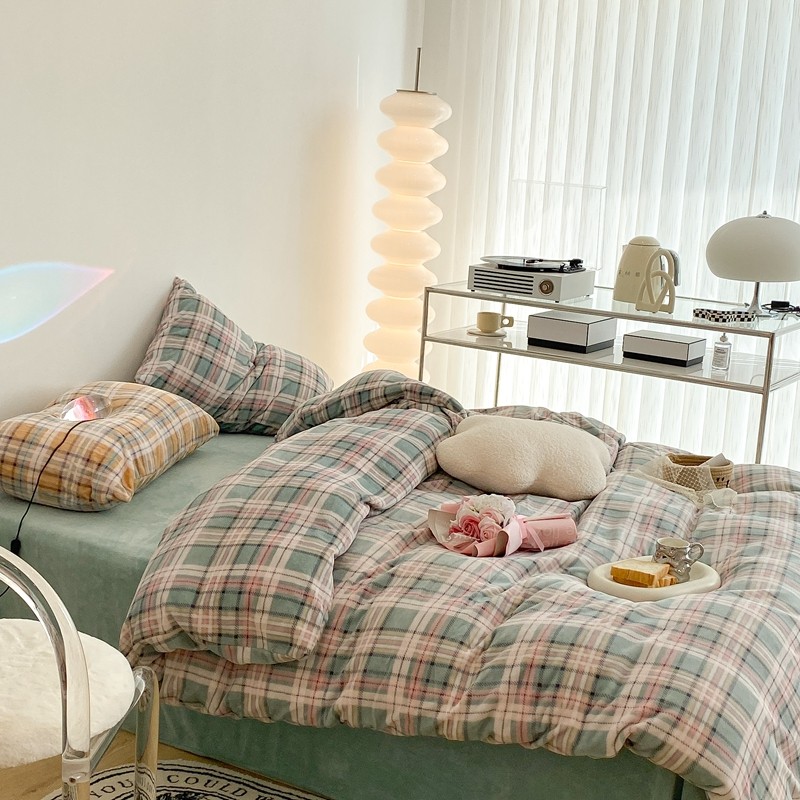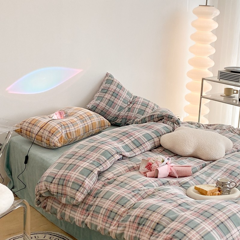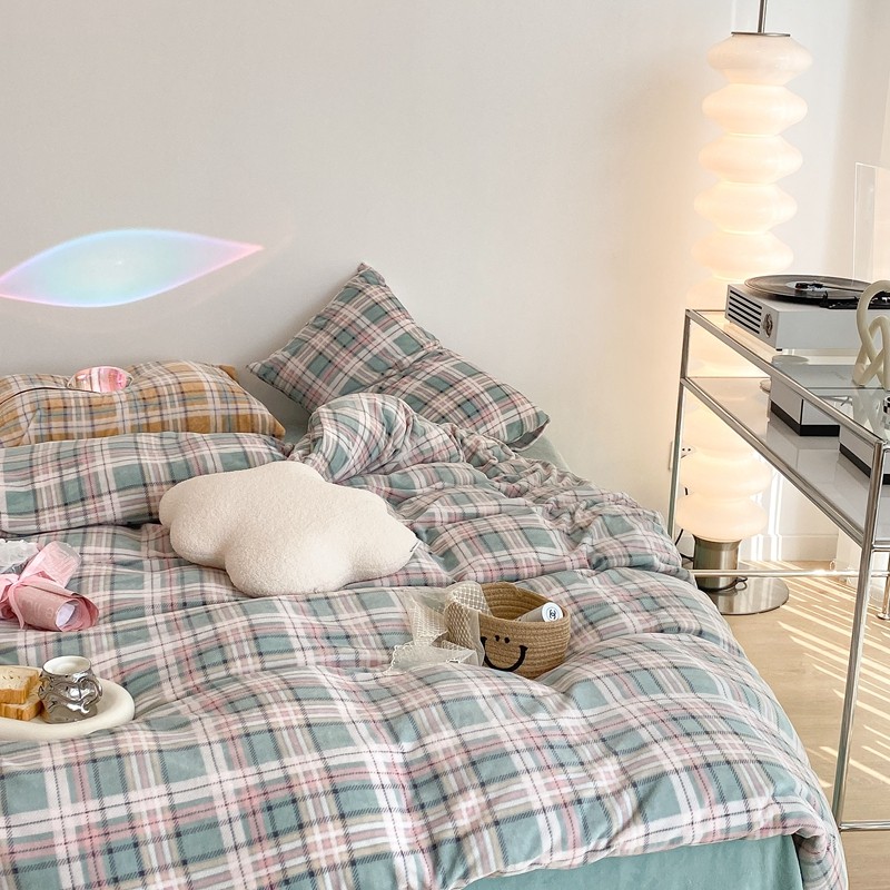 (总)昔可 2023新款全棉ins格子混搭系列四件套,ins简约绿格,粉蓝格,开心果格,学院格纹,粉绿格,海盐兰格,黄绿格,夏日蓝条,芝士黄条,紫芋泥芝士格