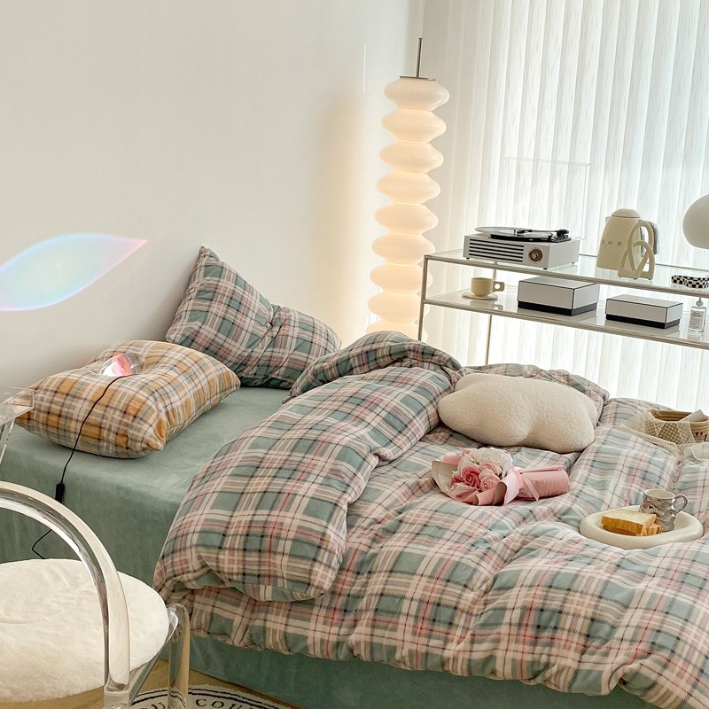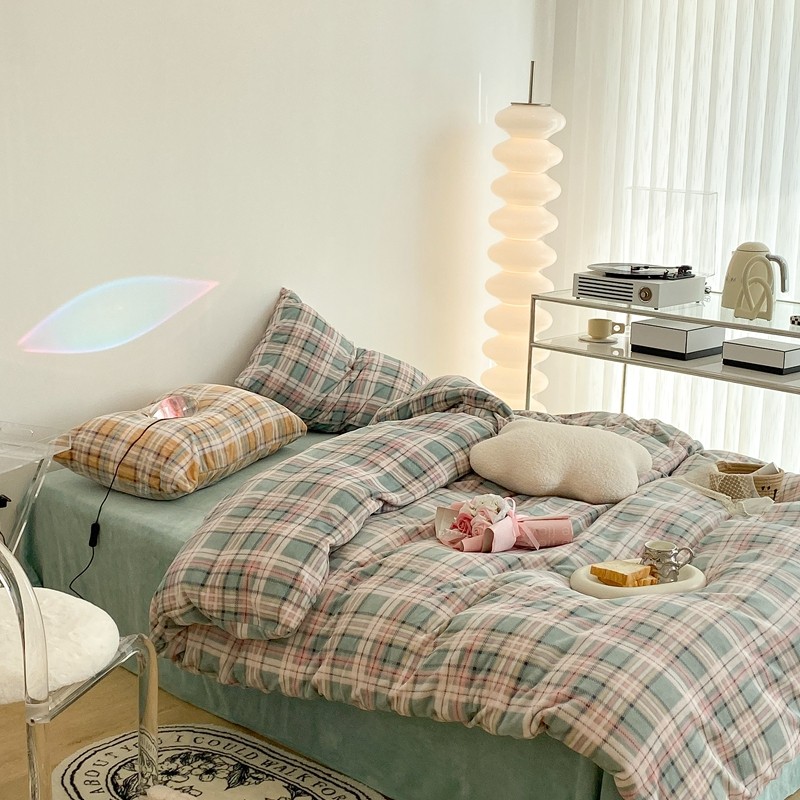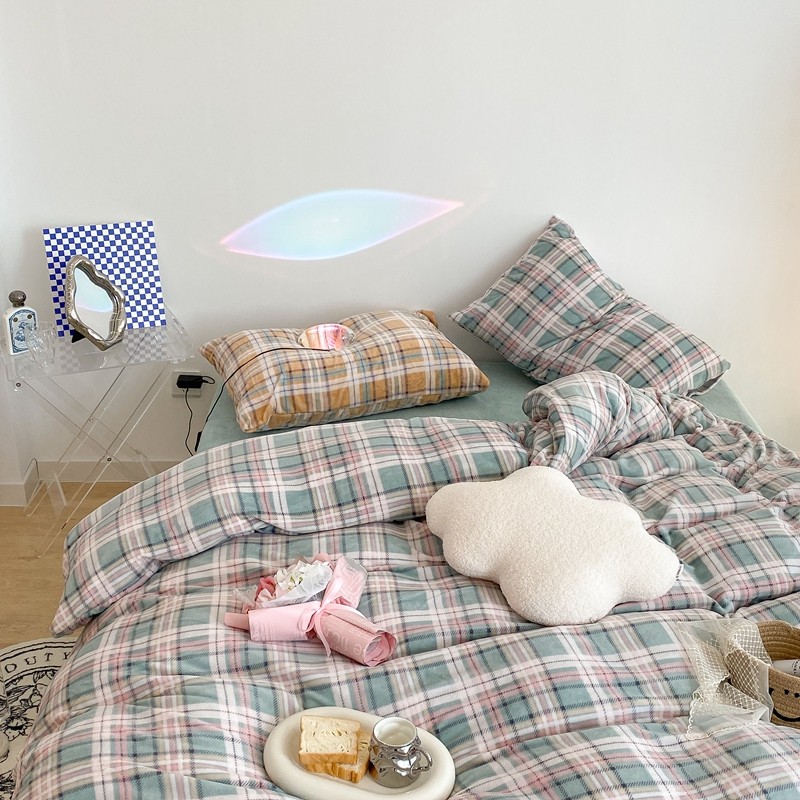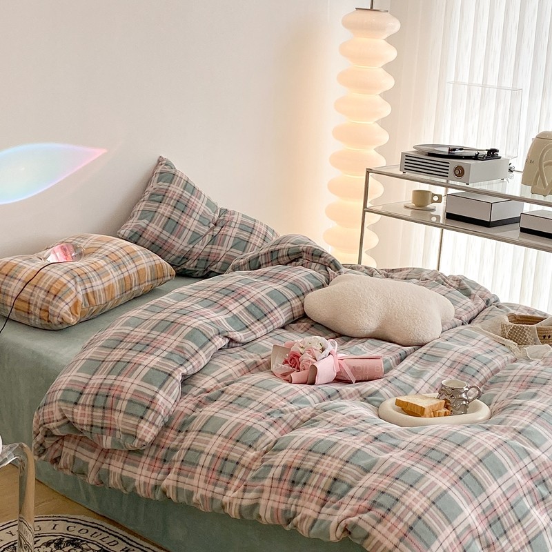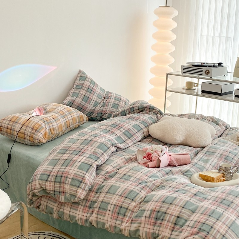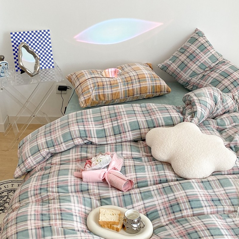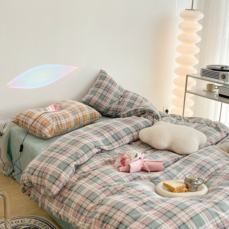 (总)昔可 2023新款全棉ins格子混搭系列四件套,ins简约绿格,粉蓝格,开心果格,学院格纹,粉绿格,海盐兰格,黄绿格,夏日蓝条,芝士黄条,紫芋泥芝士格