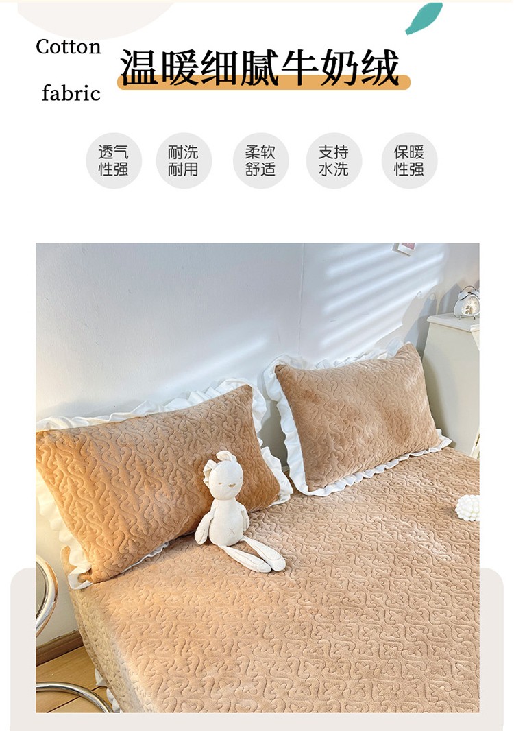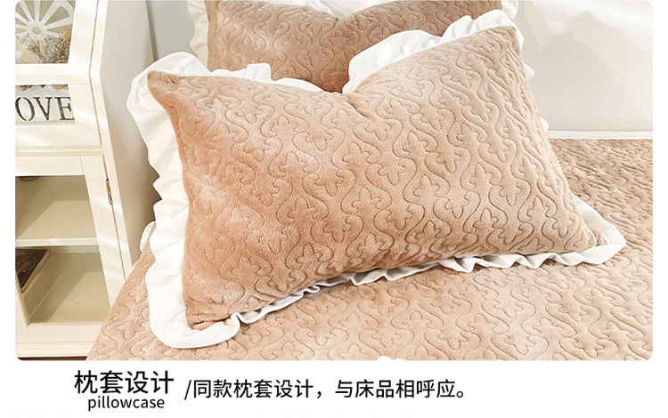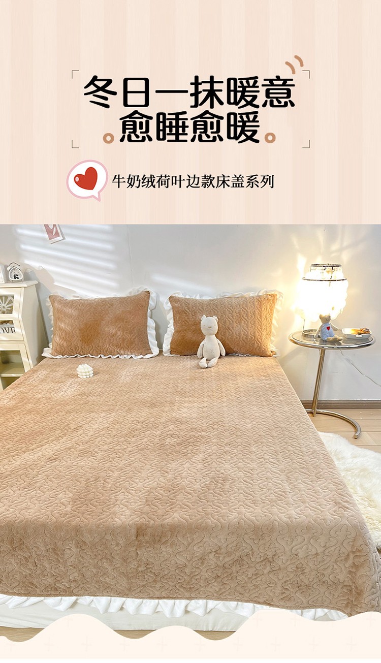 沐辰2021新款加厚牛奶绒荷叶边款床盖 淡卡其