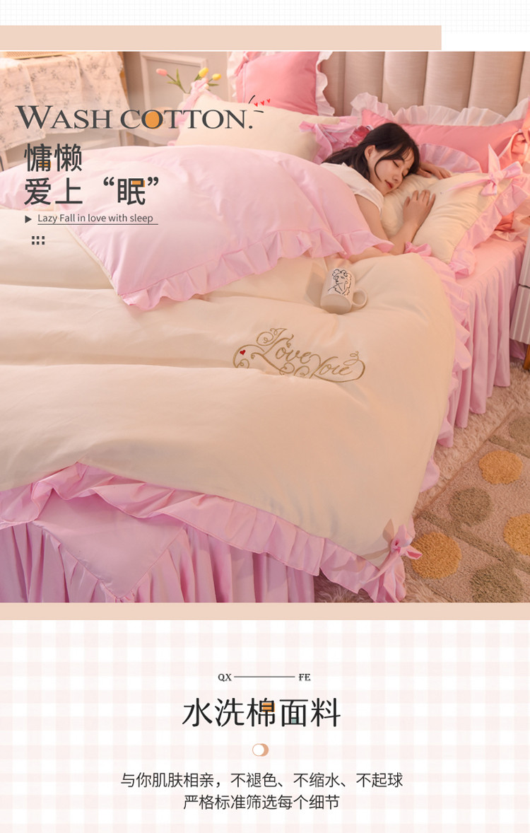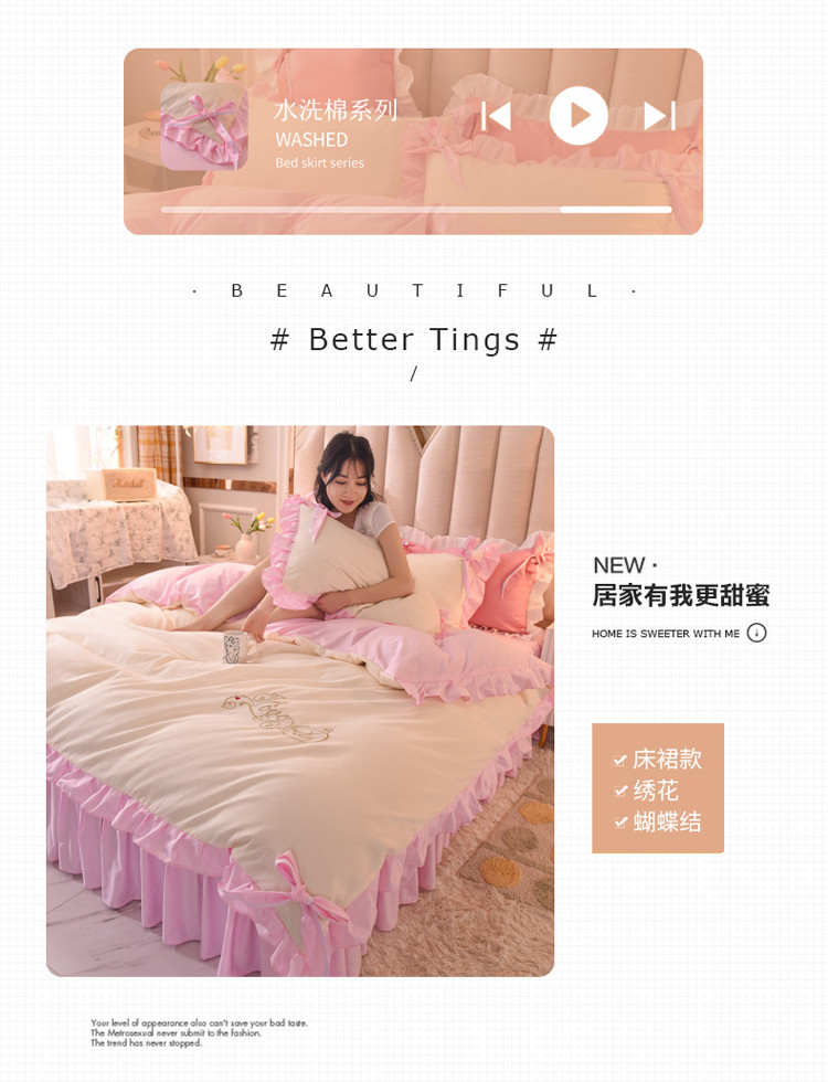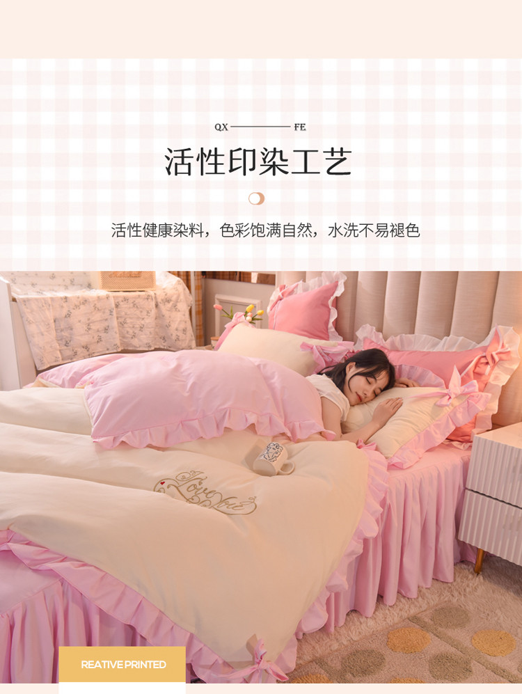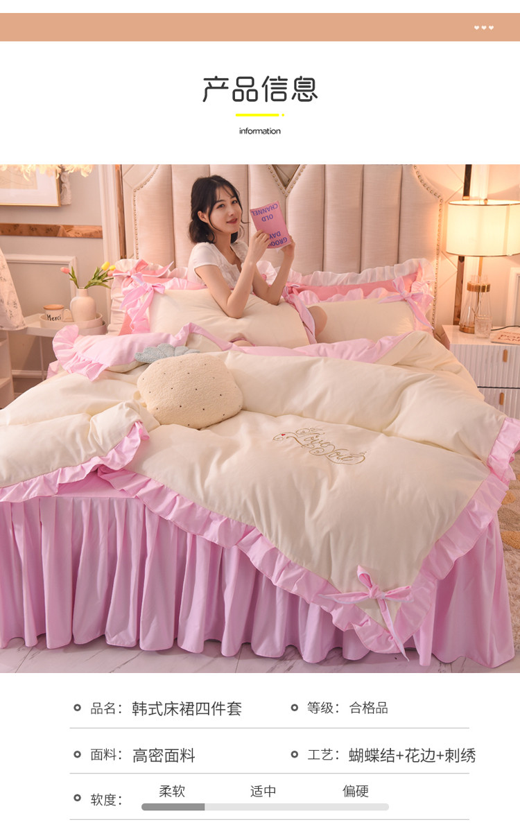 当前位置: 91家纺网 > 商品网购 > 床品套件 > 四件套 > 水洗棉四件套 > 欧冠 2022新款潮系列爱巢款床裙款刺绣四件套 粉白