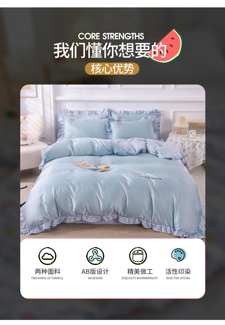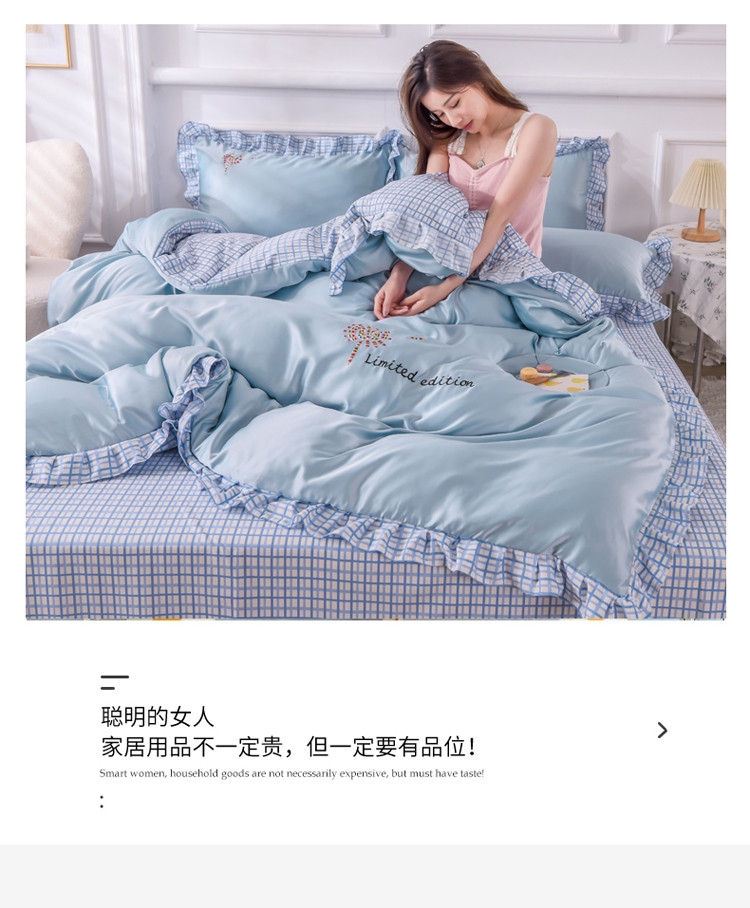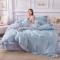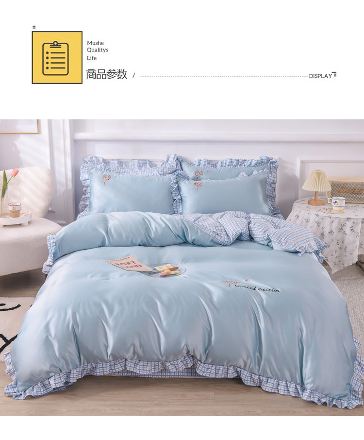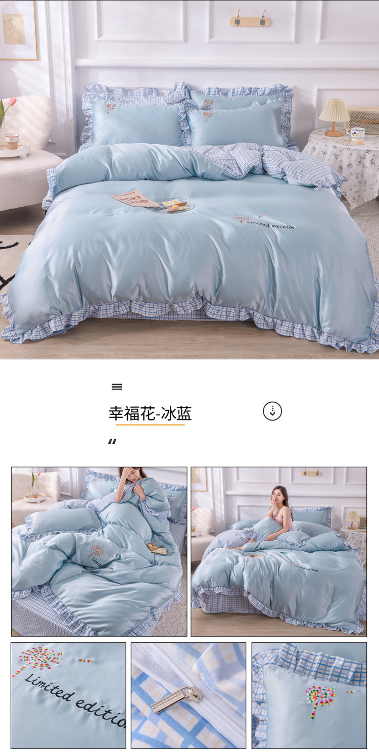 商品名称:欧冠 2022新款水洗真丝加水洗棉刺绣幸福花系列四件套 幸福花-冰蓝