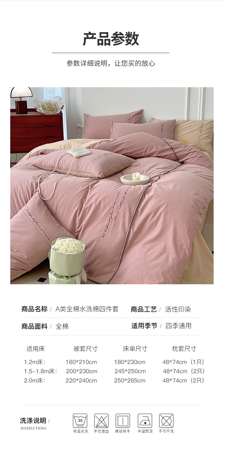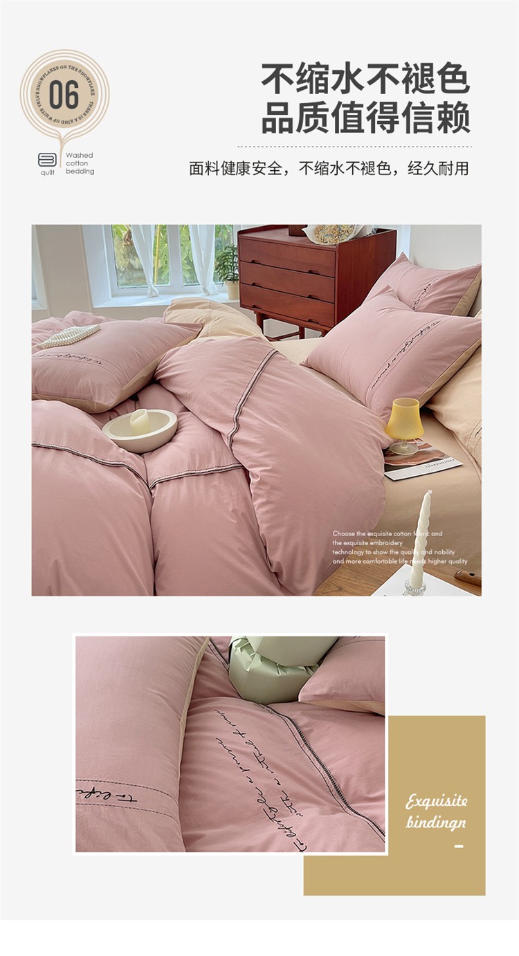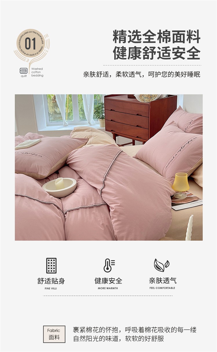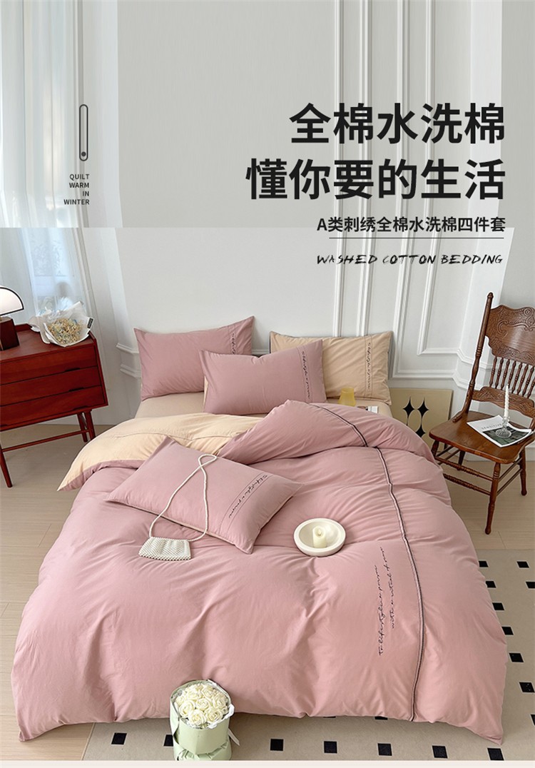(总)拼社家纺 2025新款母婴及全棉水洗棉刺绣四件套纯棉床上用品,艾玛绿+卡其,繁星蓝+卡其,繁星蓝+玫瑰粉,红豆沙+雅灰,迷雾灰+玫瑰粉,蜜粉+雅灰,奶油白+卡其,奶油白+香橙,牛仔蓝+浅蓝,香橙+雅灰
