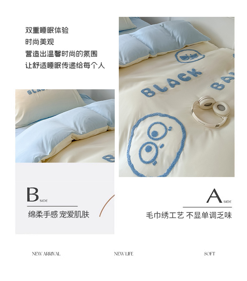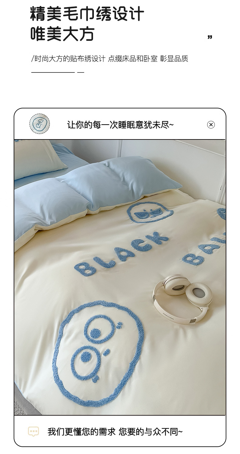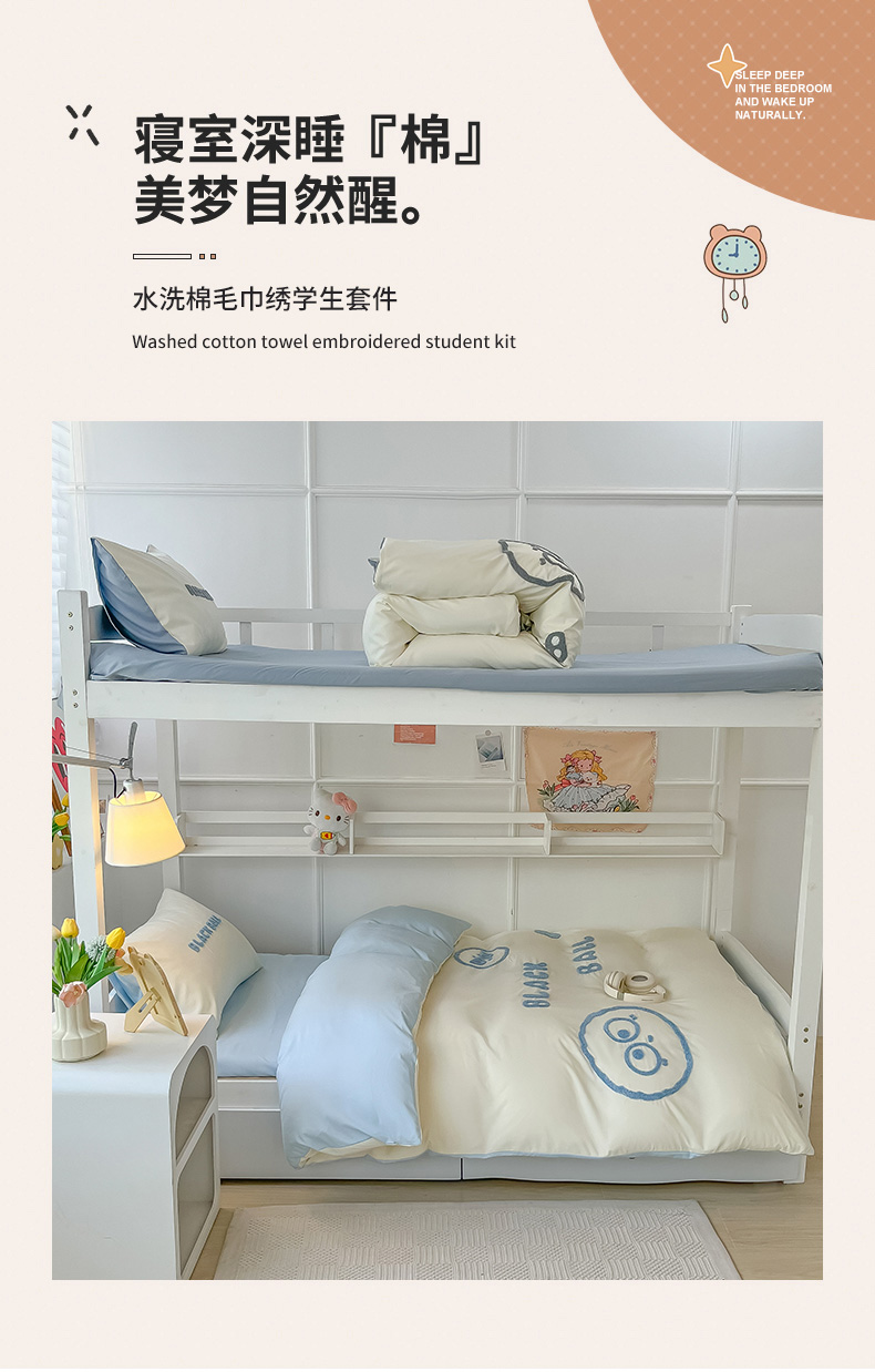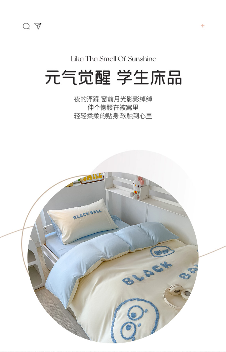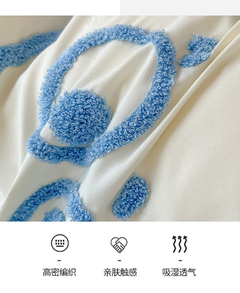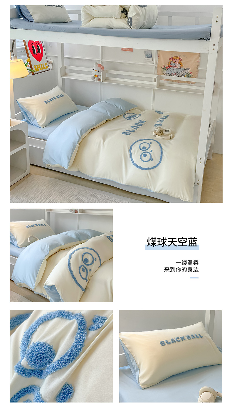 当前位置: 91家纺网 > 商品网购 > 床品套件 > 四件套 > 水洗棉四件套 > 眠帛 2023新款水洗棉毛巾绣煤球系列学生三件套六件套 煤球天空蓝