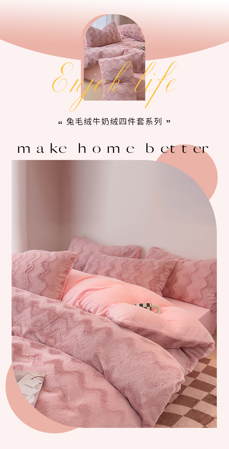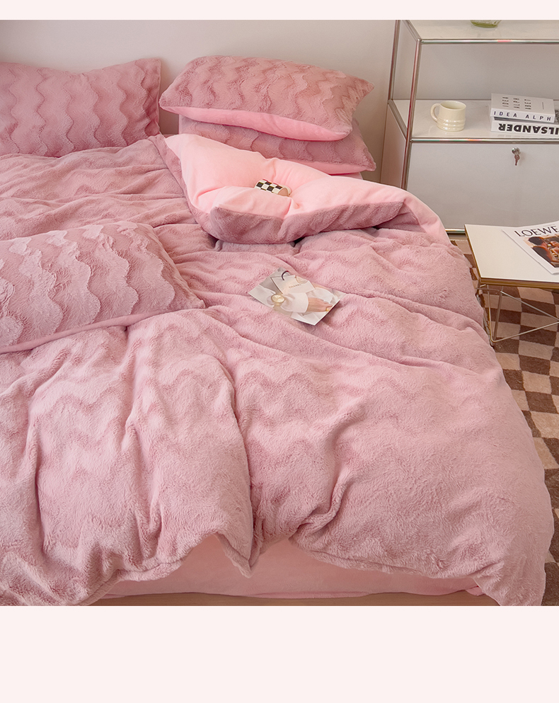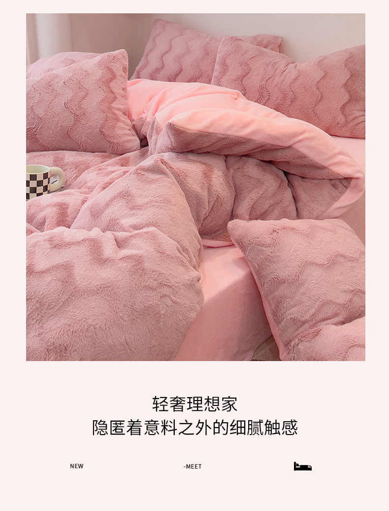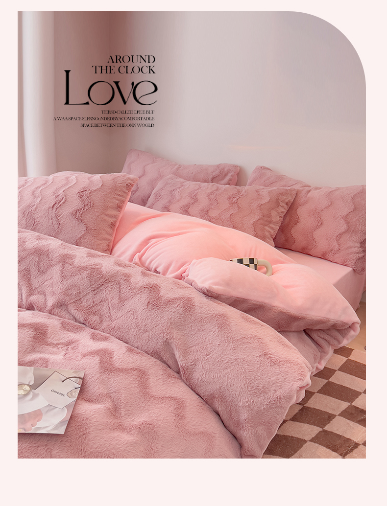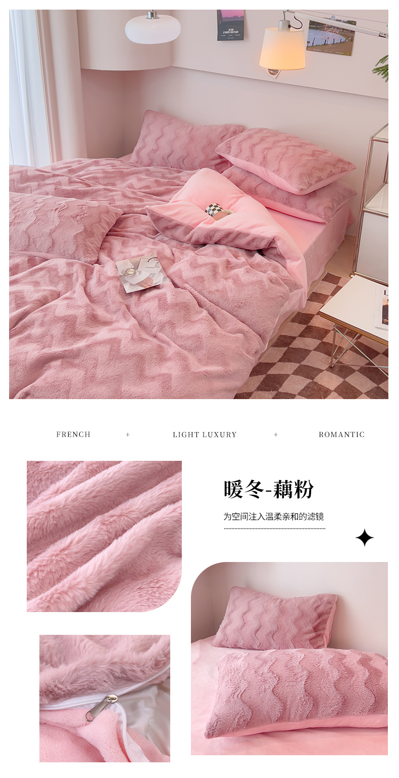 当前位置: 91家纺网 > 商品网购 > 床品套件 > 四件套 > 牛奶绒四件套 > 韩都 2023新款直播爆款320克A类波浪兔毛绒立体剪花纯色牛奶绒四件套-暖冬 暖冬-藕粉