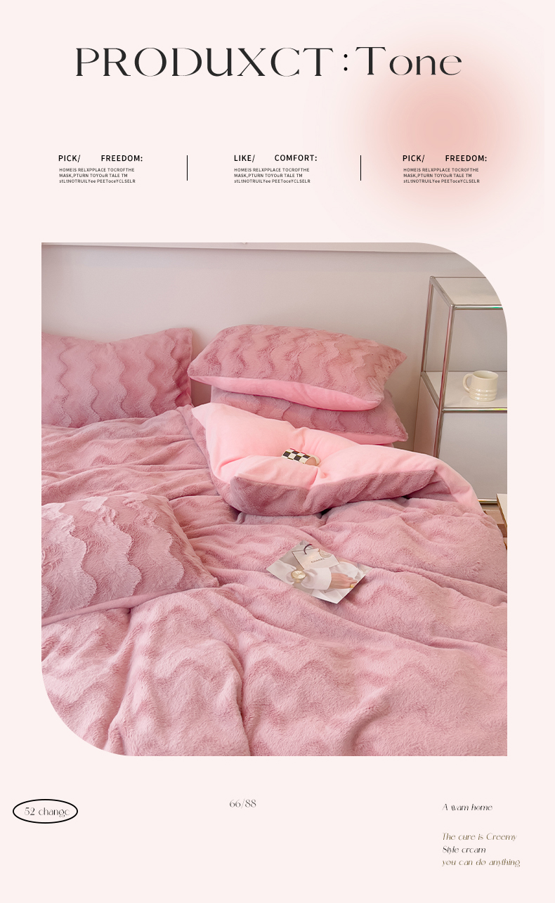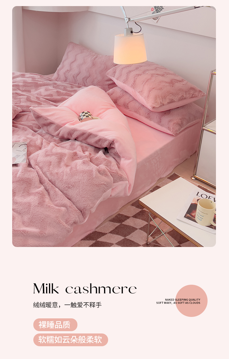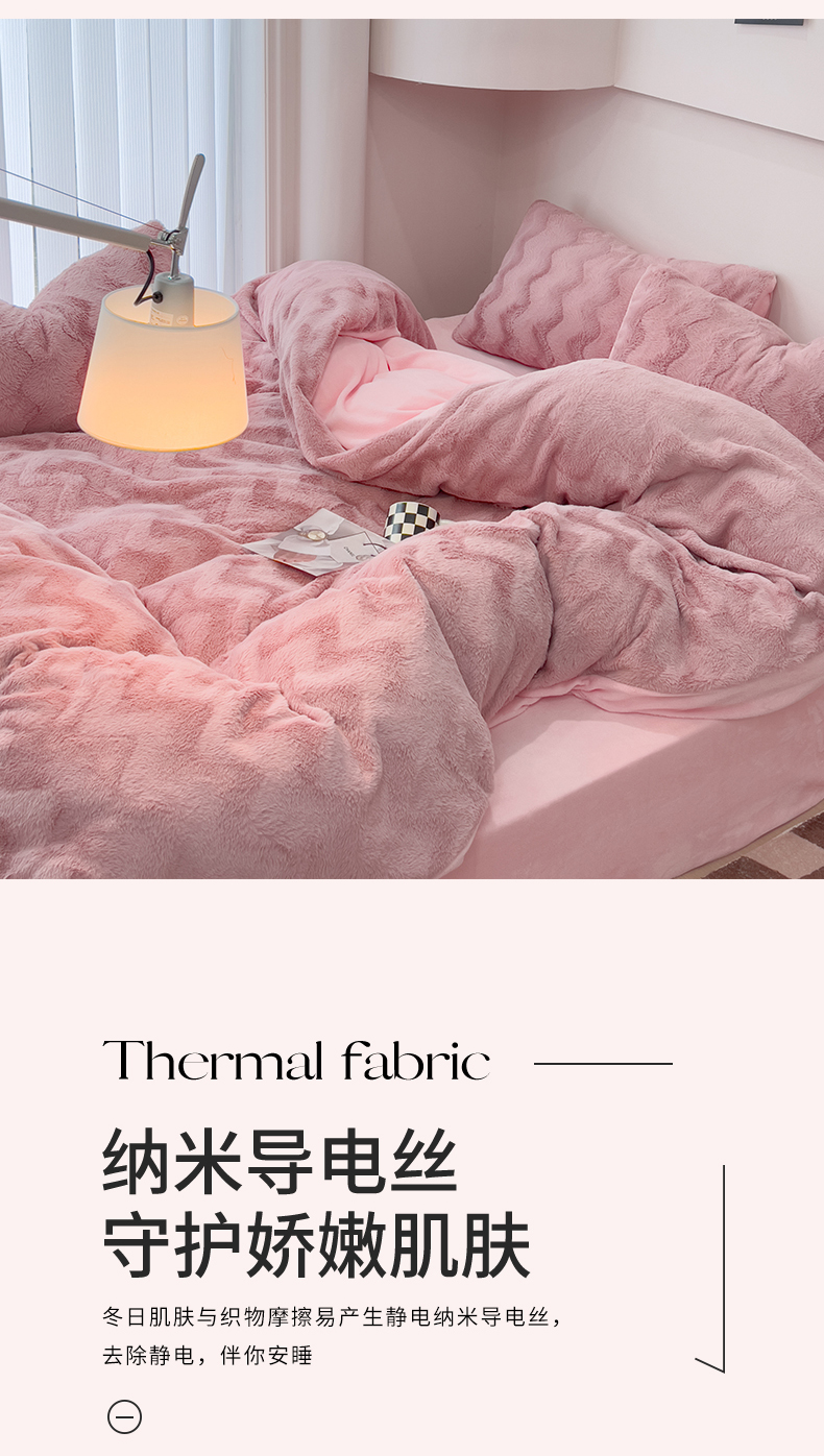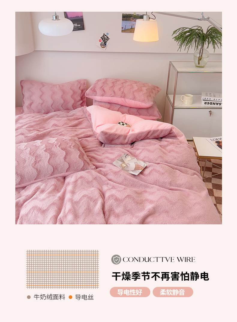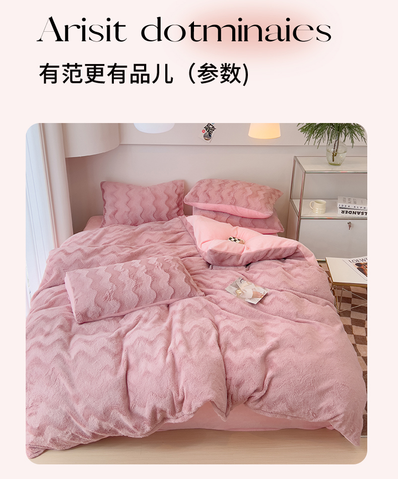 当前位置: 91家纺网 > 商品网购 > 床品套件 > 四件套 > 牛奶绒四件套 > 韩都 2023新款直播爆款320克A类波浪兔毛绒立体剪花纯色牛奶绒四件套-暖冬 暖冬-藕粉