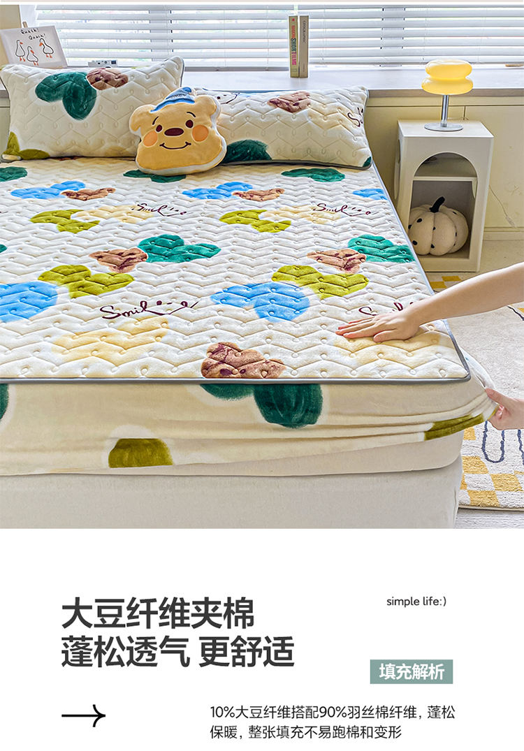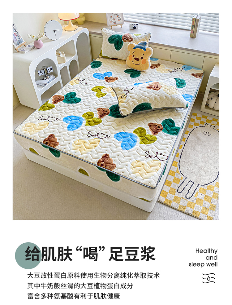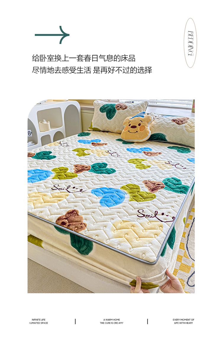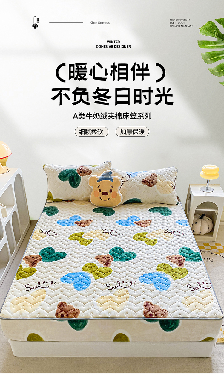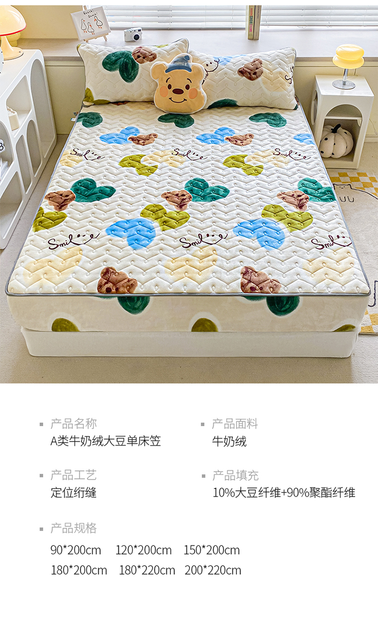 商品名称:卡伦家纺 2025新款A类牛奶绒大豆纤维抗菌夹棉床笠 爱心熊