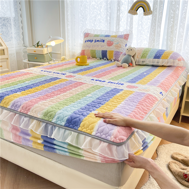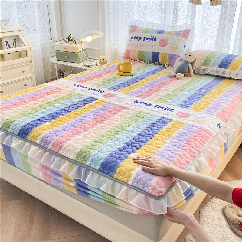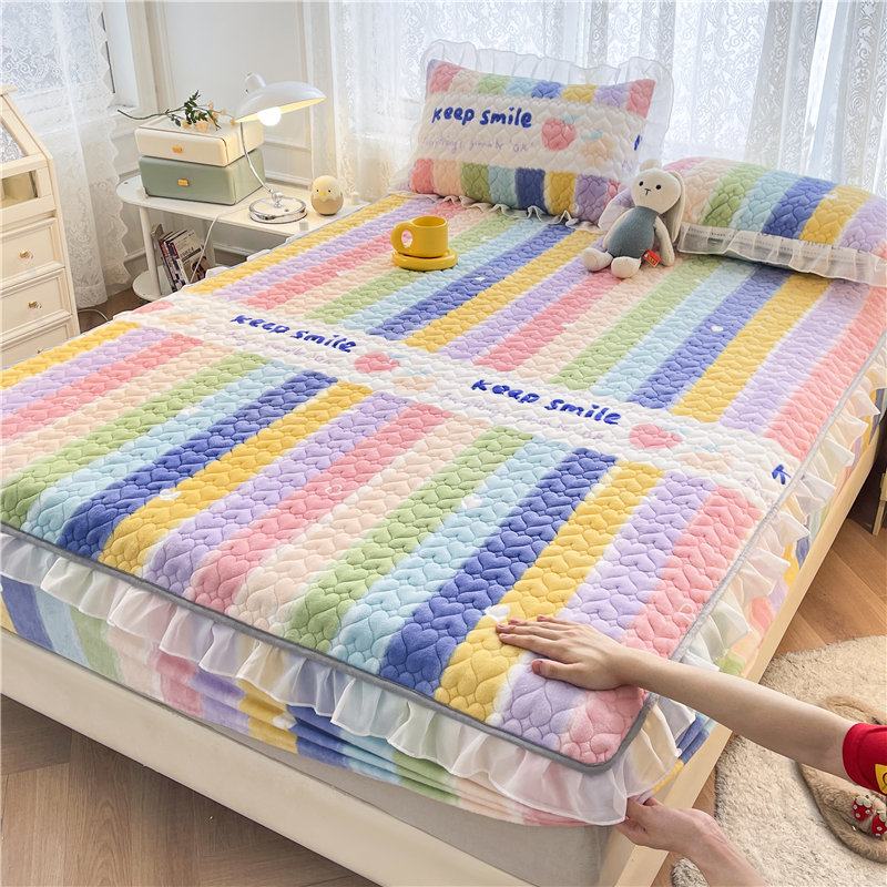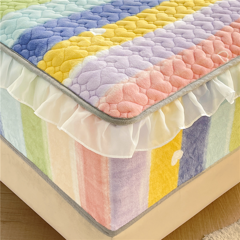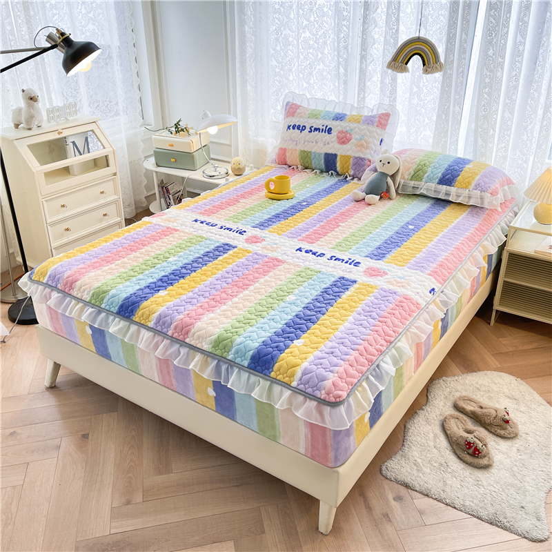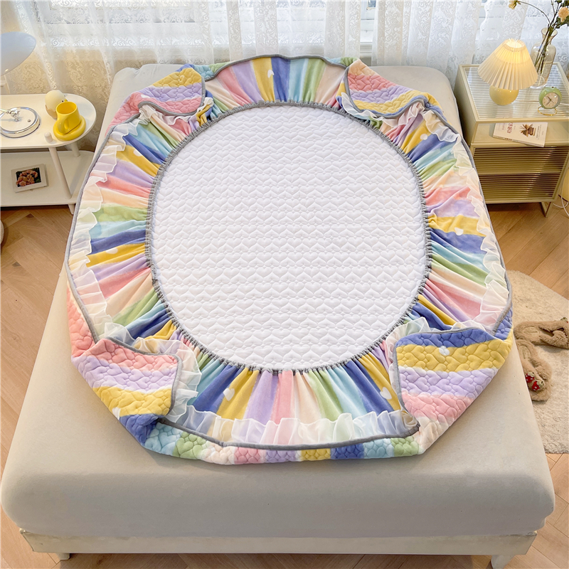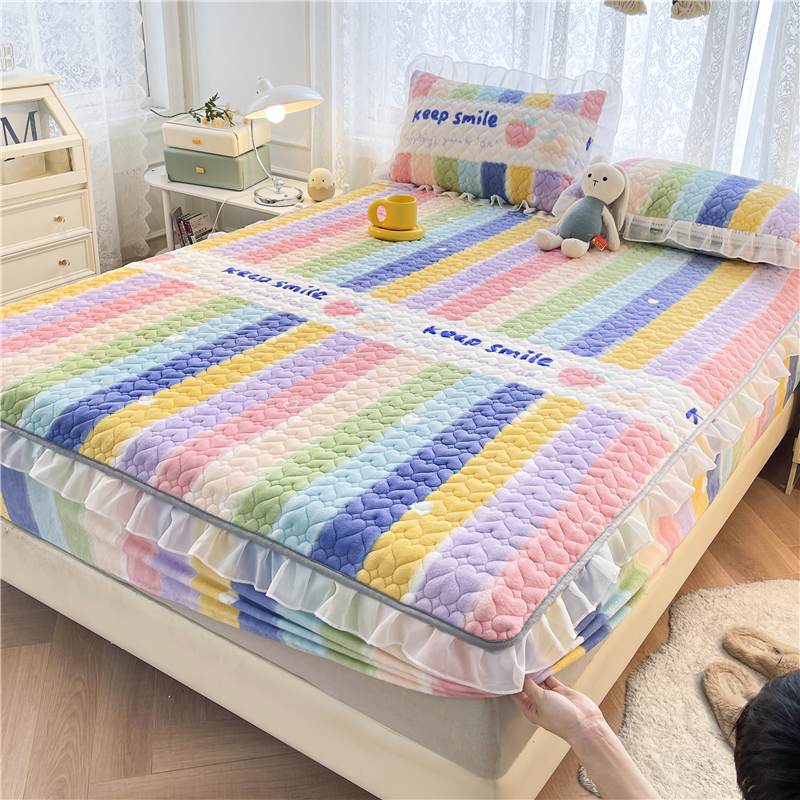 喜居 2023新款印花牛奶绒床笠花边款牛奶绒床笠大豆夹棉床笠 彩虹桃子