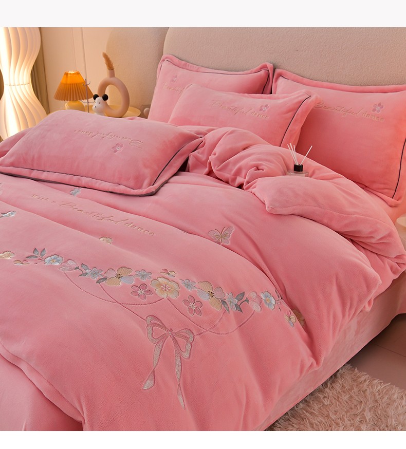 畅畅家纺 2023高克重牛奶绒刺绣花四件套金貂法莱宝宝水晶雪花绒四件套 花海-樱花粉