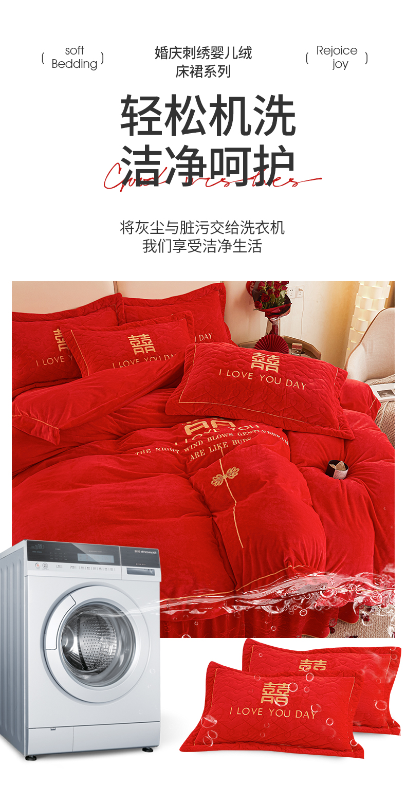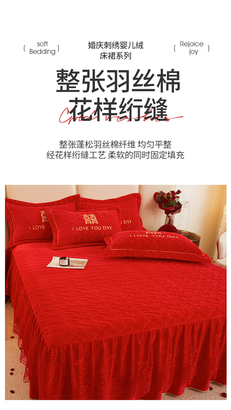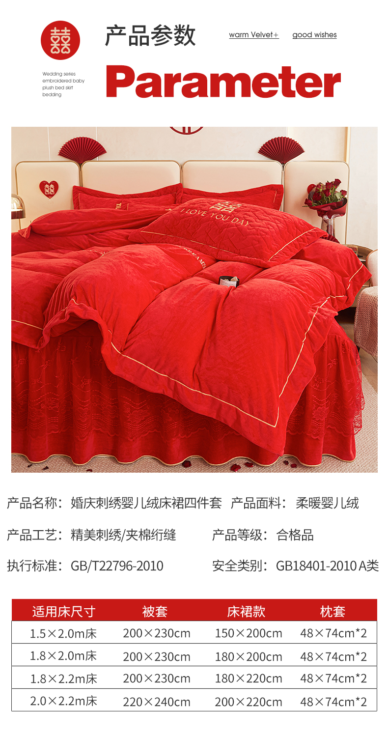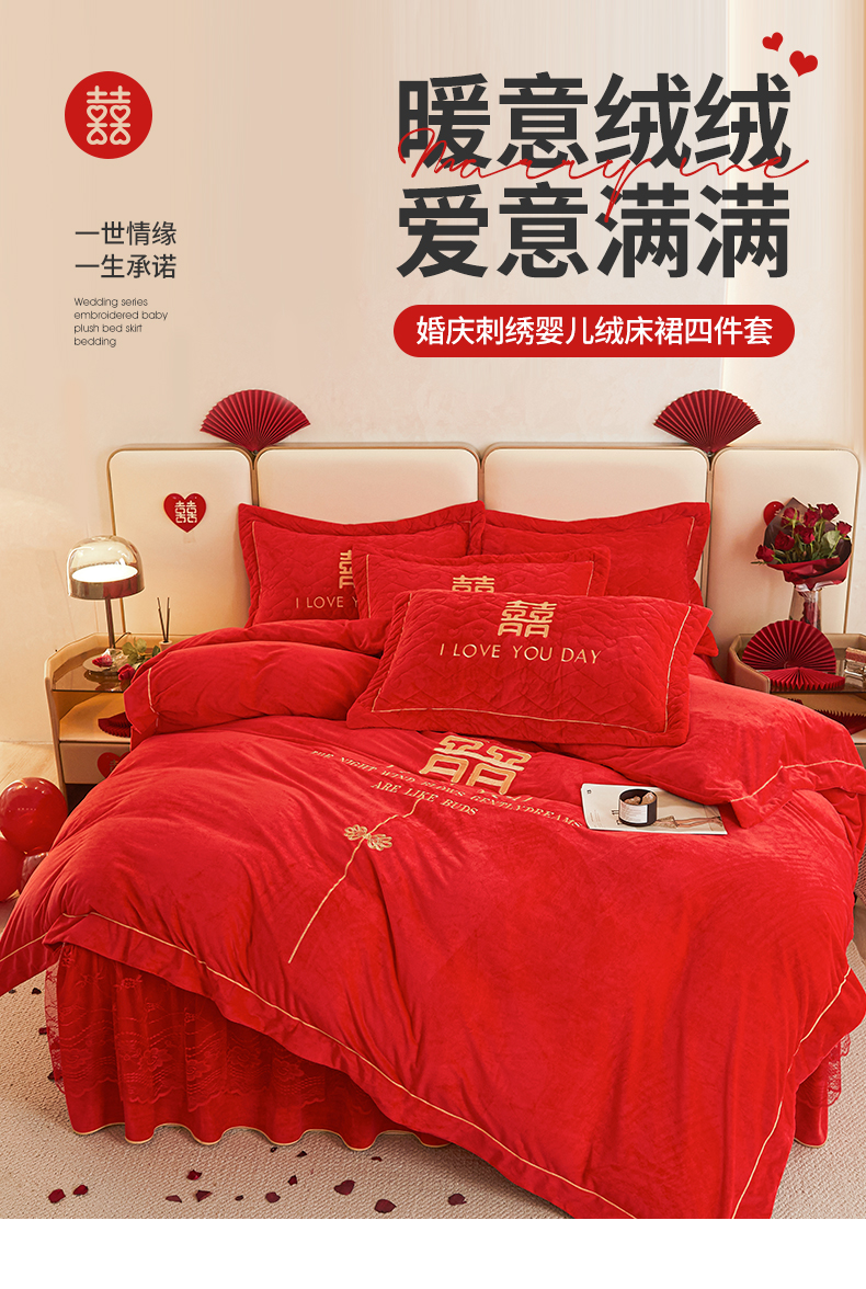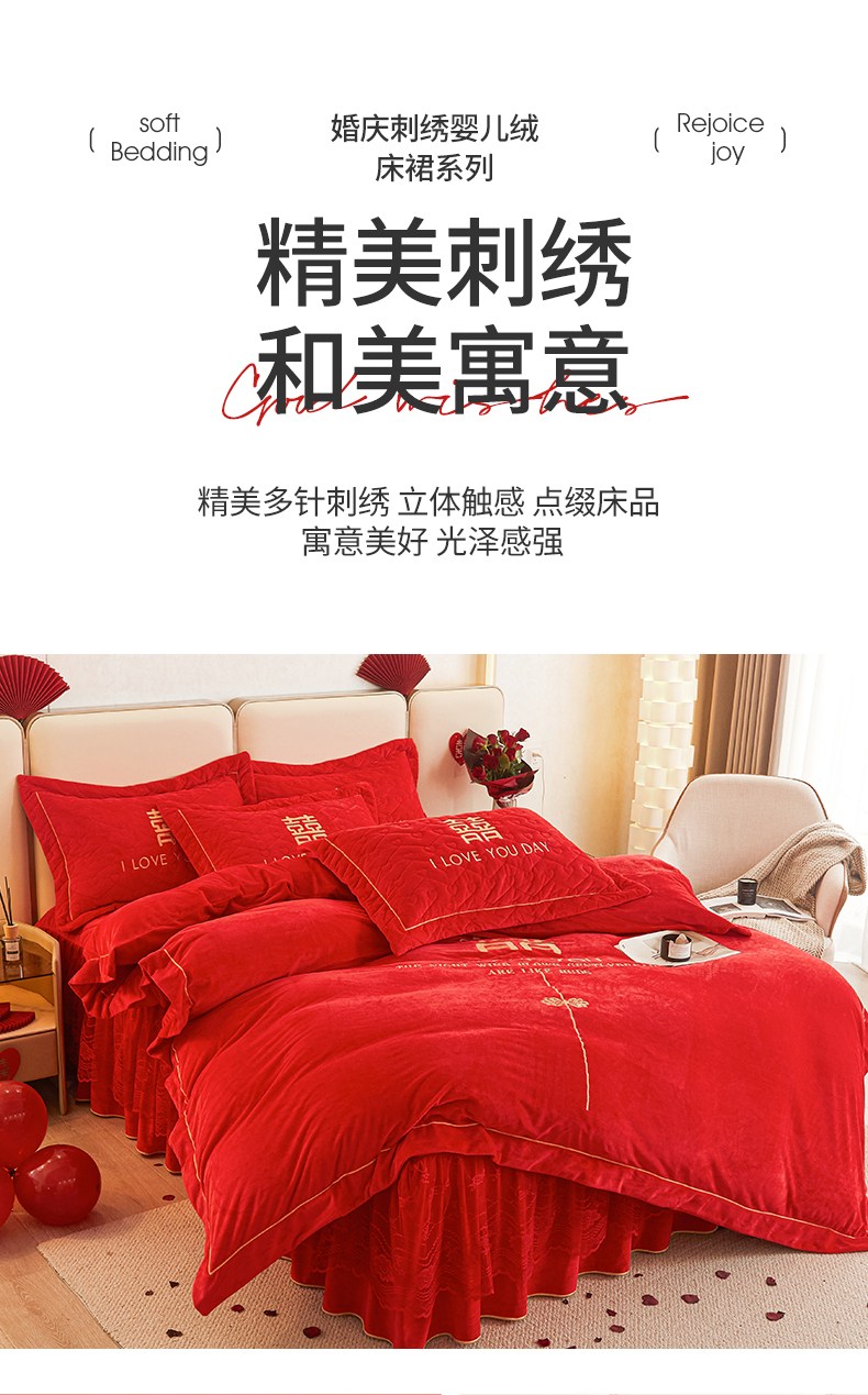 当前位置: 91家纺网 > 商品网购 > 床品套件 > 四件套 > 宜凡家纺 2023秋冬新品新品婴儿绒婚庆床裙四件套 和美祝福