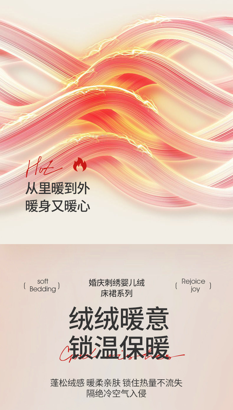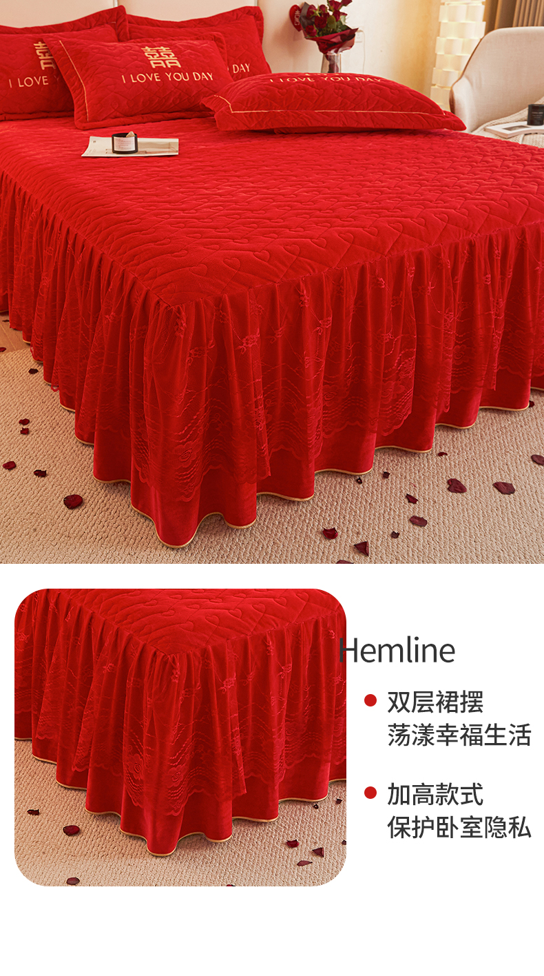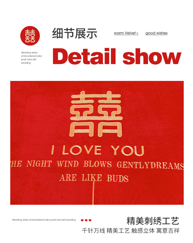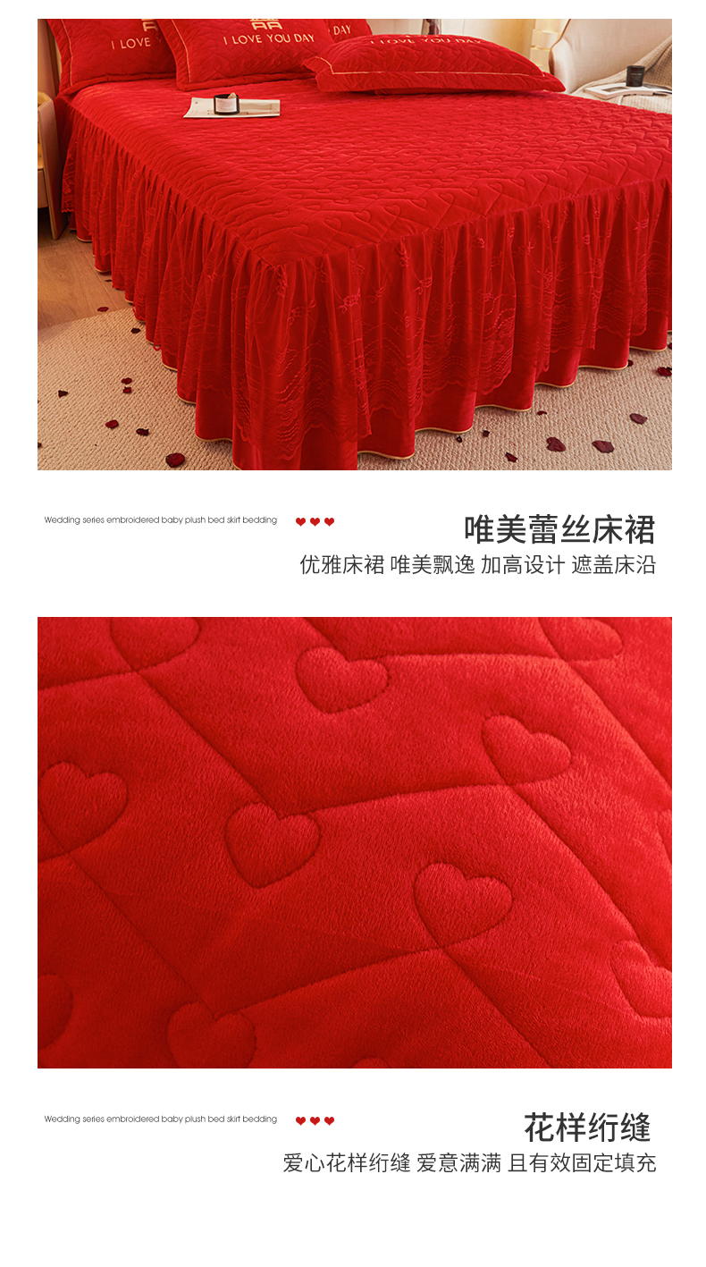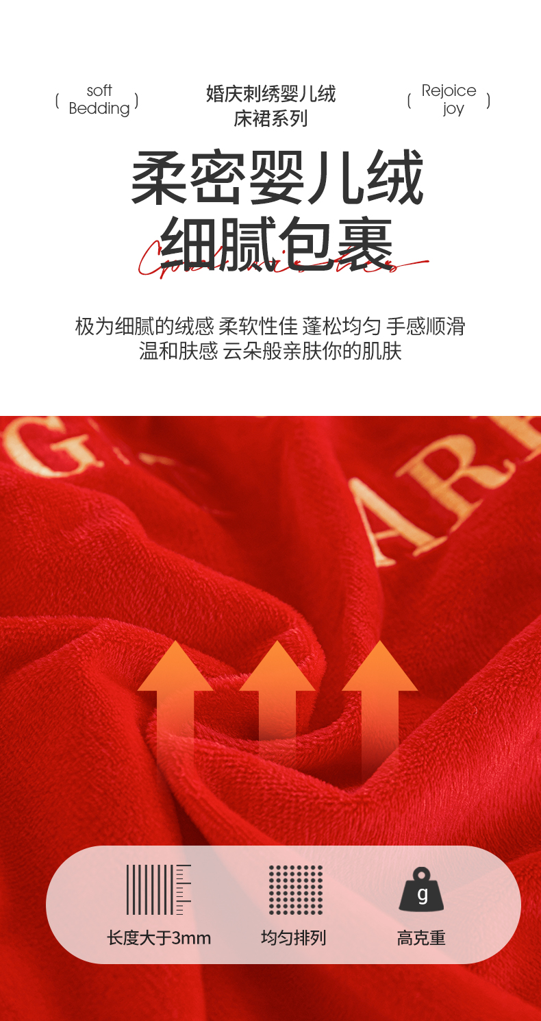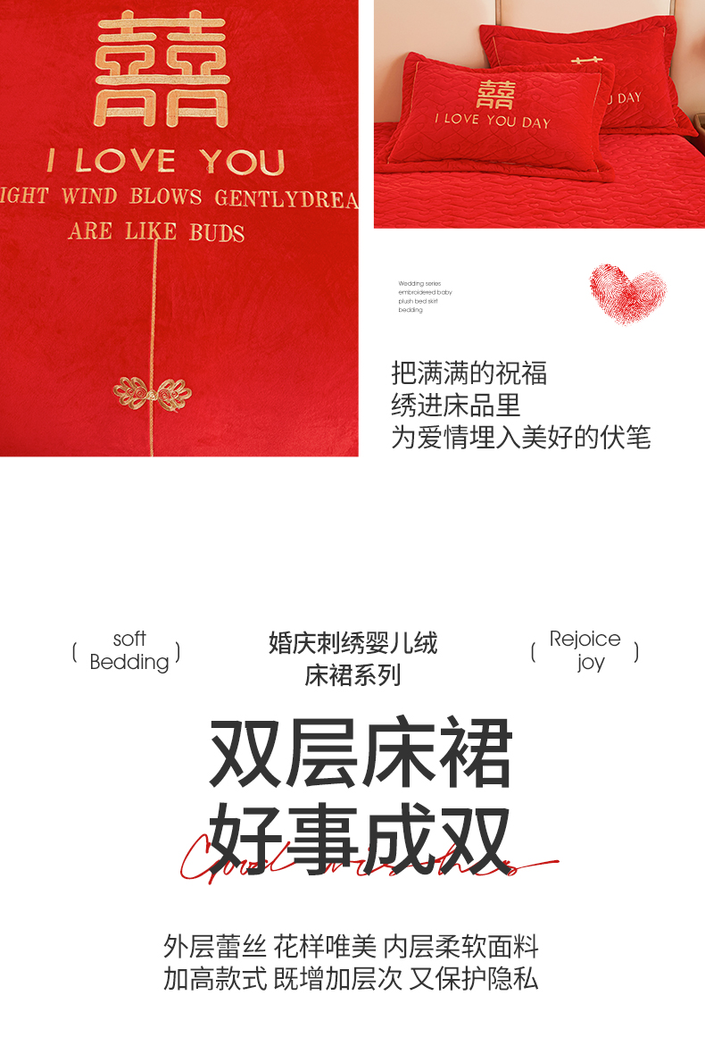 当前位置: 91家纺网 > 商品网购 > 床品套件 > 四件套 > 宜凡家纺 2023秋冬新品新品婴儿绒婚庆床裙四件套 和美祝福