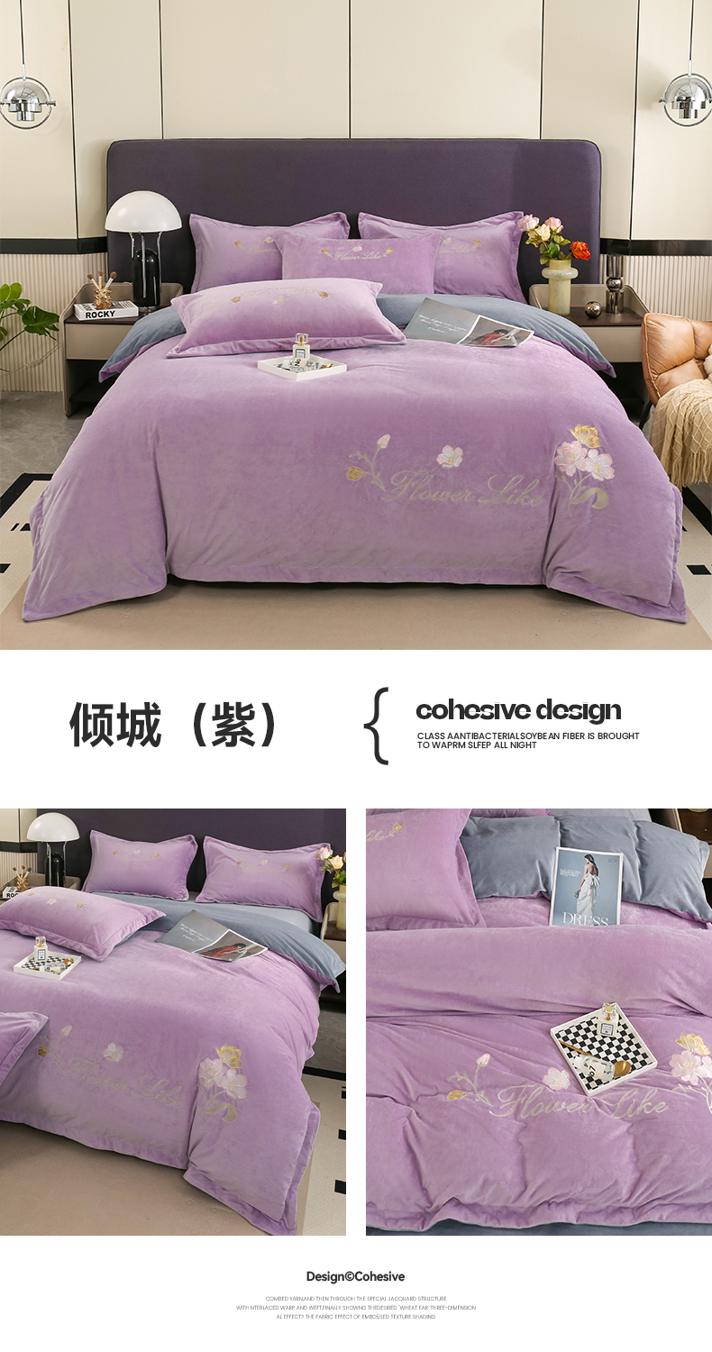 商品名称:银石 2023新款高克重婴儿绒宝宝绒轻奢绣花四件套 倾城 倾城(紫)