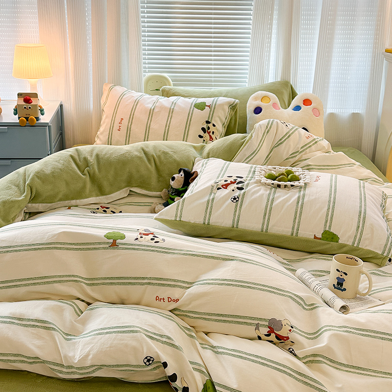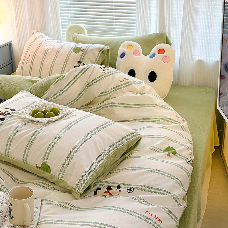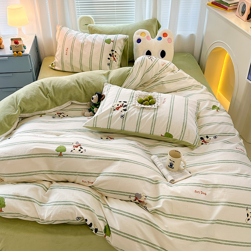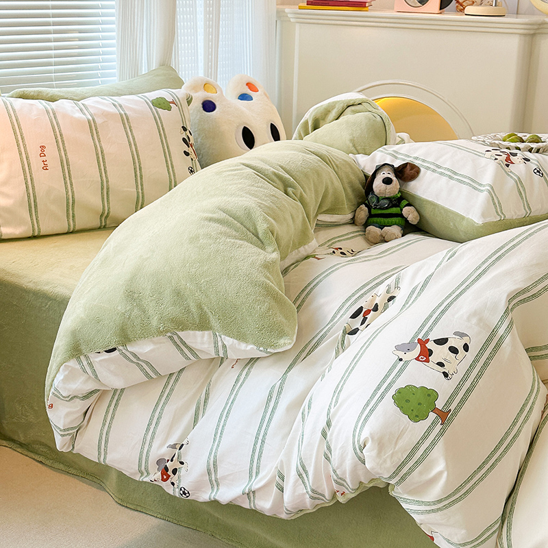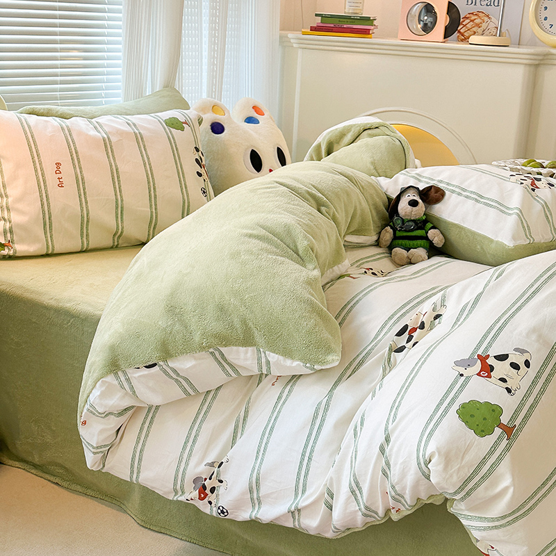 昔可家纺 2023新款y2k卡通印花系列棉加绒四件套 绿条狗狗