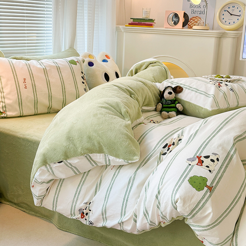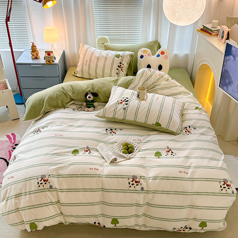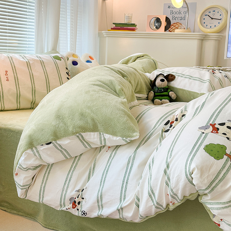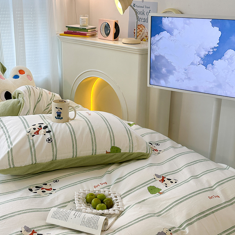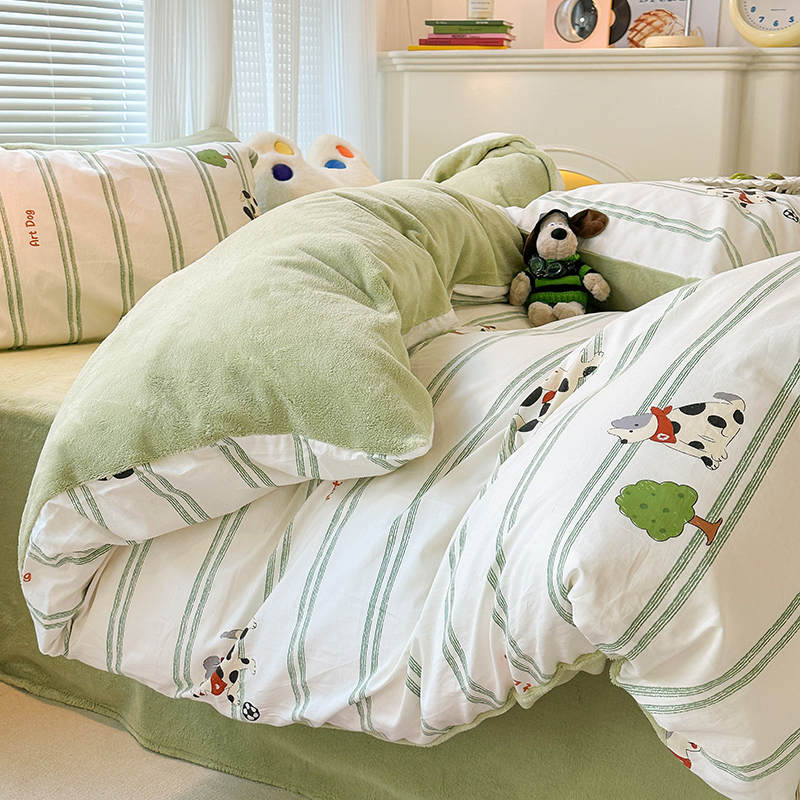 昔可家纺 2023新款y2k卡通印花系列棉加绒四件套 绿条狗狗