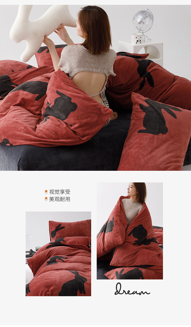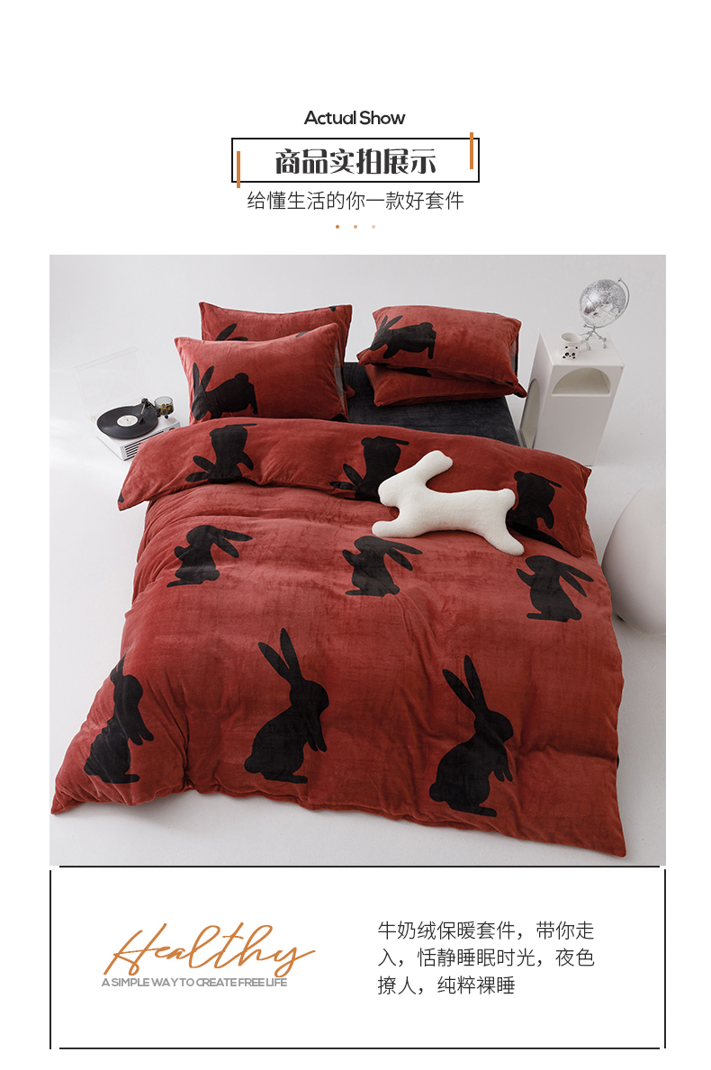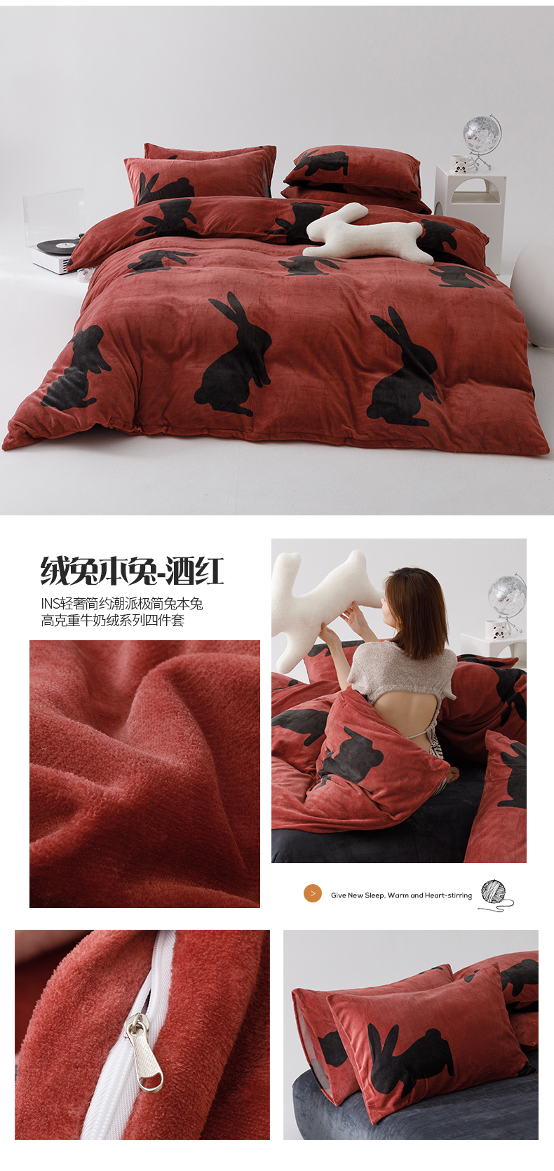 商品名称:桃子2023新款ins轻奢简约潮派极简高级时尚兔本兔高克重牛奶绒系列四件套 绒兔本兔-酒红