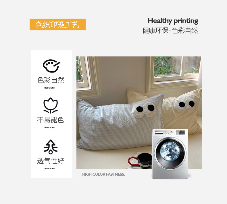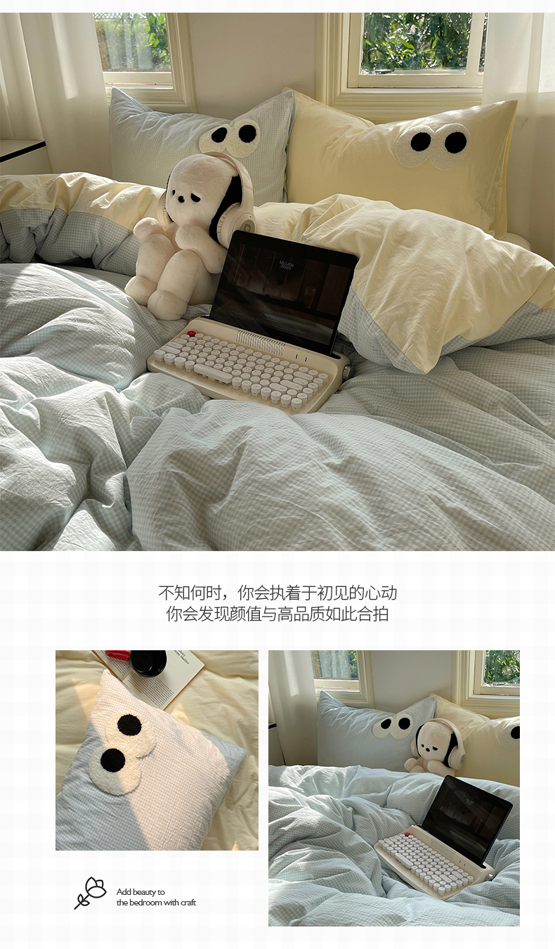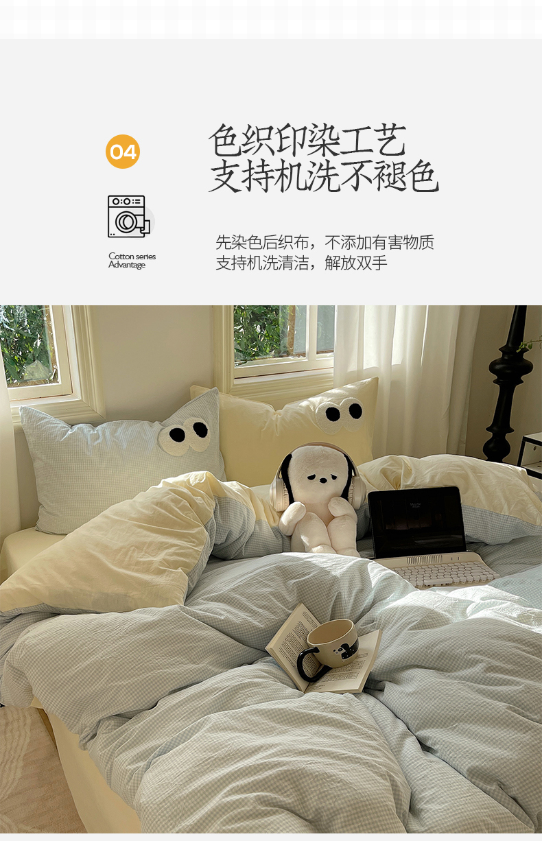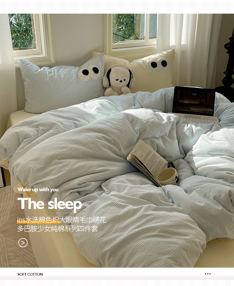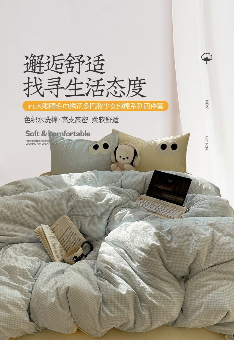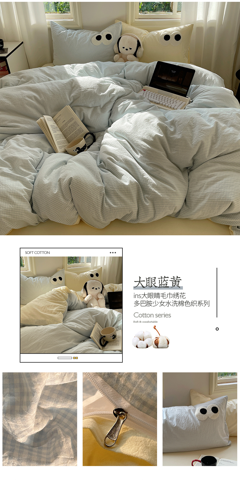 商品名称:2023新款ins水洗棉色织大眼睛毛巾绣花多巴胺少女纯棉系列四件套 水洗棉-大眼蓝黄