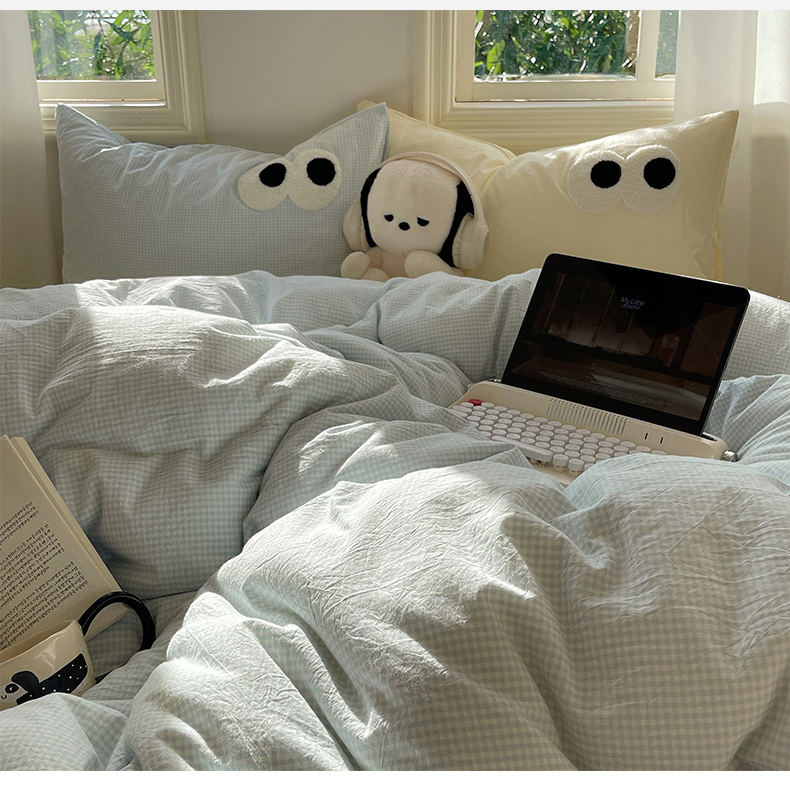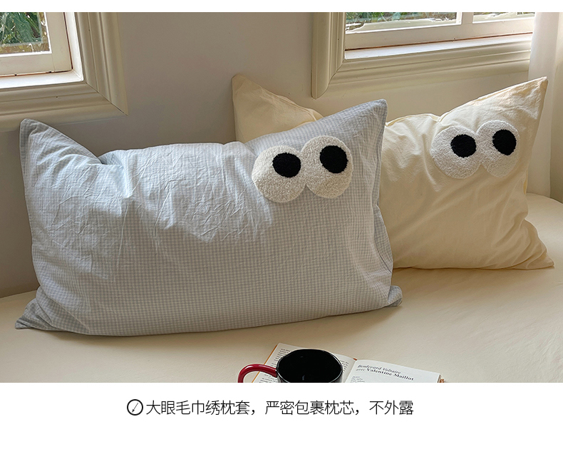 2023新款ins水洗棉色织大眼睛毛巾绣花多巴胺少女纯棉系列四件套 水洗棉-大眼蓝黄