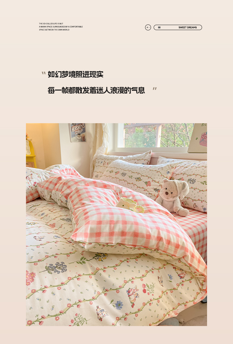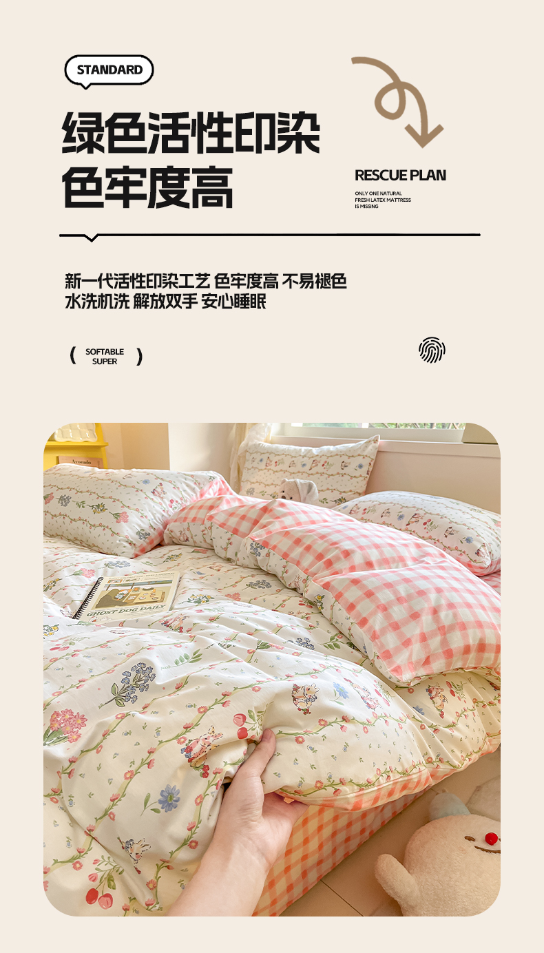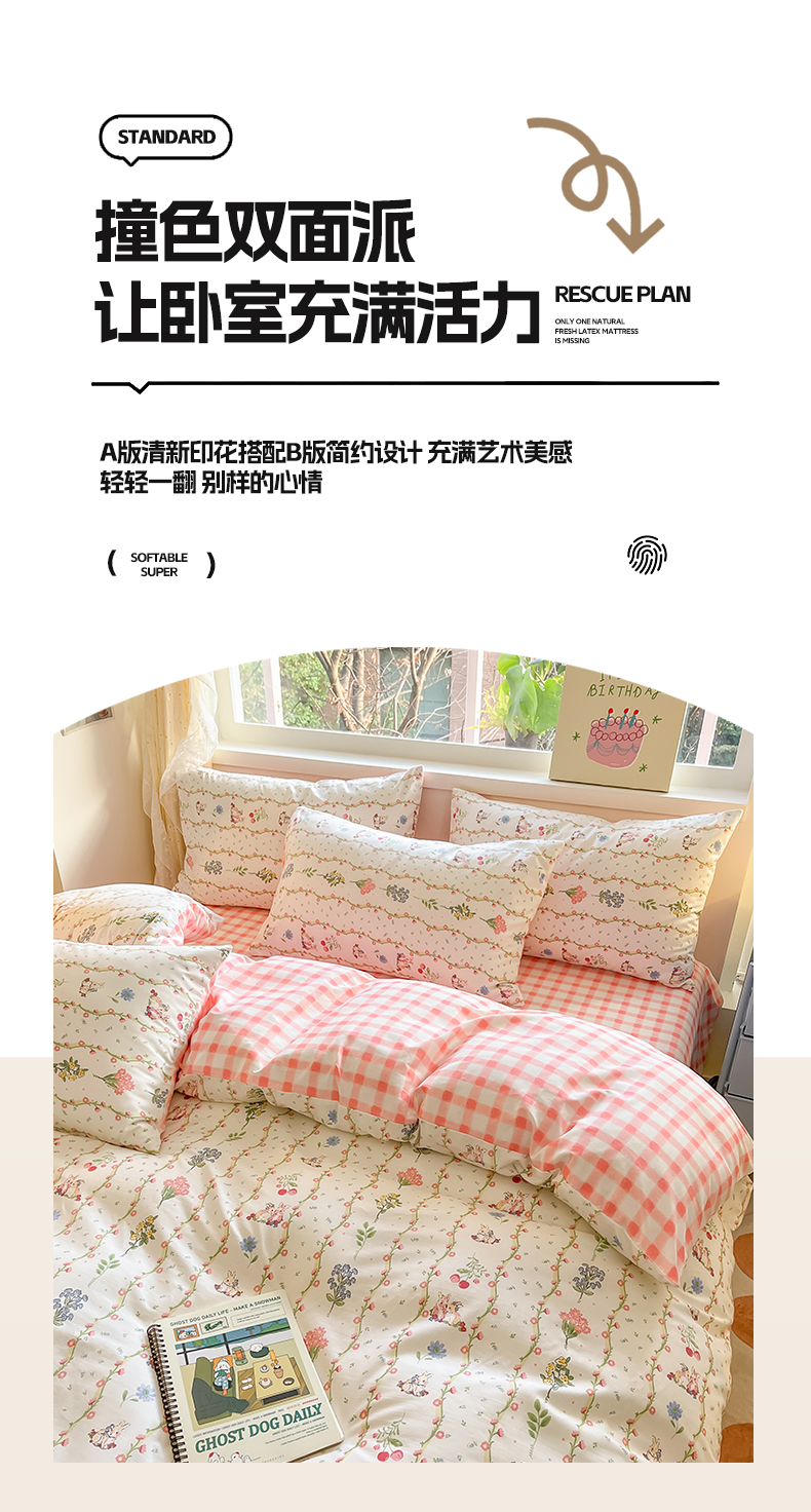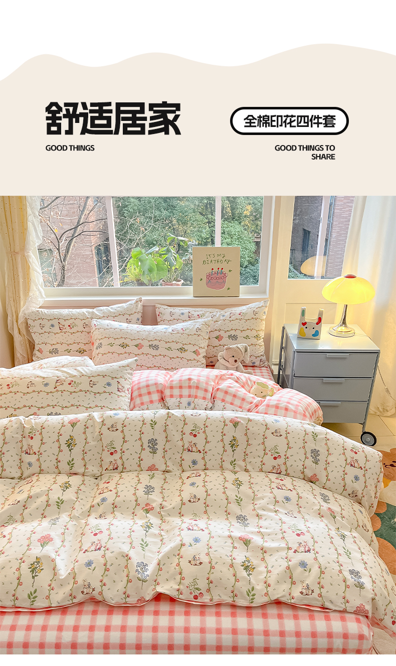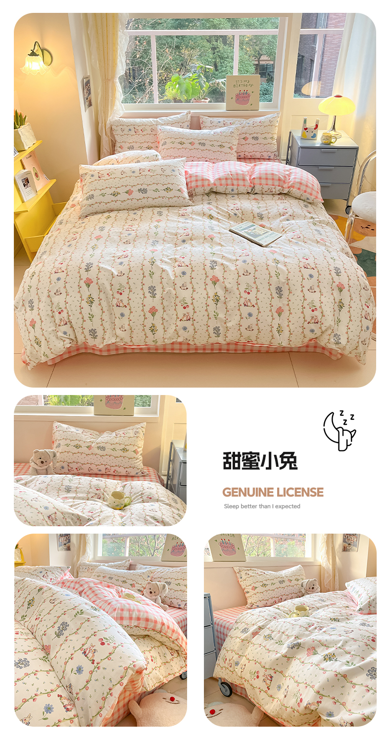 商品名称:雅居纺 2024新款高密全棉13070印花四件套 甜蜜小兔