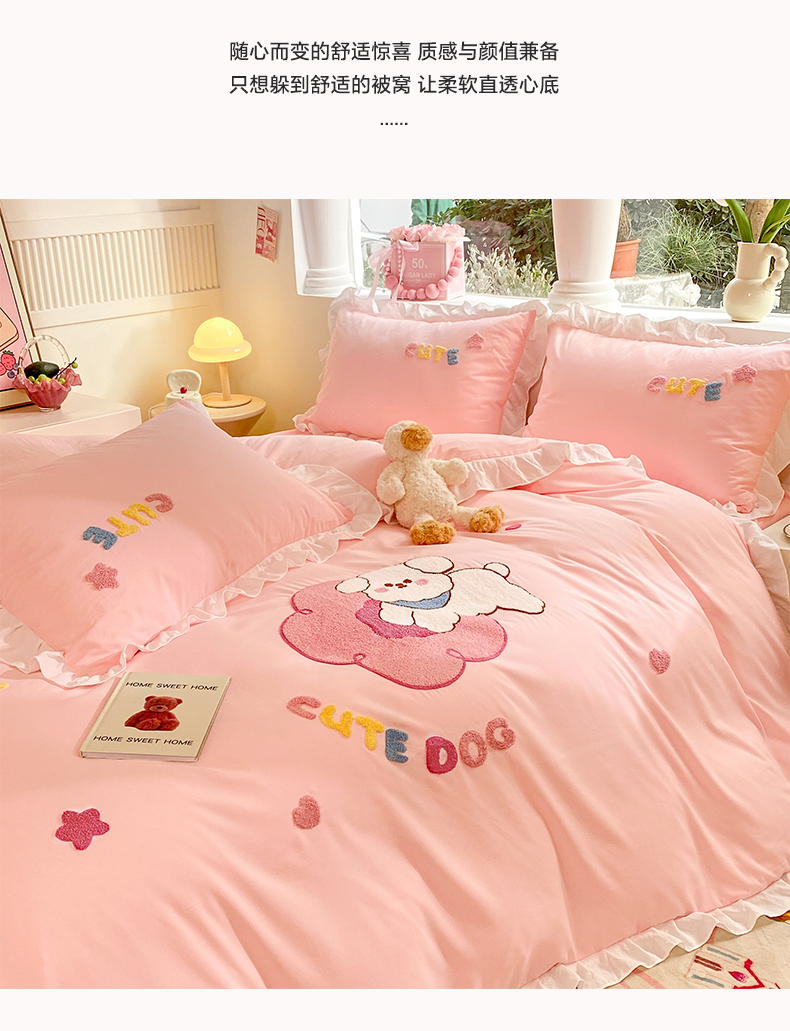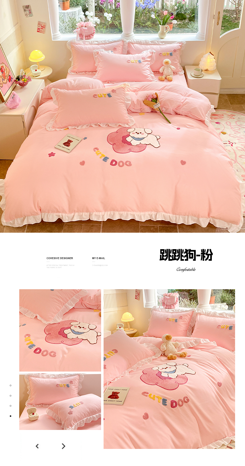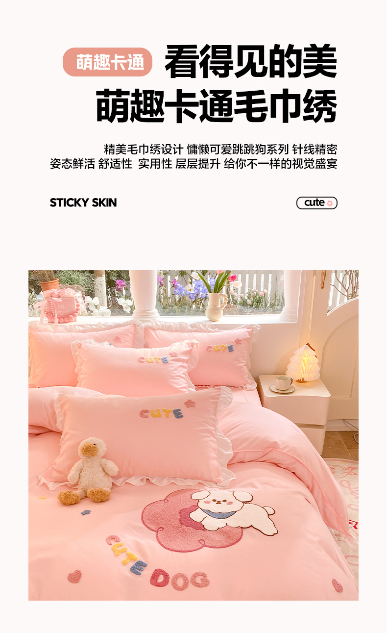 当前位置: 91家纺网 > 商品网购 > 床品套件 > 四件套 > 毛巾绣四件套 > (总)易禾家纺 2024新款专板花型亲肤水洗棉毛巾绣四件套-跳跳狗