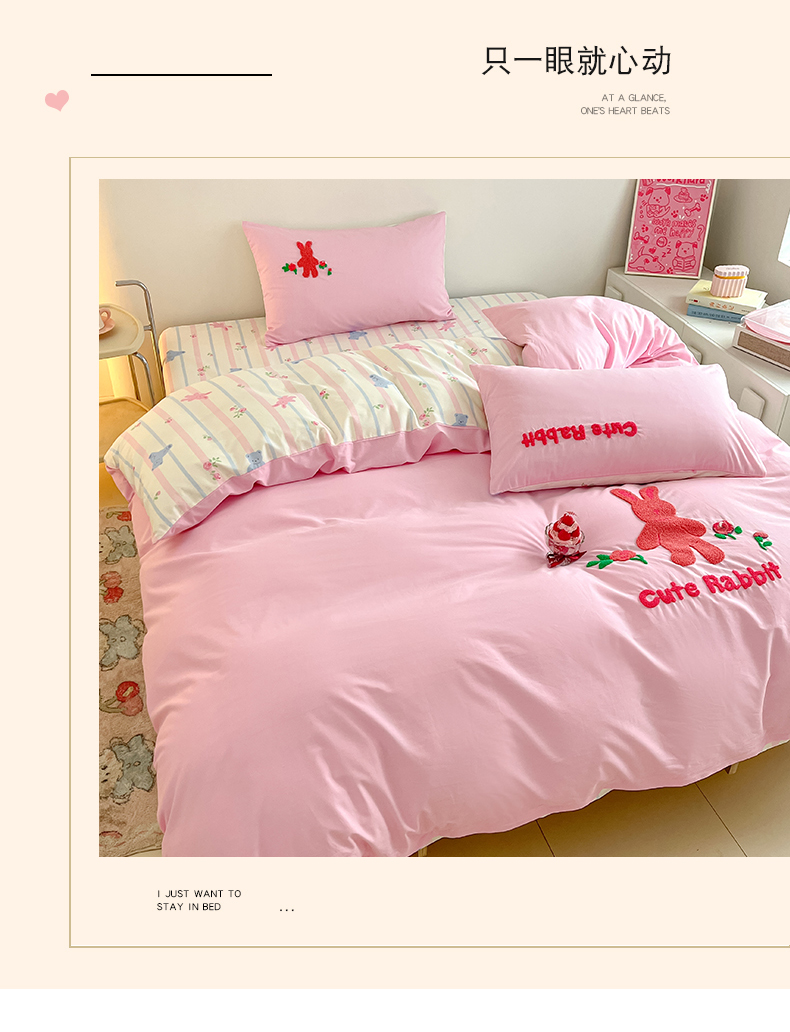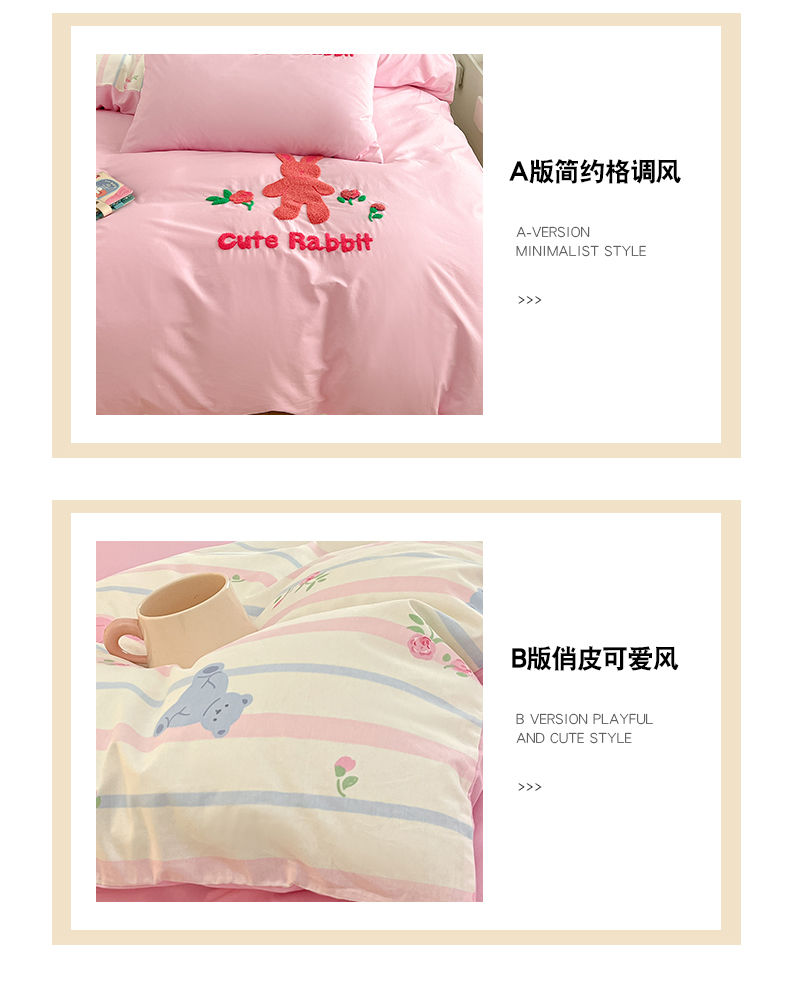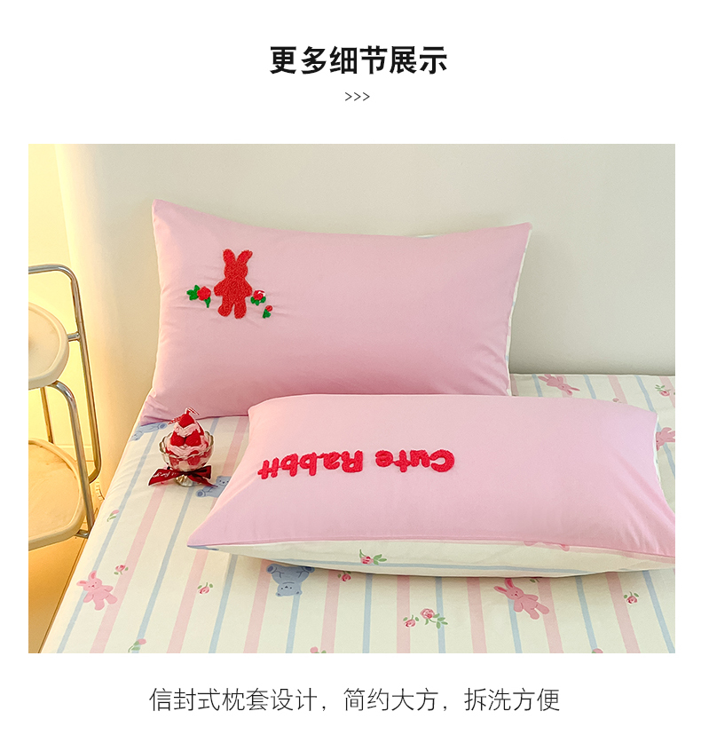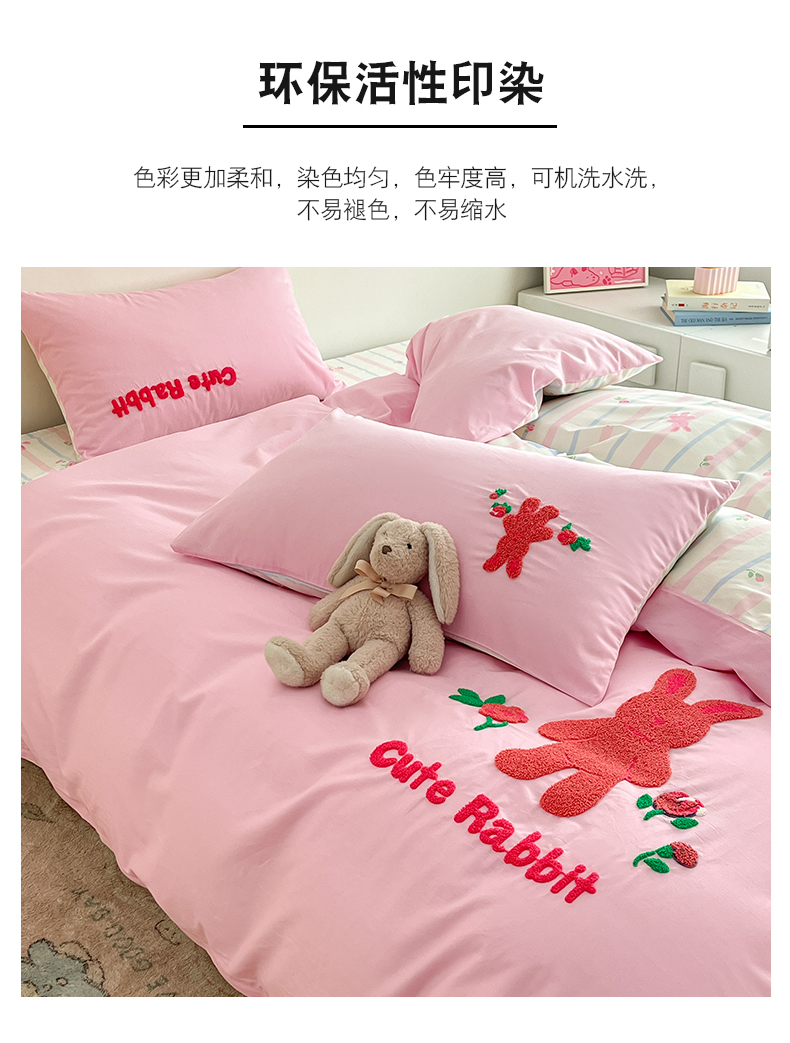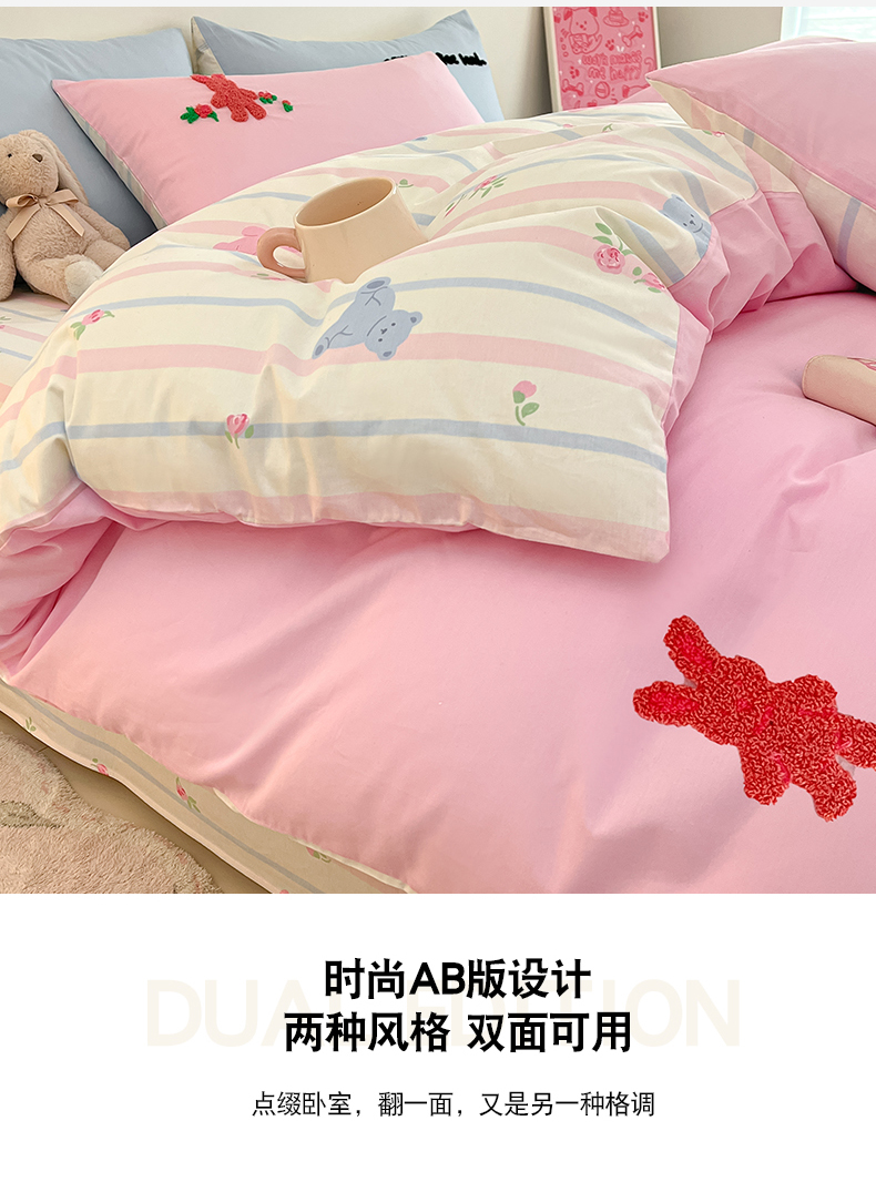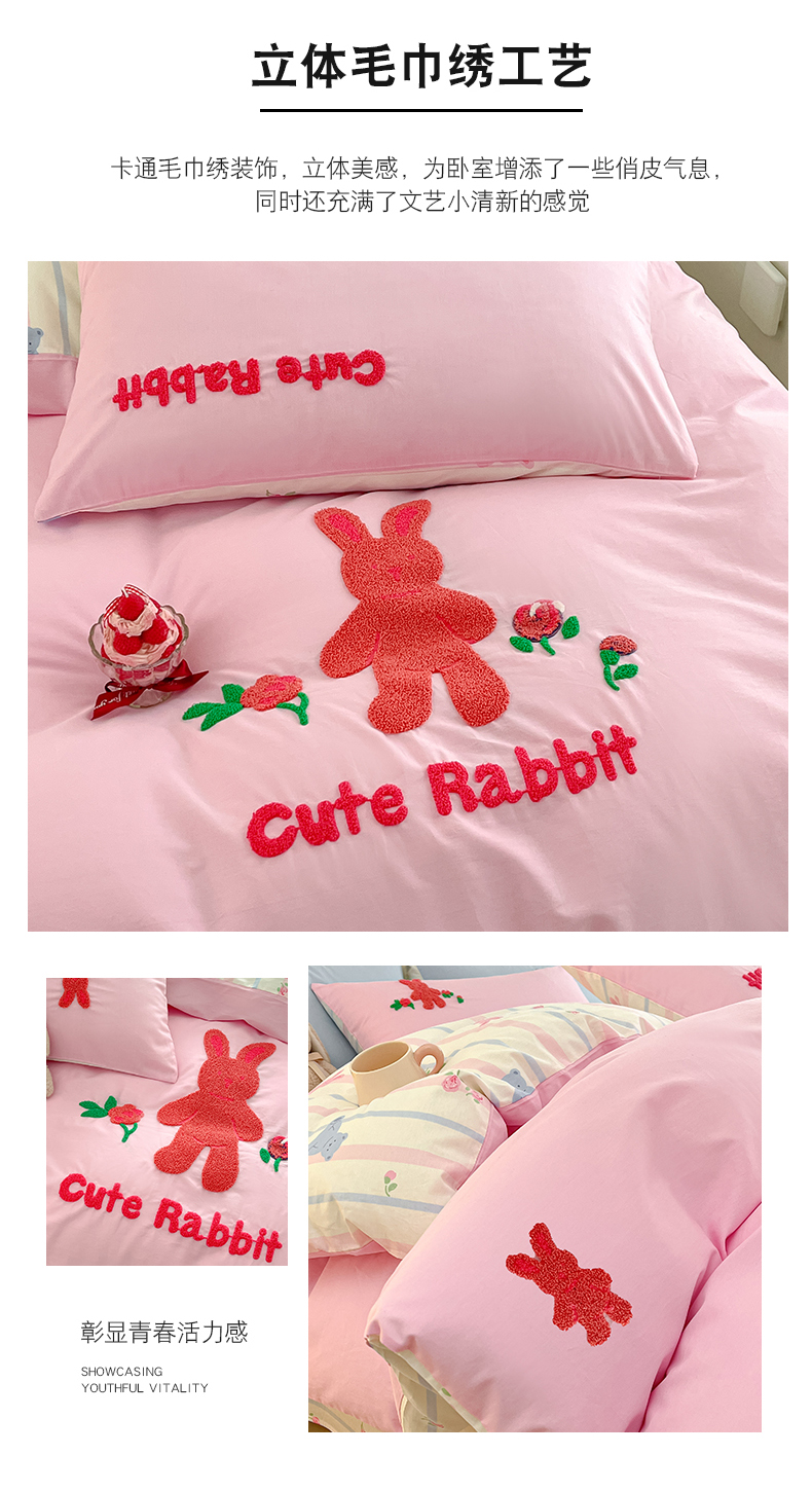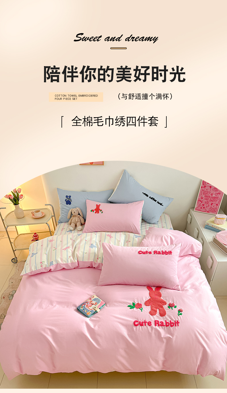商品名称:金丝鸟家纺 2024新款全棉混搭毛巾绣四件套可爱卡通库洛米系列 粉色条纹布偶熊