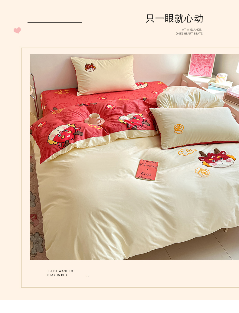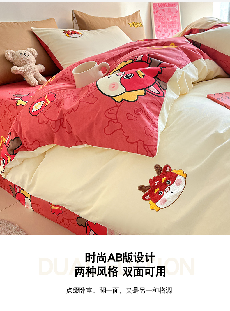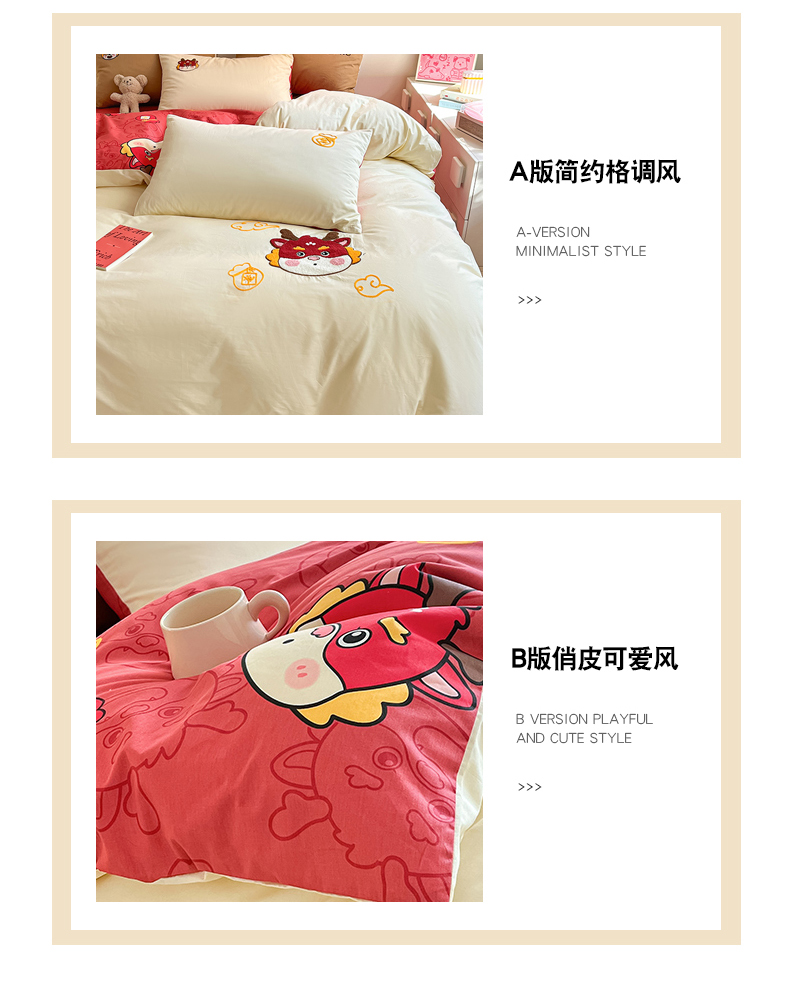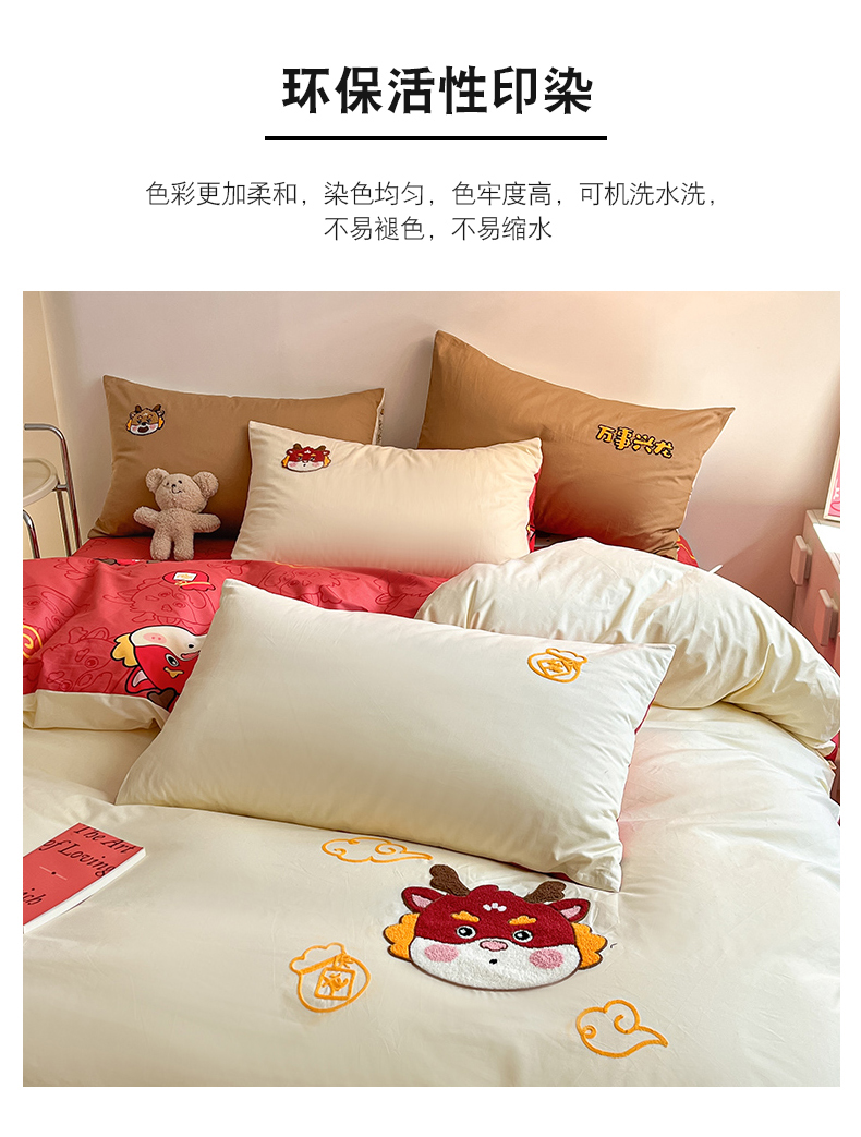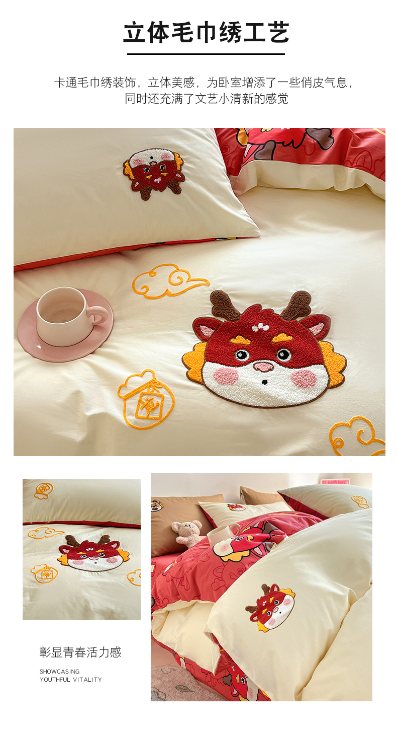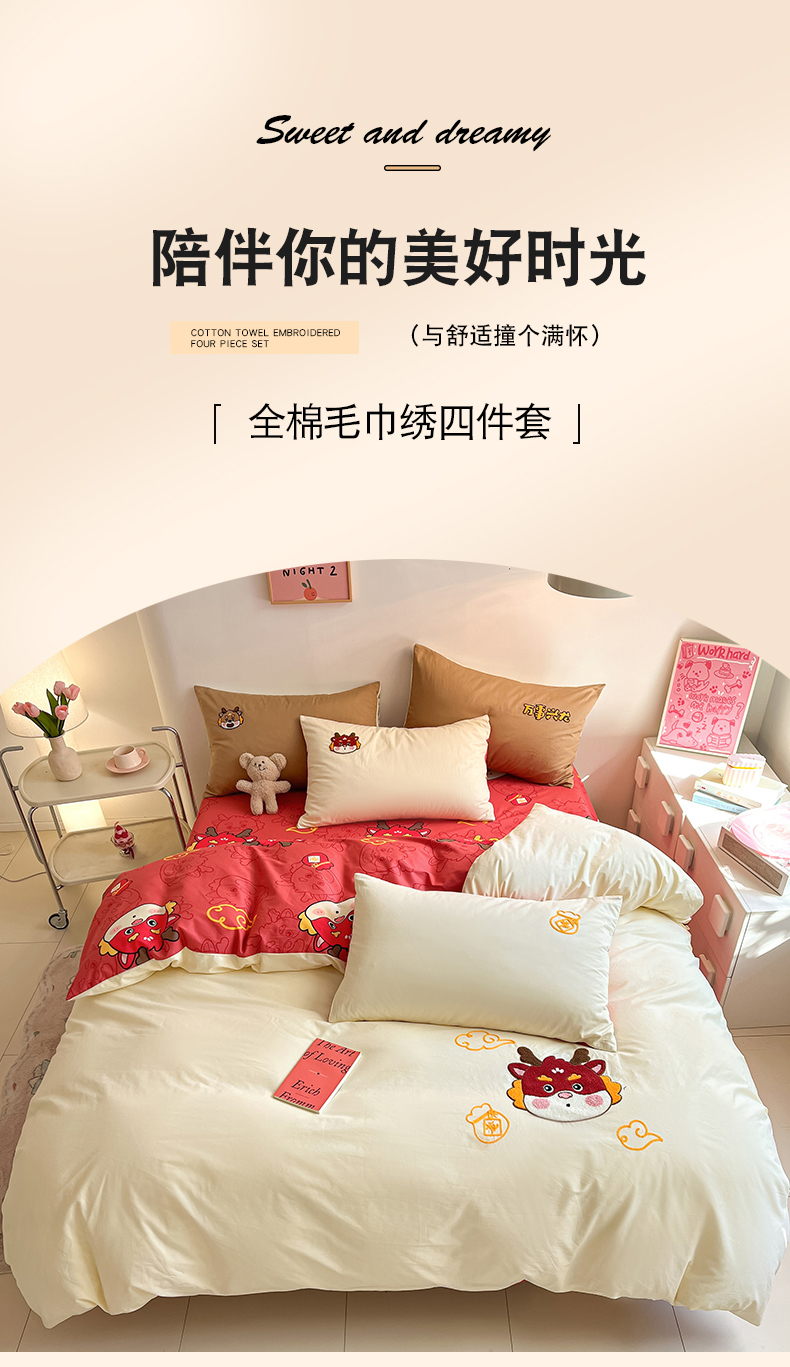 商品名称:金丝鸟家纺 2024新款全棉混搭毛巾绣四件套可爱卡通库洛米系列 米色福袋龙