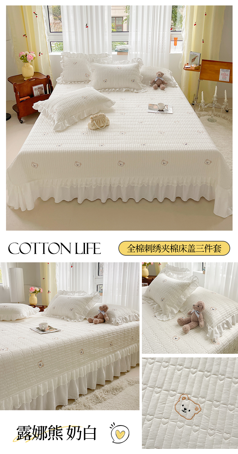 商品名称:宜凡家纺 2024新款全棉夹棉绣花花边系列床盖三件套 露娜熊-奶白