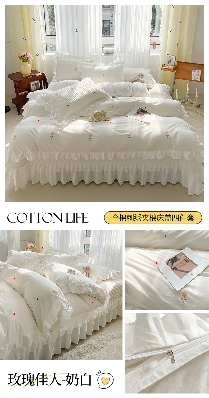 宜凡家纺 2024新款全棉夹棉绣花花边系列床盖四件套 玫瑰佳人-奶白