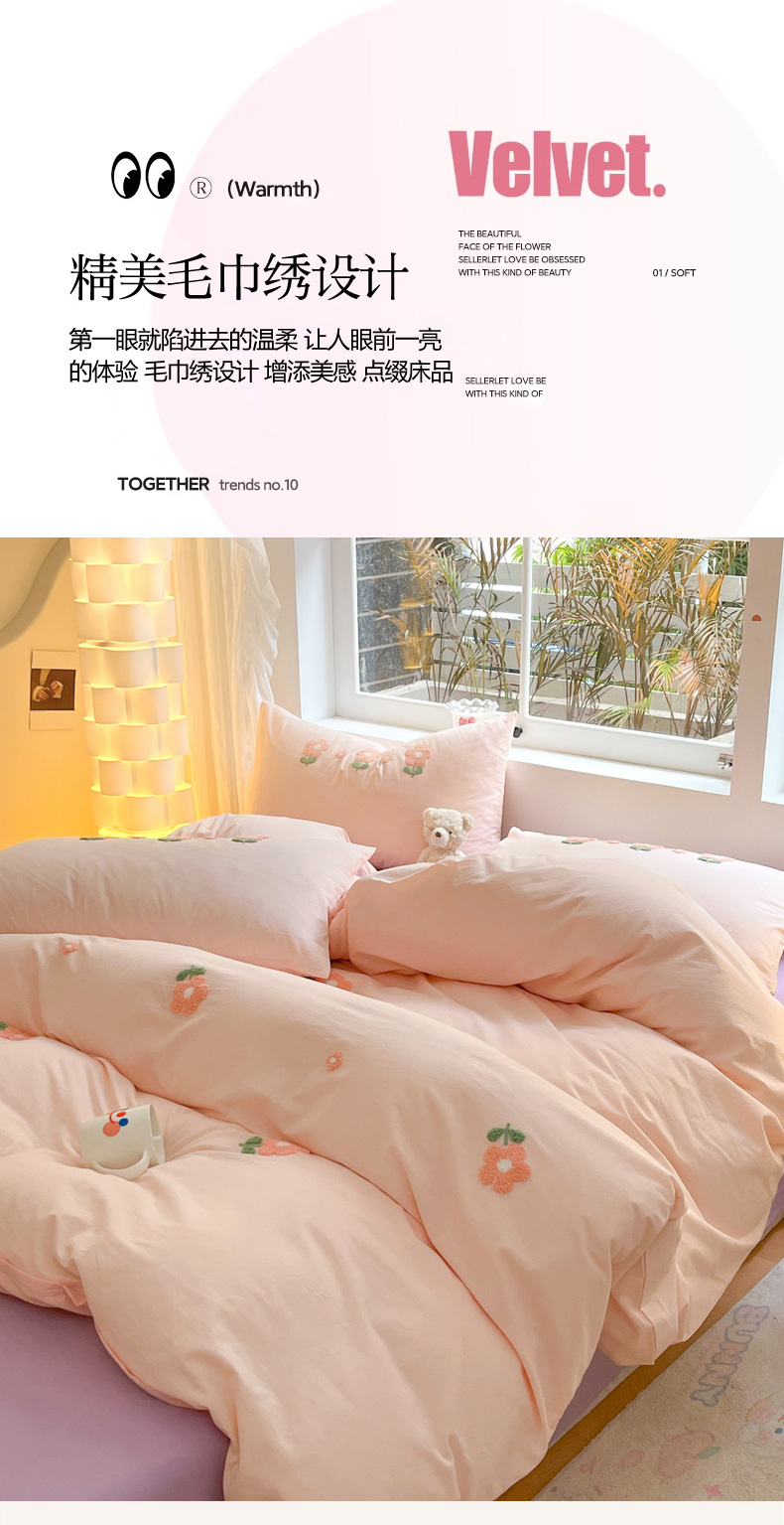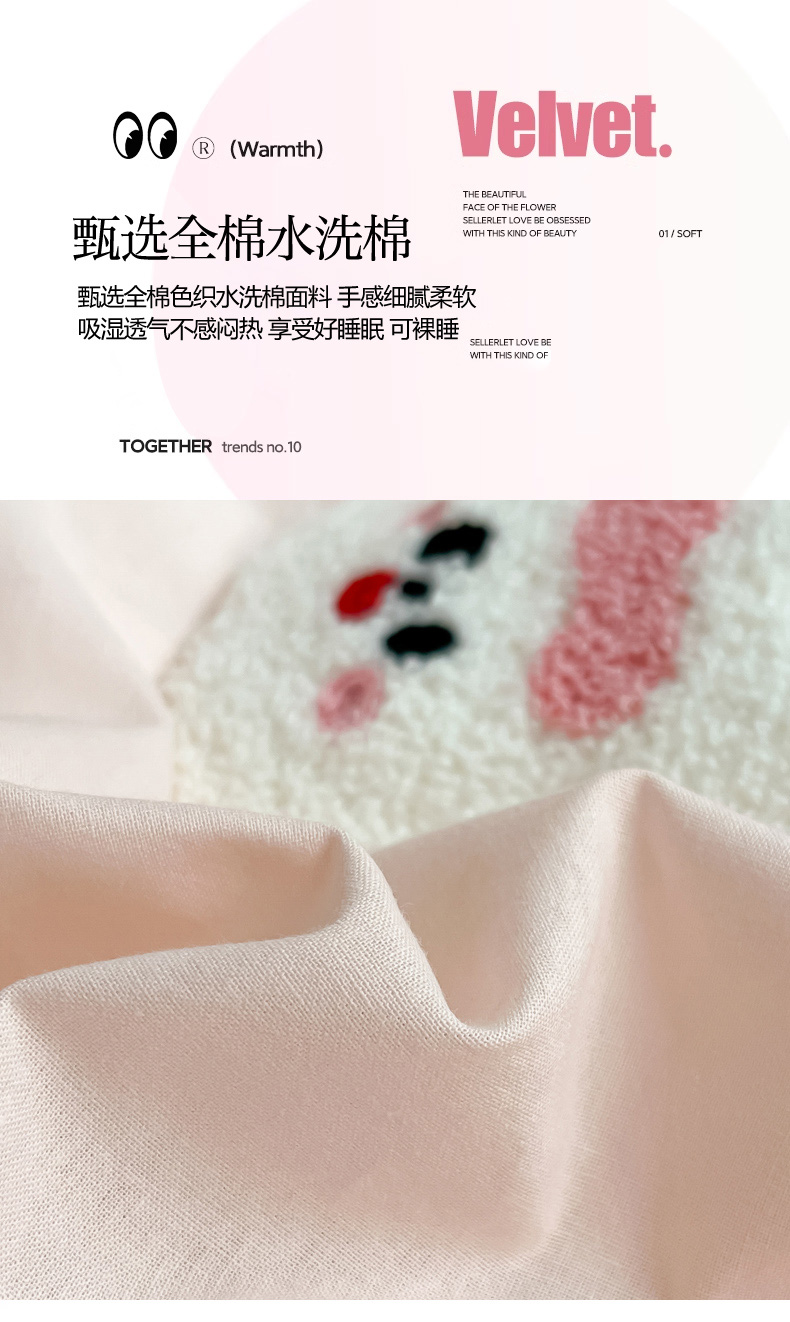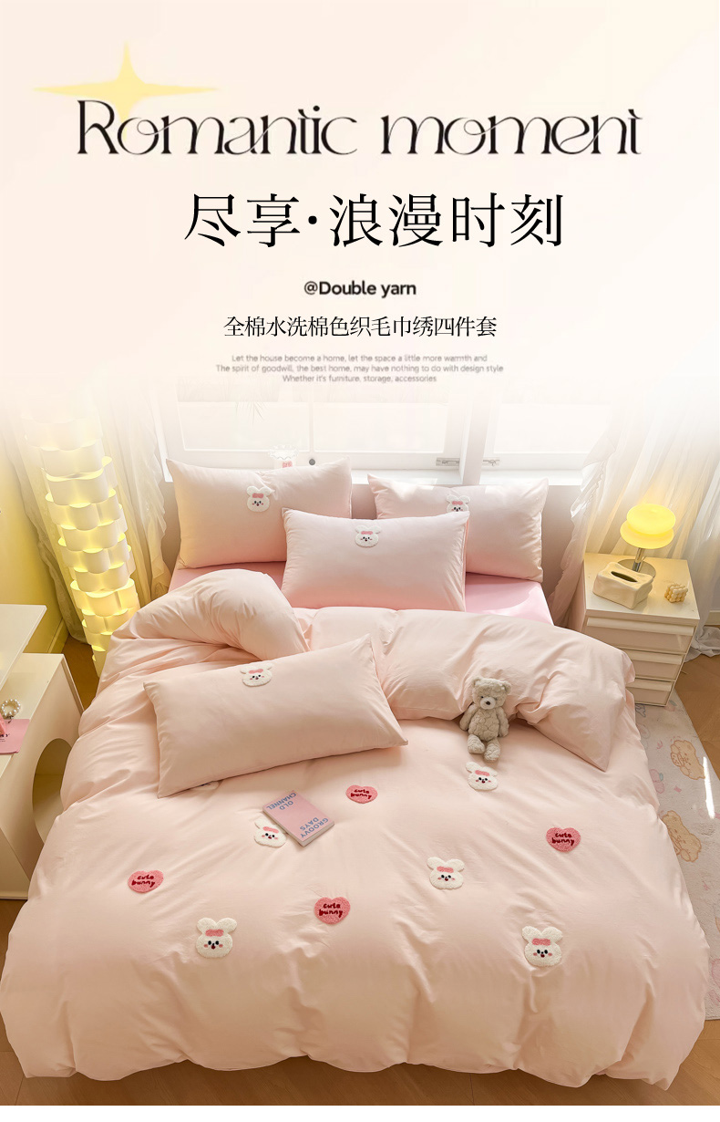 商品名称:寐居家纺 2024新款全棉水洗棉毛巾绣色织四件套 爱心兔-粉玉