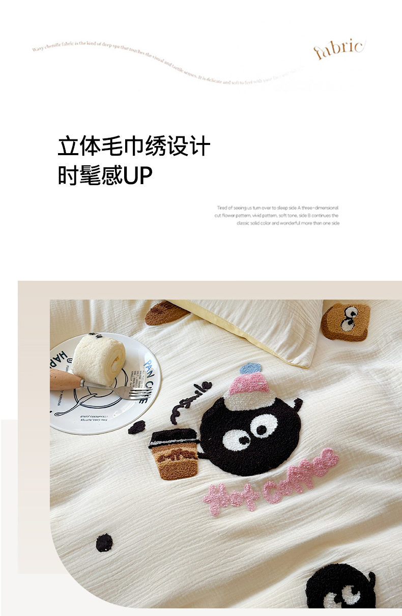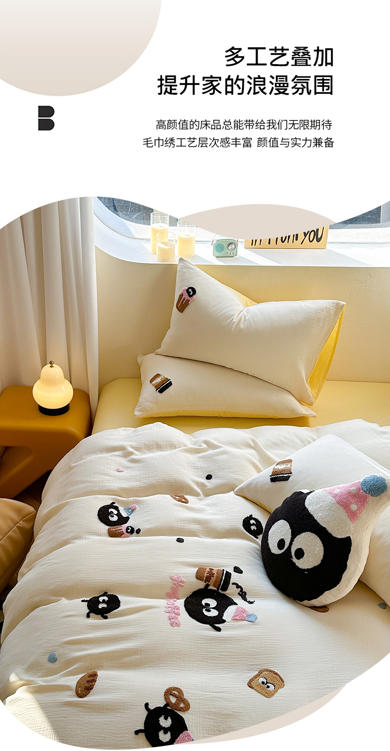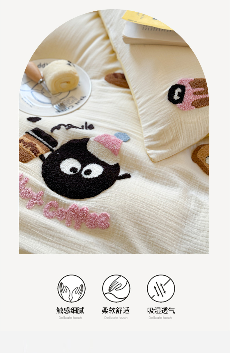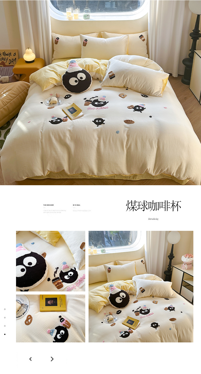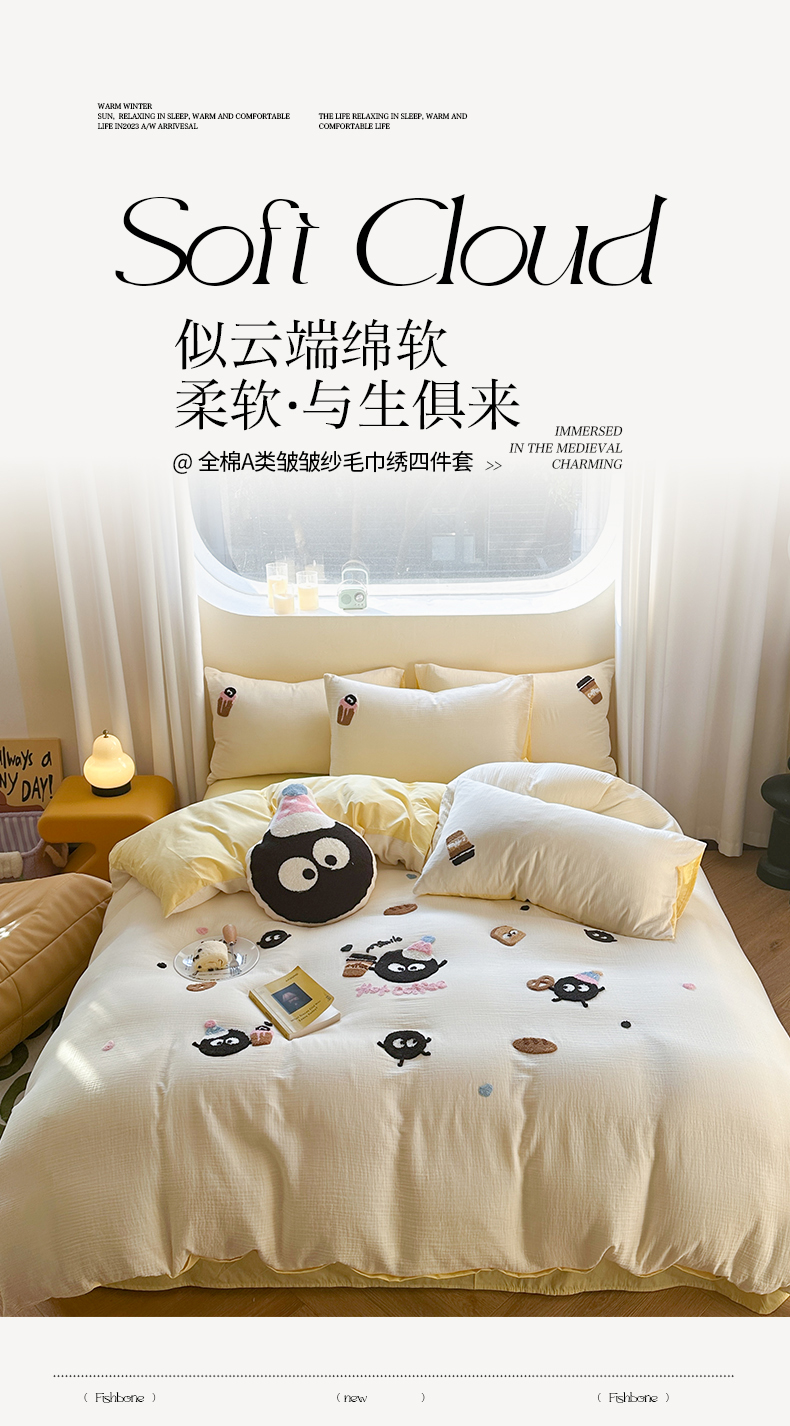 商品名称:眠屿 2024全棉A类皱皱纱毛巾绣四件套 煤球咖啡杯