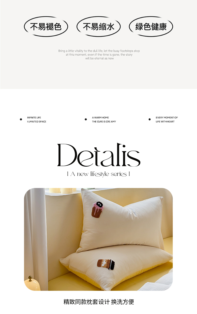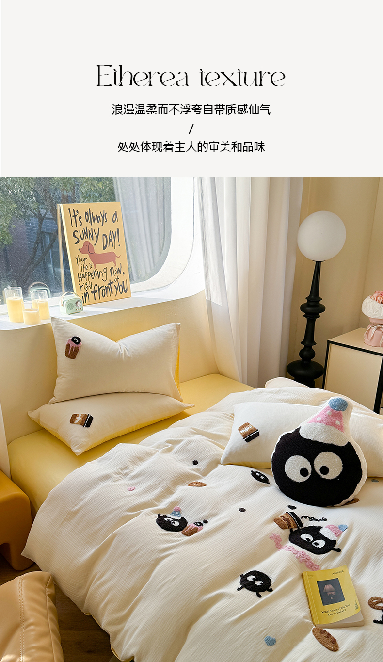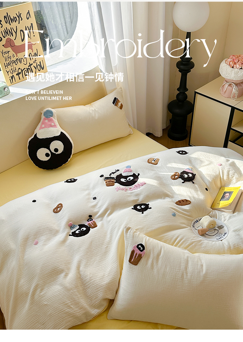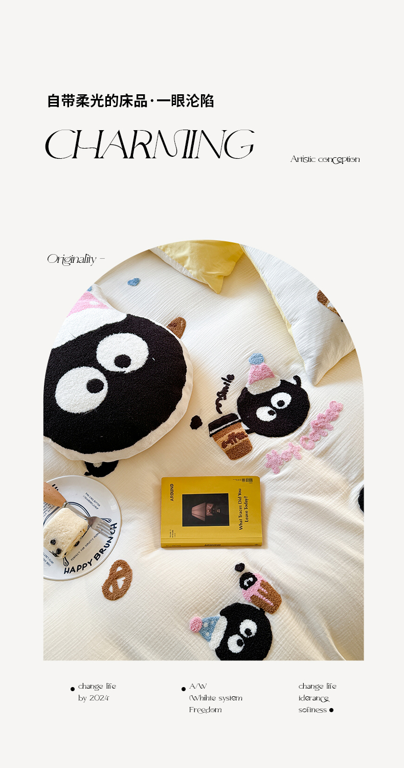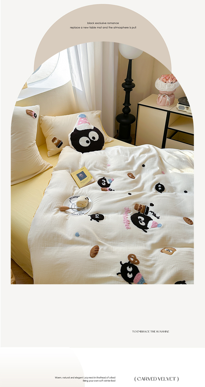 商品名称:眠屿 2024全棉A类皱皱纱毛巾绣四件套 煤球咖啡杯
