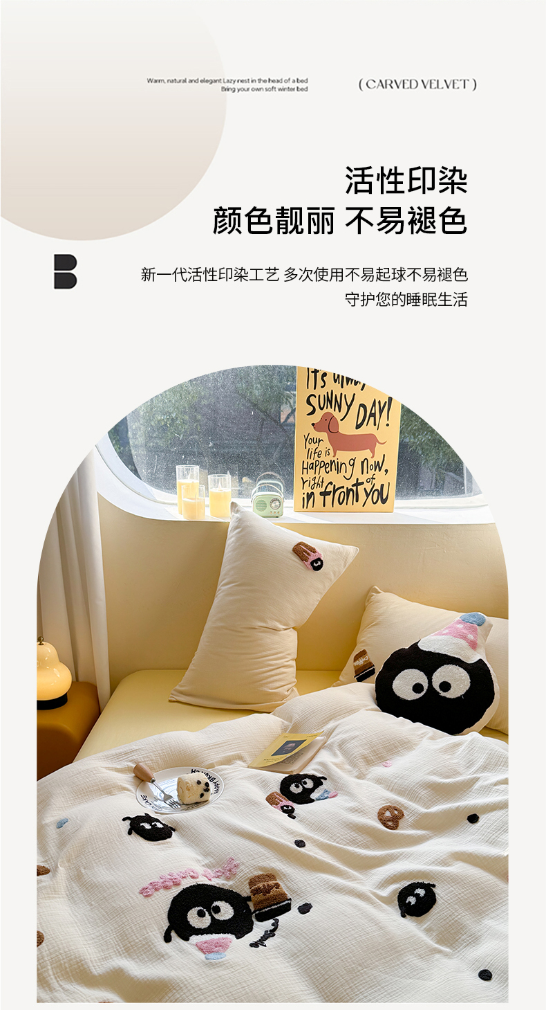 (总)眠屿家纺 2025新款加厚牛奶绒毛巾绣四件套,乐趣,面包狗,玩偶,玩泡泡