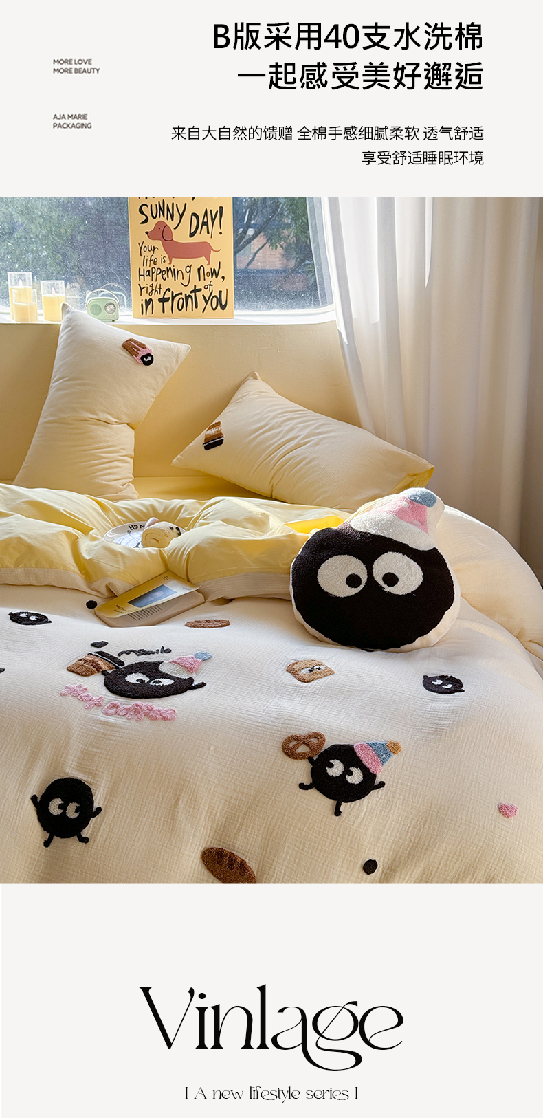 (总)眠屿家纺 2025新款全棉秋冬磨毛贴布绣四件套,爱心猫咪,蛋糕狗狗,可爱玩偶,热量100%