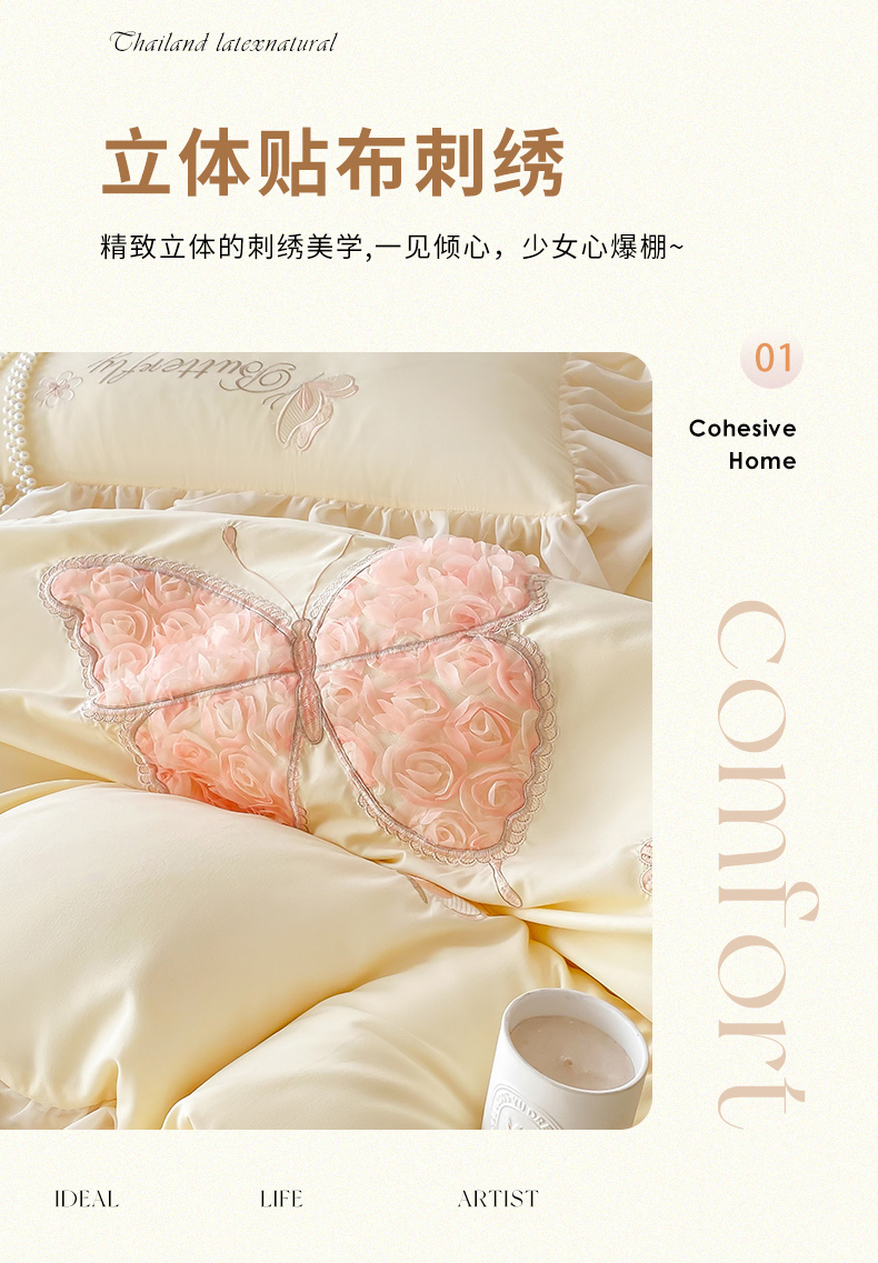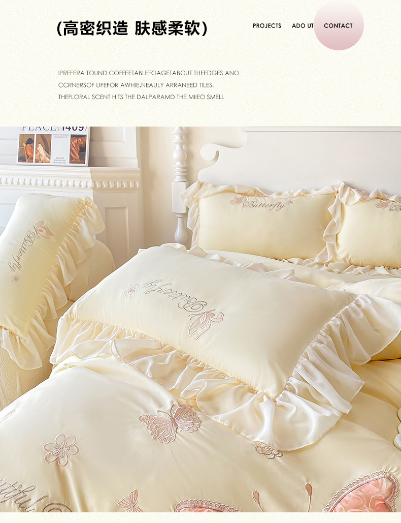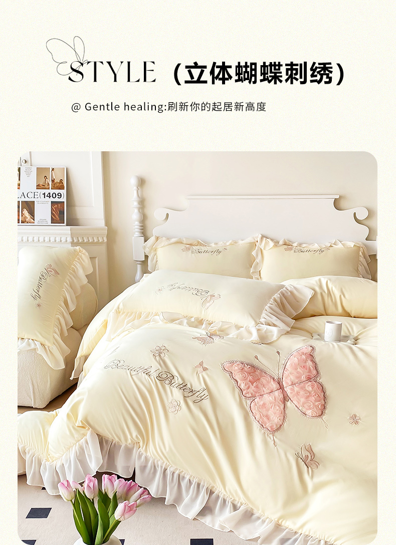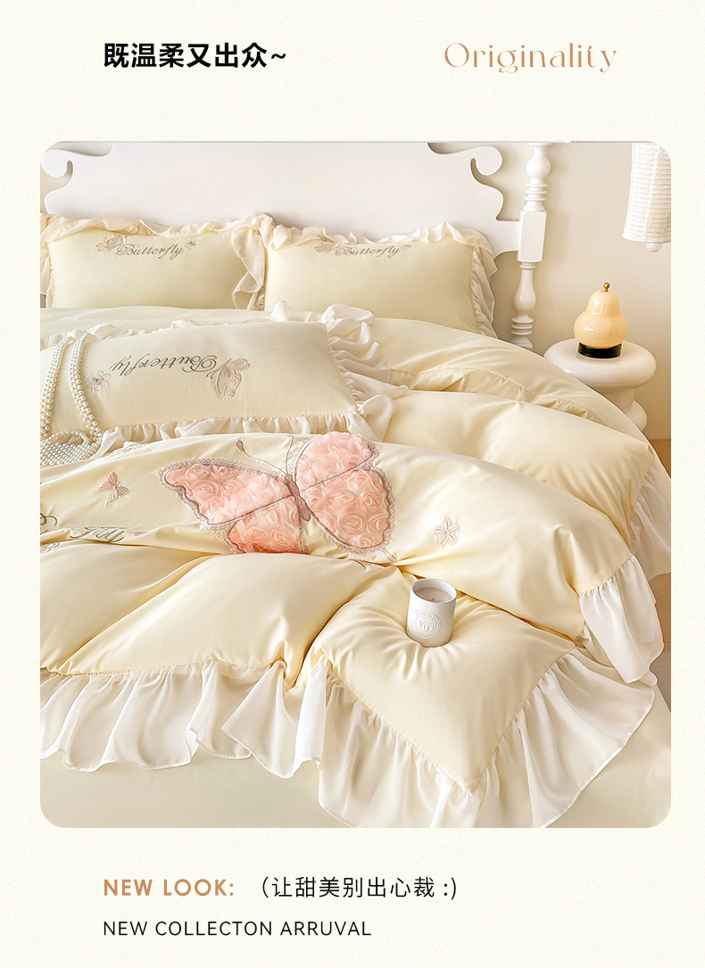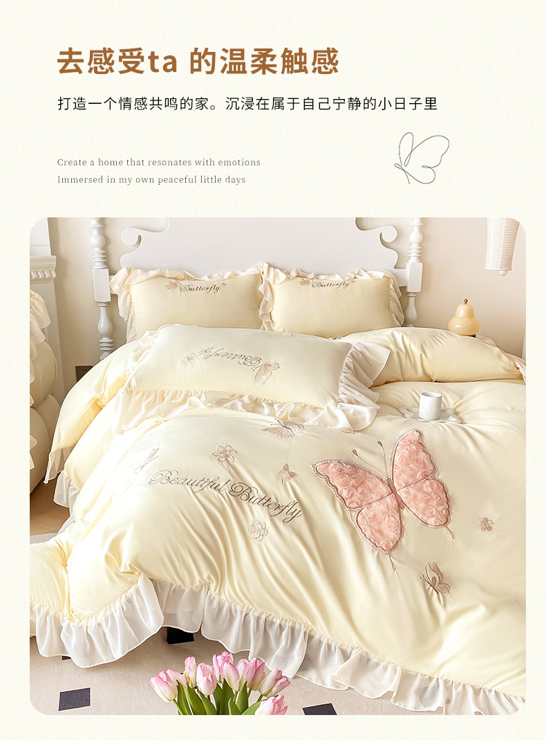 商品名称:富盛 2024新款水洗亲肤棉立体刺绣四件套公主风四件套-蝴蝶系列 蝴蝶-黄