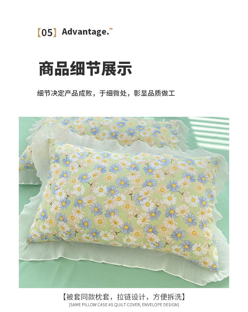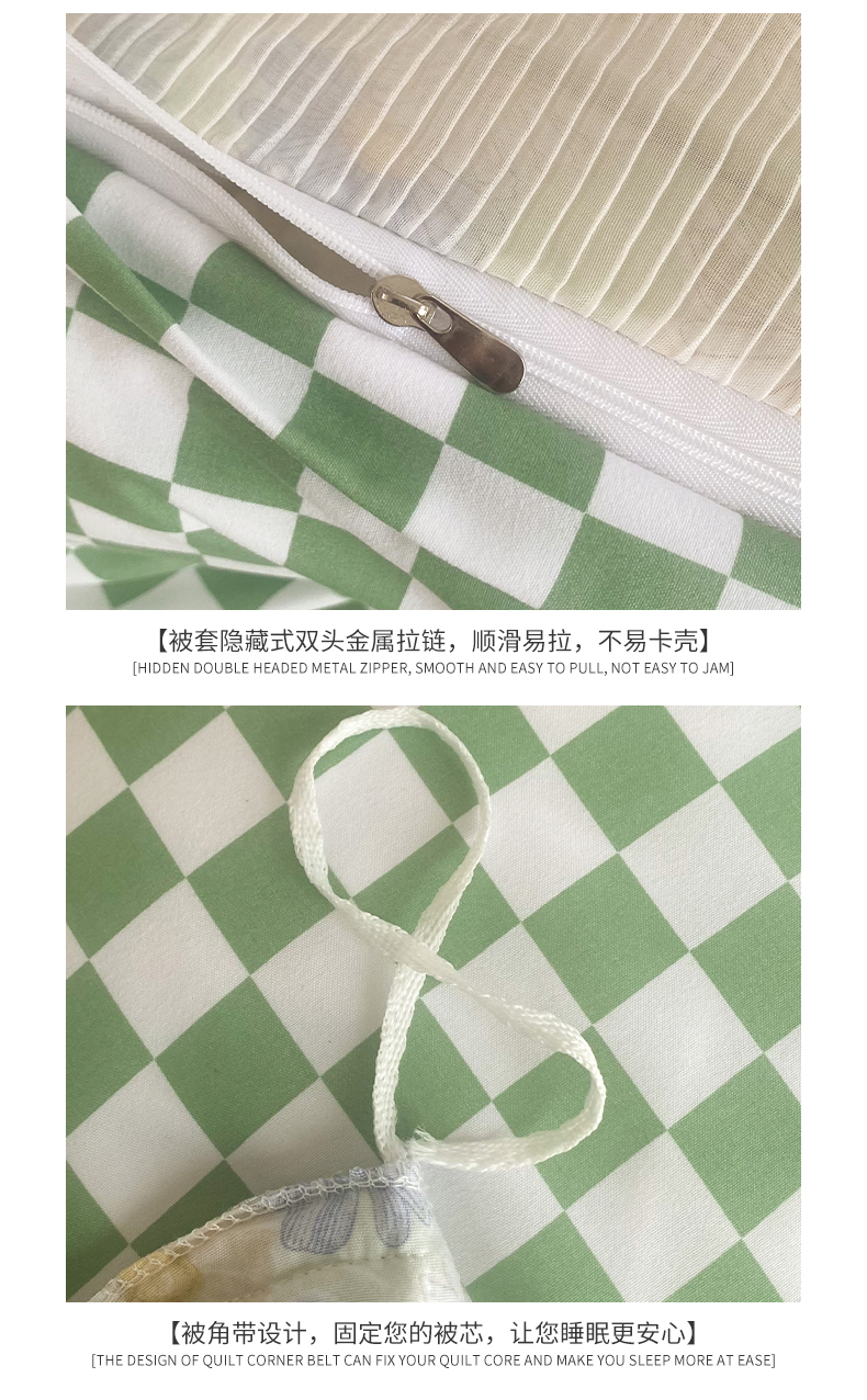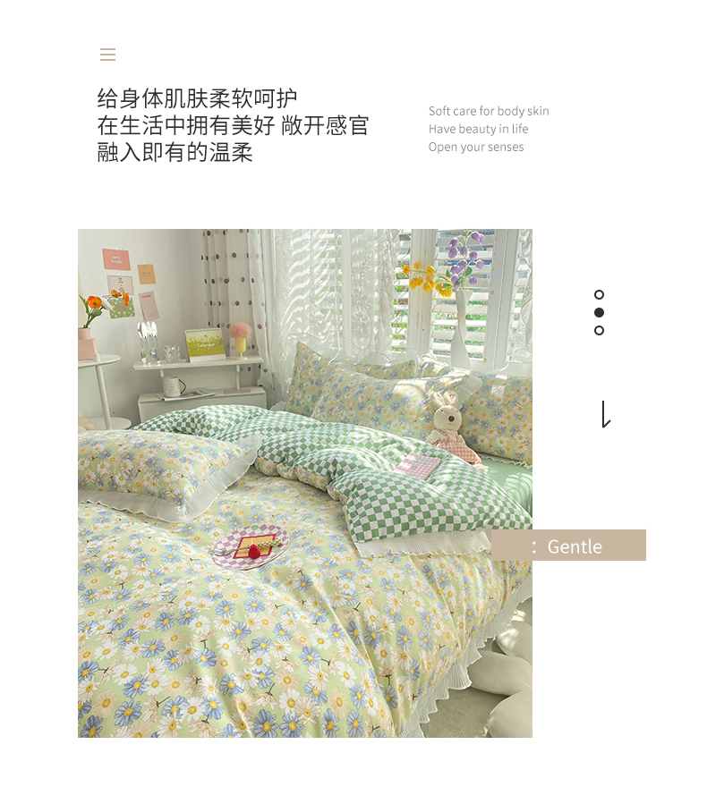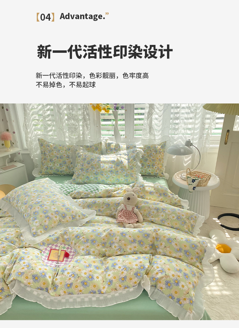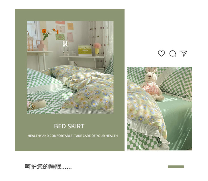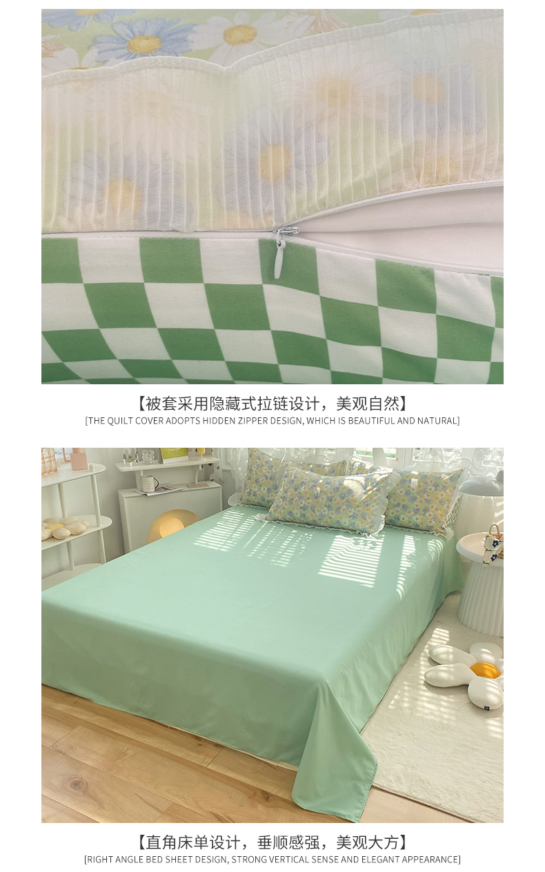 商品名称:大米家居2024韩版公主风小雏菊棋盘格雪纺花边海岛棉四件套 竹(绿色)